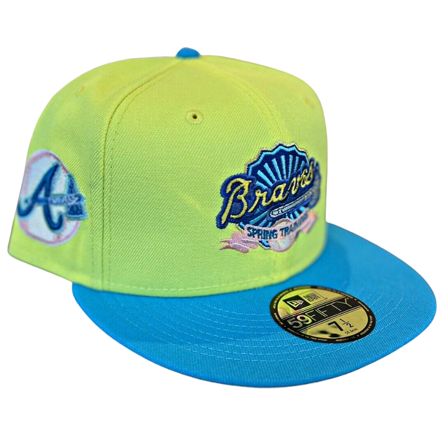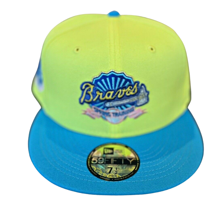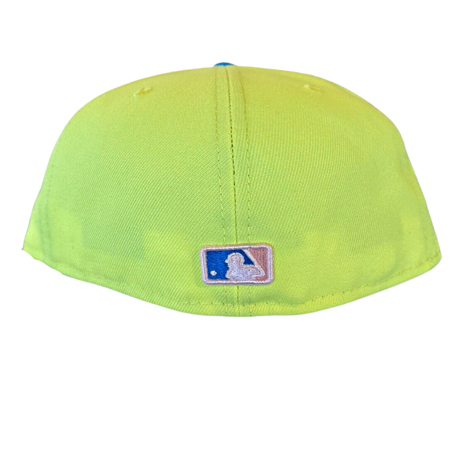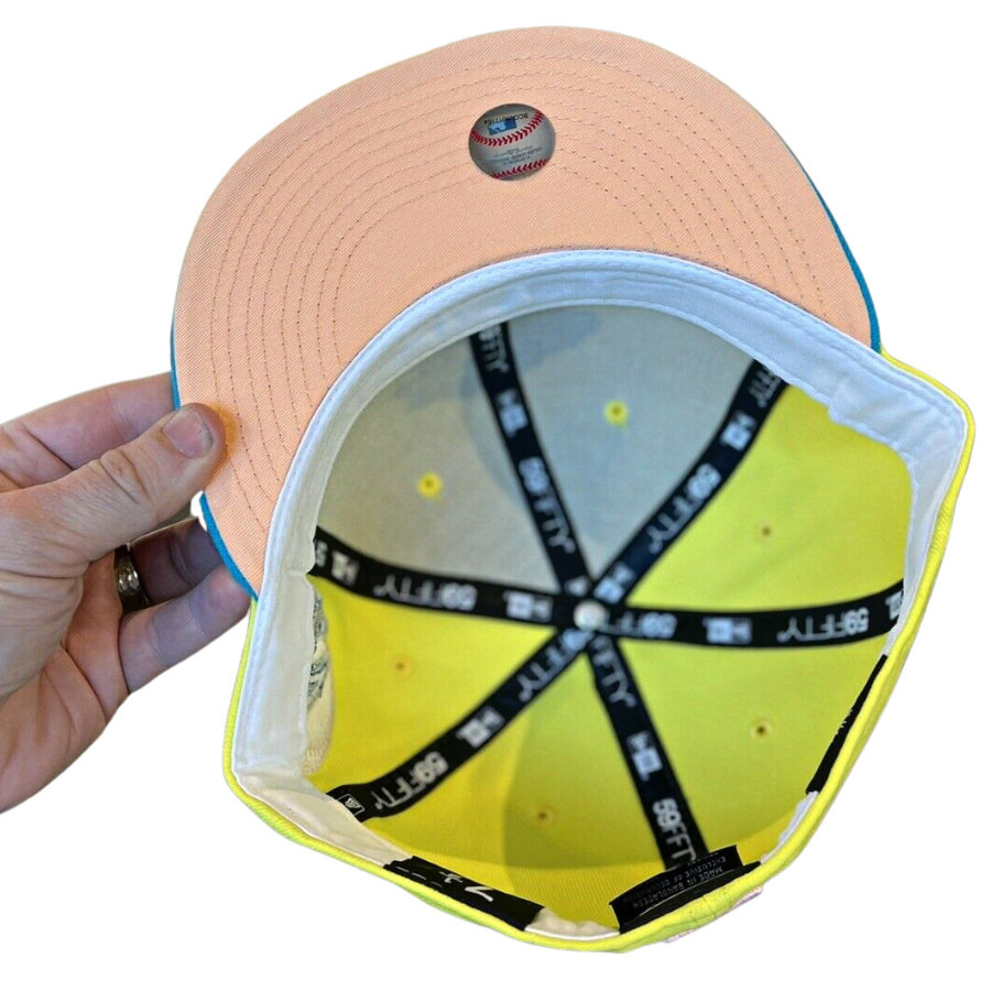 This New Era Atlanta Braves Roald Dahl "James and The Giant Peach" fitted hat is a My Fitteds exclusive drop. The 59FIFTY fitted cap features a yellow six panel structured high crown and embroidered eyelets with a calypso green fabric squatchee button and flat bill. The undervisor of the fitted is peach with a white sweatband. The front panel features the Atlanta Braves alternate logo embroidered in calypso green, yellow and peach threads. The right panel features a Braves logo side patch embroidery in the same colorway as the primary logo. This fitted cap colorway was inspired by Roald Dahl's childrens book James and The Giant Peach.