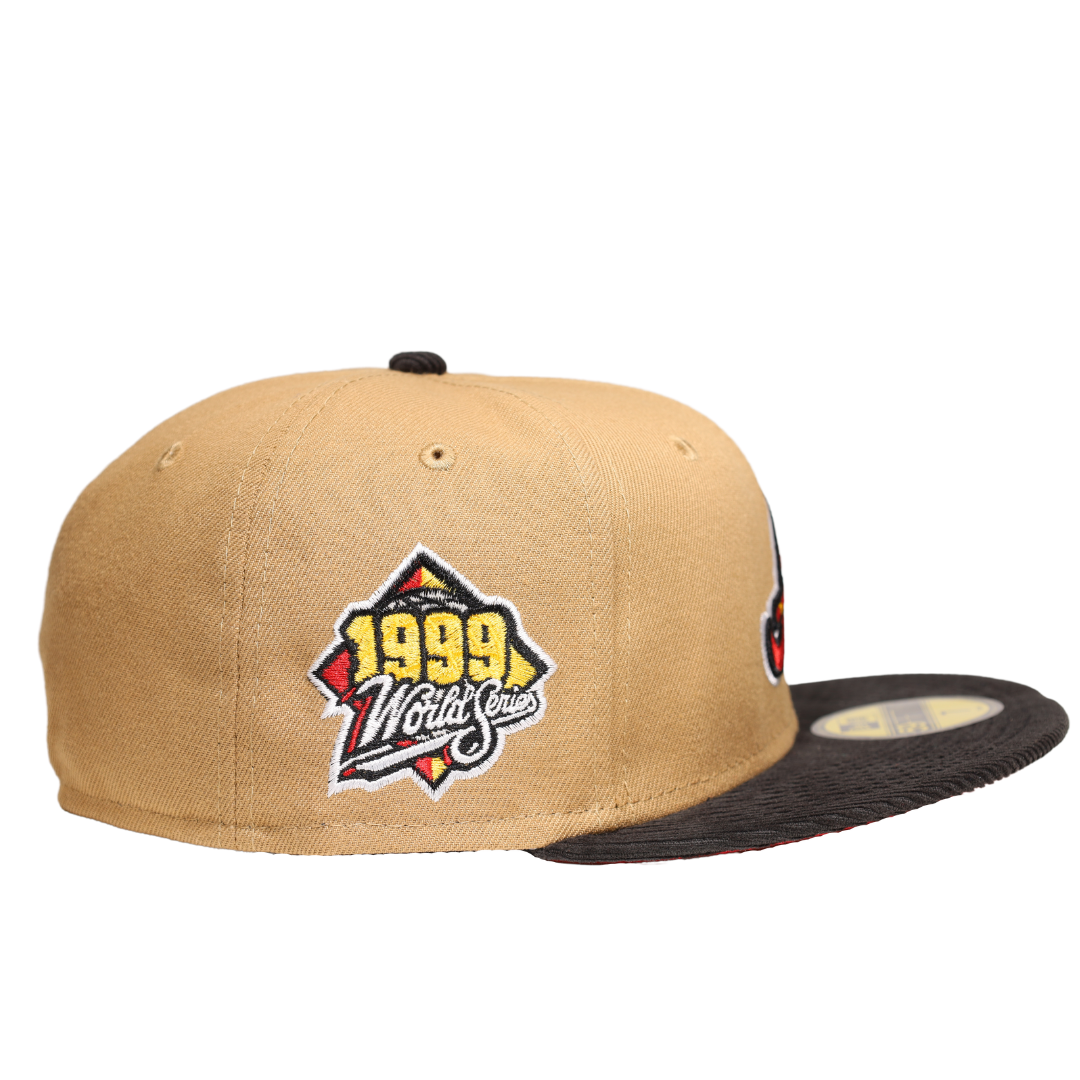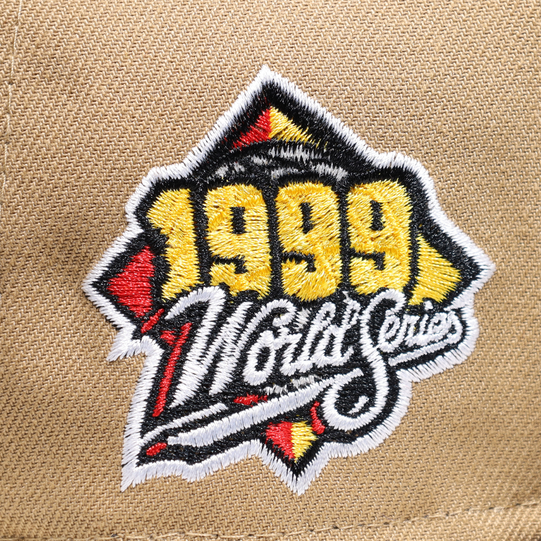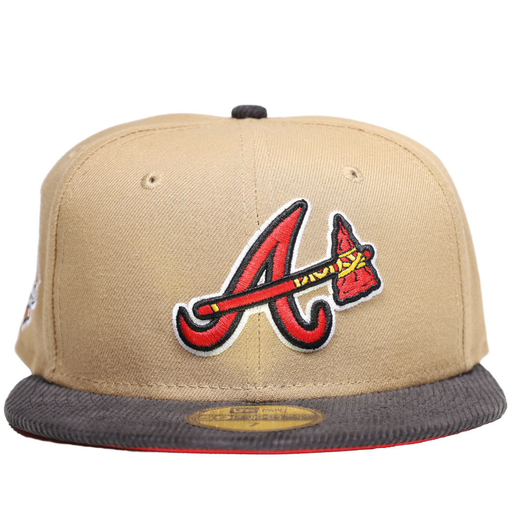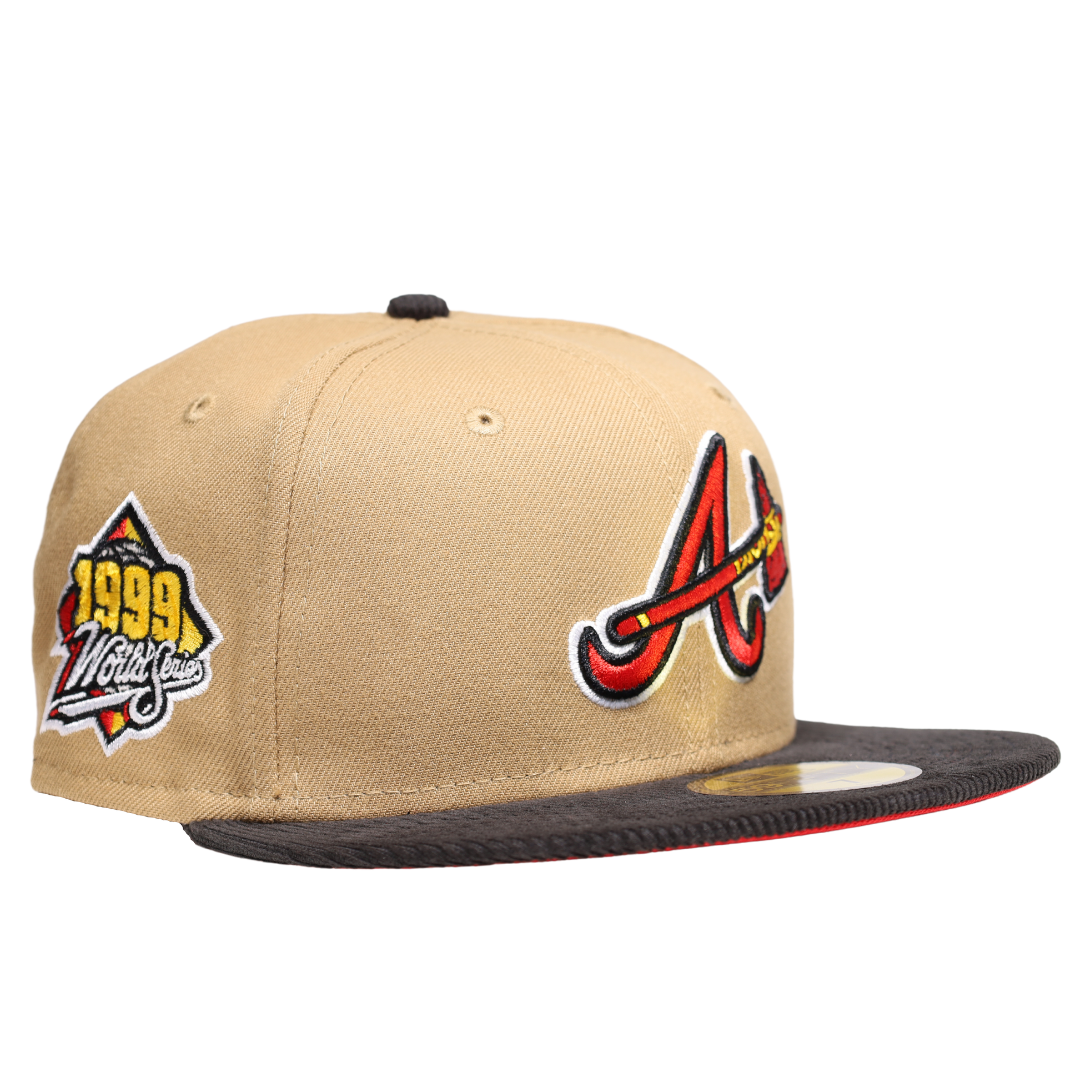 This New Era Atlanta Braves 1999 World Series 59FIFTY Fitted Hat has a six panel structured high crown and embroidered eyelets with a fabric squatchee button. The fitted cap has a flat bill with a sweatband. The front panel features the Atlanta Braves logo embroidery.