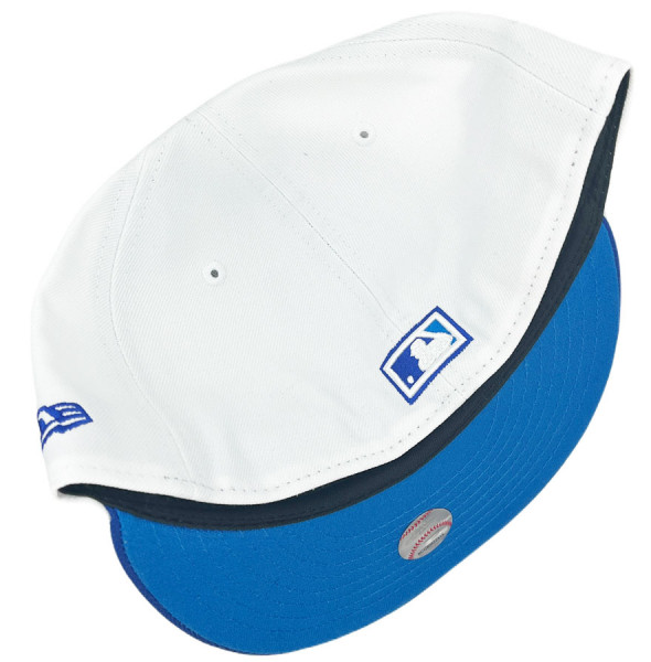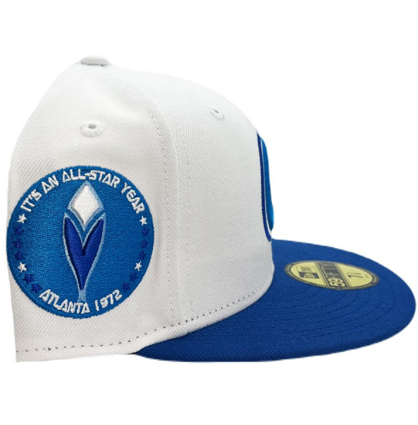 This New Era Atlanta Braves 59FIFTY fitted hat has a white six panel structured high crown, embroidered eyelets and fabric squatchee button. The fitted cap also has a white flat bill with a blue undervisor and black sweatband. The front panel features the Atlanta Braves logo embroidery and a 1972 All-Star Game side patch embroidery on the right panel. The rear crown of the fitted features the official MLB Batterman logo.
