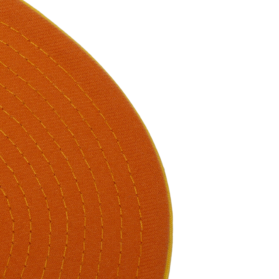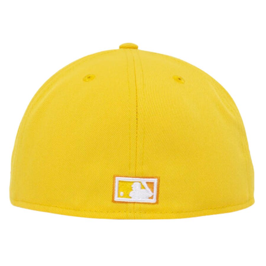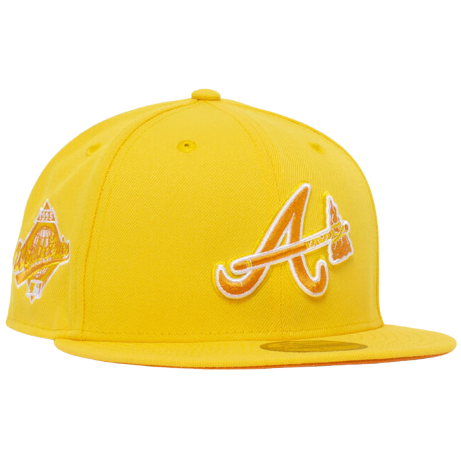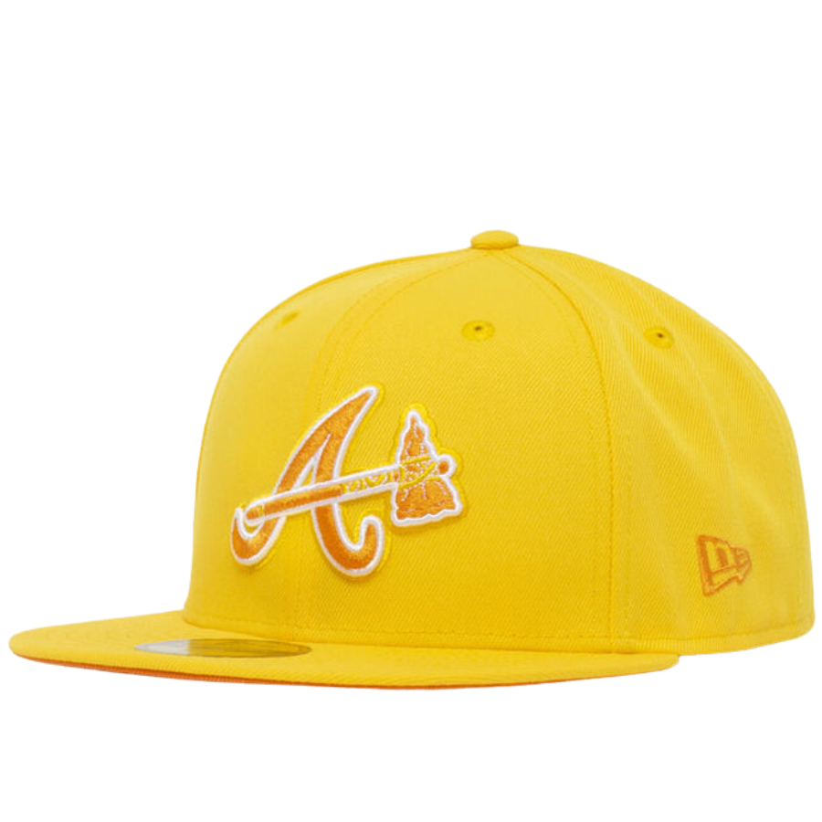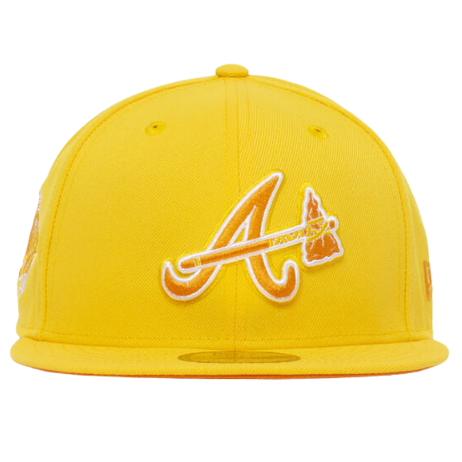 This New Era Atlanta Braves Yellow "Brunch Pack" 59FIFTY Fitted Hat has a yellow six panel structured high crown and embroidered eyelets with a yellow fabric squatchee button. The fitted cap has a yellow flat bill with a orange undervisor. The front panel features the Atlanta Braves logo embroidery and a World Series side patch embroidery on the right panel. The left panel of the fitted displays the New Era logo and the official MLB logo embroidery on the rear crown.