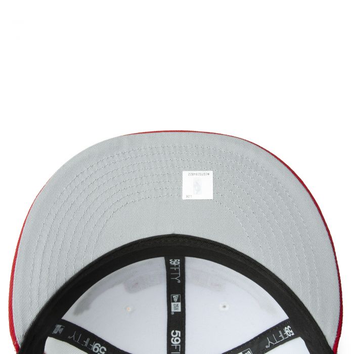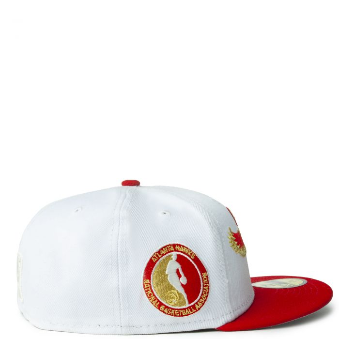 This New Era Atlanta Hawks White/Red/Gold 59FIFTY Fitted Hat was released by Karma Loop. The fitted has a white six panel structured high crown and embroidered eyelets with a red fabric squatchee button. The fitted cap also has a red flat bill with a grey undervisor and black sweatband. The front panel features the Atlanta Hawks logo embroidery and a side patch embroidery on the right panel. The left panel of the fitted displays the New Era logo and the official NBA logo embroidery on the rear crown.