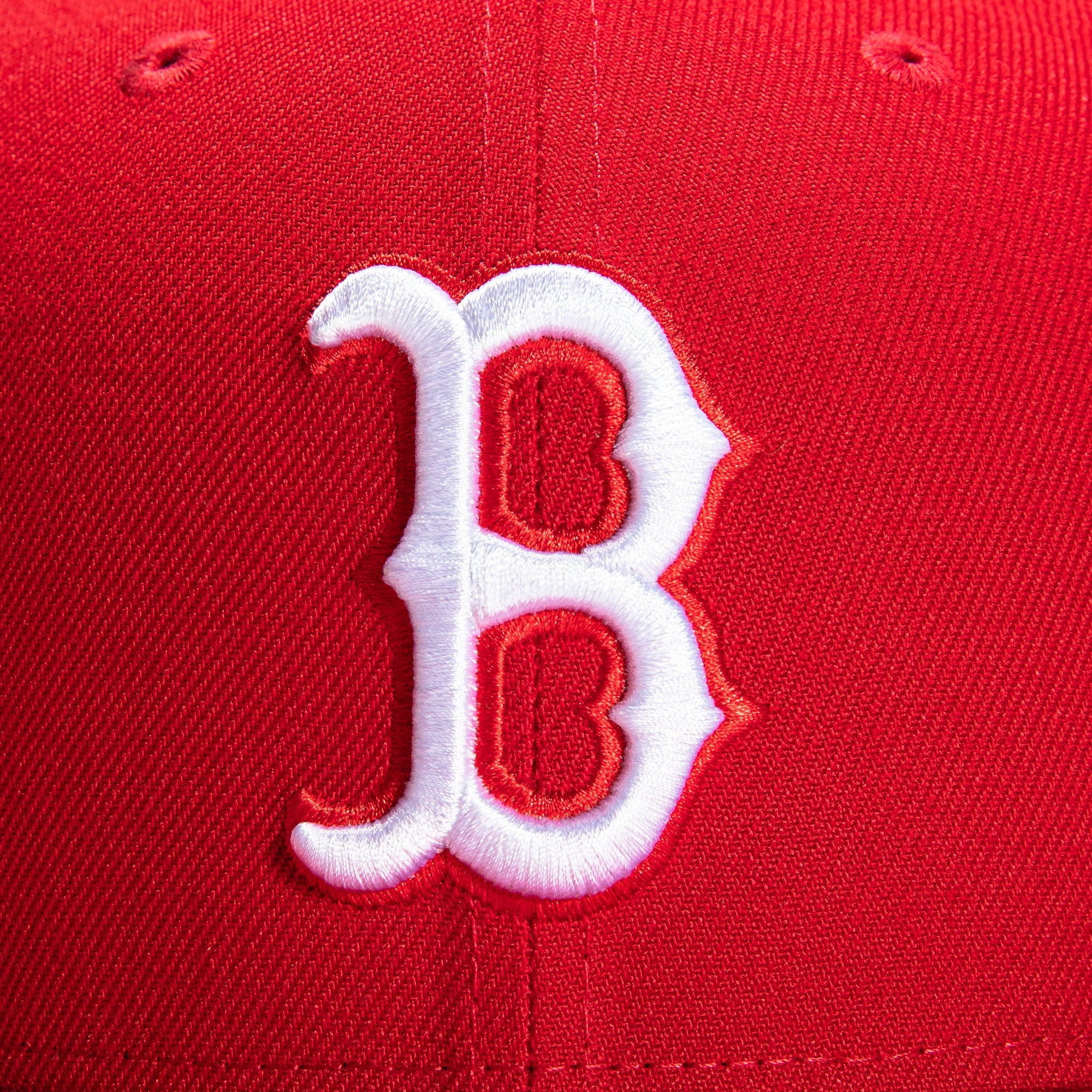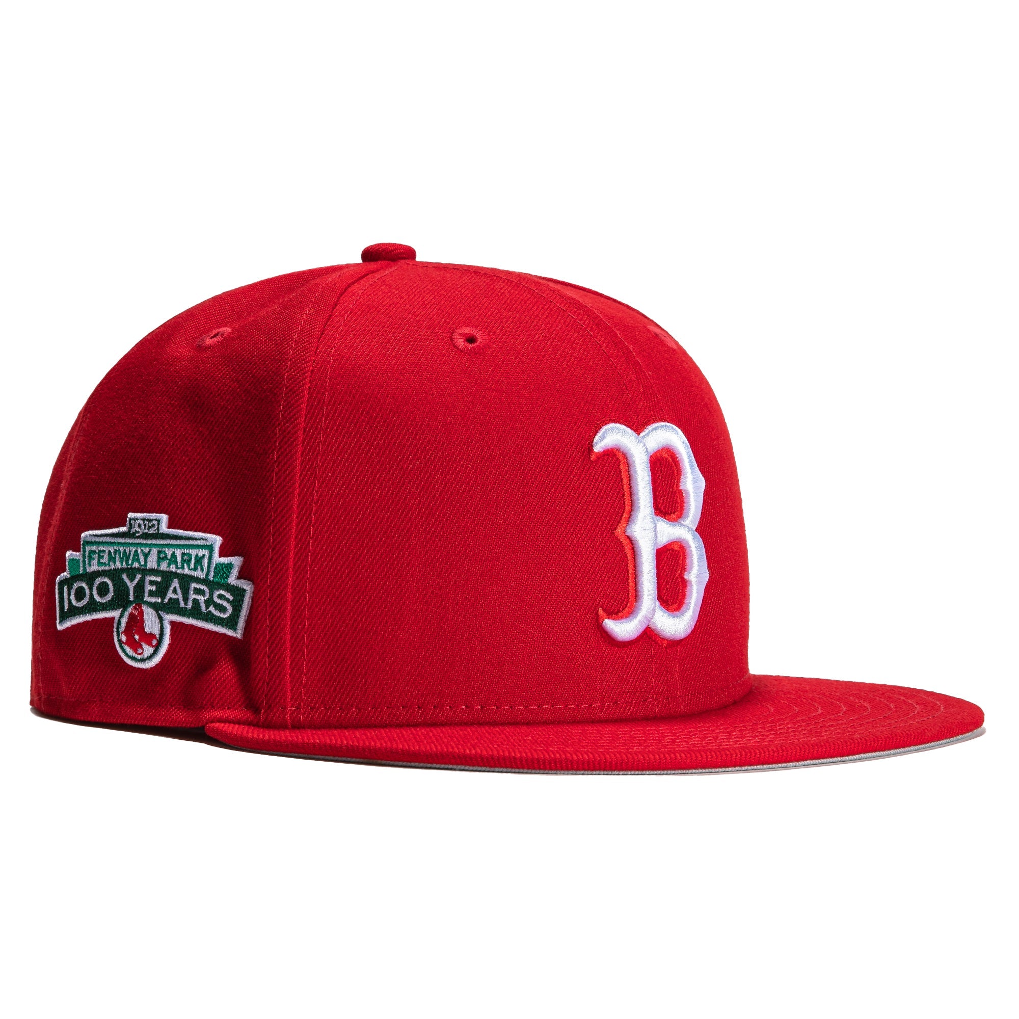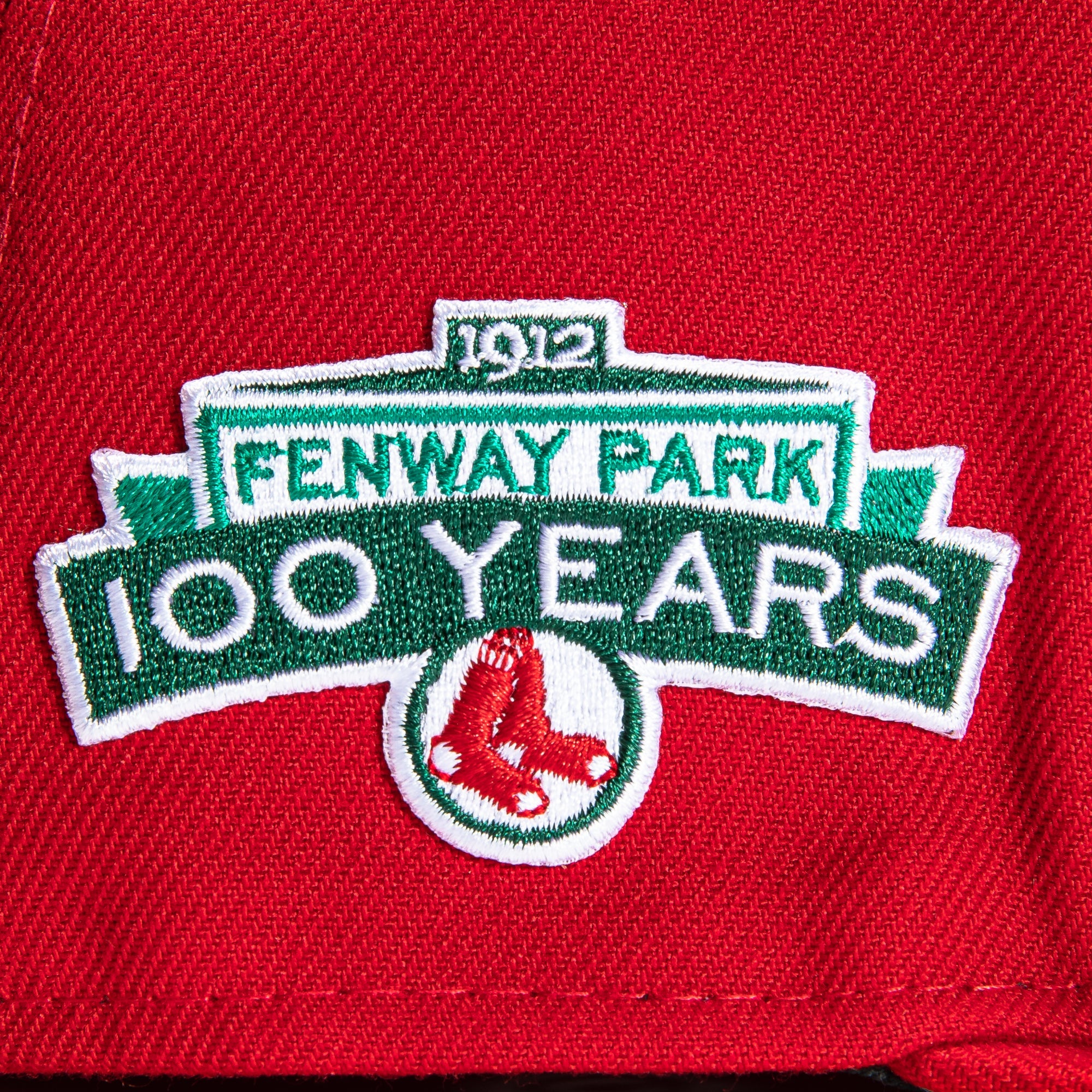 This New Era Boston Red Sox 100 Years 59FIFTY Fitted Hat was released by Hat Club. The fitted has a red six panel structured high crown, embroidered eyelets with and fabric squatchee button. The fitted also has a red flat bill with an "icy" (light blue) undervisor. The front panel features the Boston Red Sox logo embroidery and a side patch embroidery on the right panel. The left panel of the fitted displays the New Era logo and the official MLB logo embroidery on the rear crown.