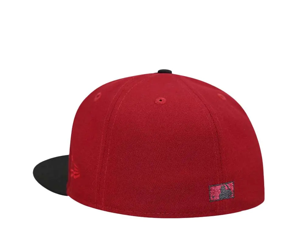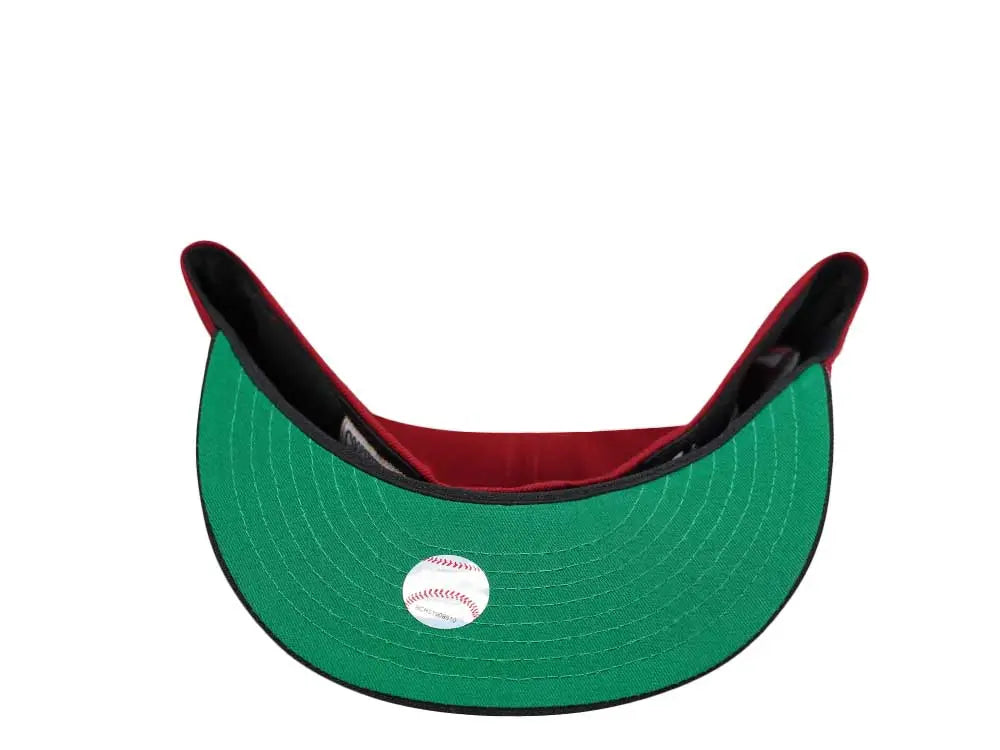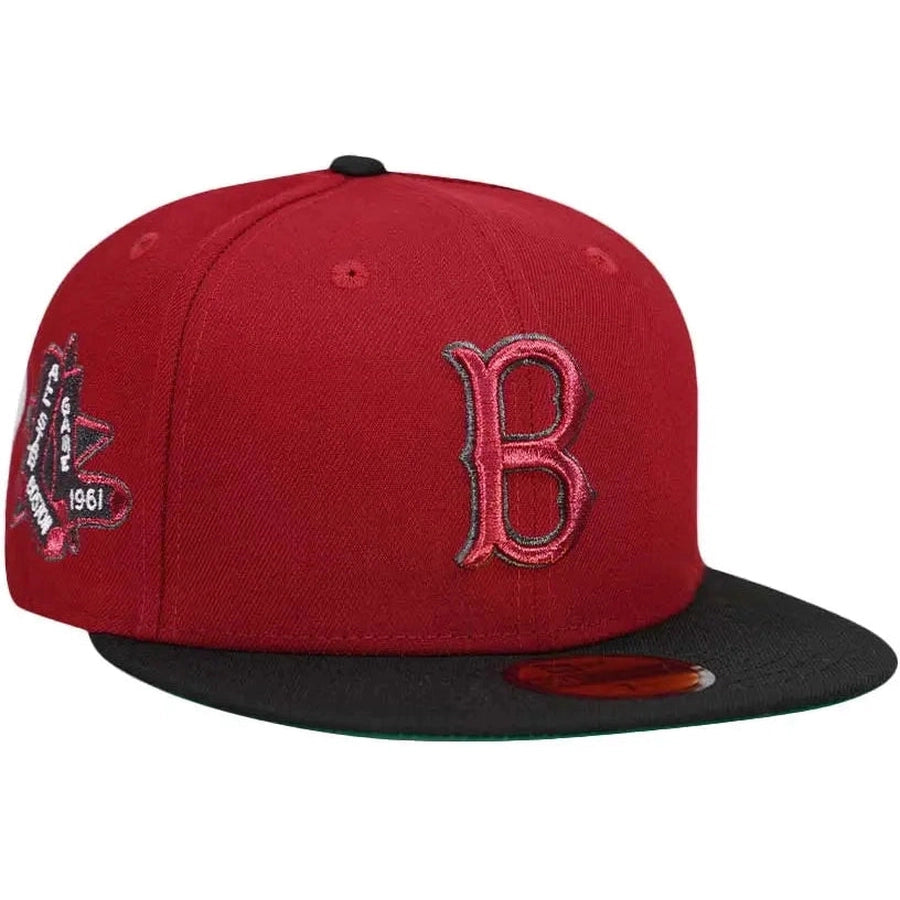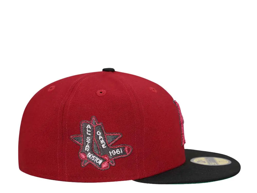This New Era 59FIFTY Boston Red Sox fitted hat was released by Topperz Store. The fitted has a cardinal red/burgundy six panel structured high crown and embroidered eyelets with a black fabric squatchee button and flat bill. The fitted has a green bottom undervisor with a black sweatband. The front panel features the Boston Red Sox logo embroidered in metallic threads with a 1961 All-Star Game side patch on the right panel.