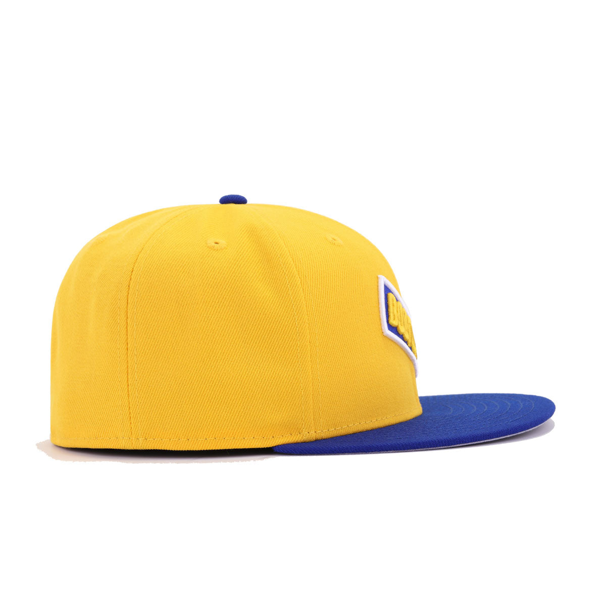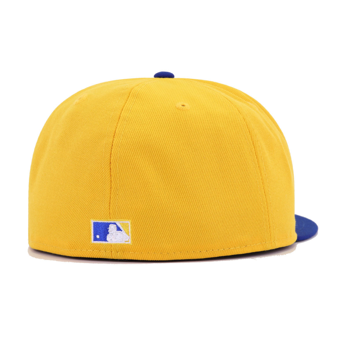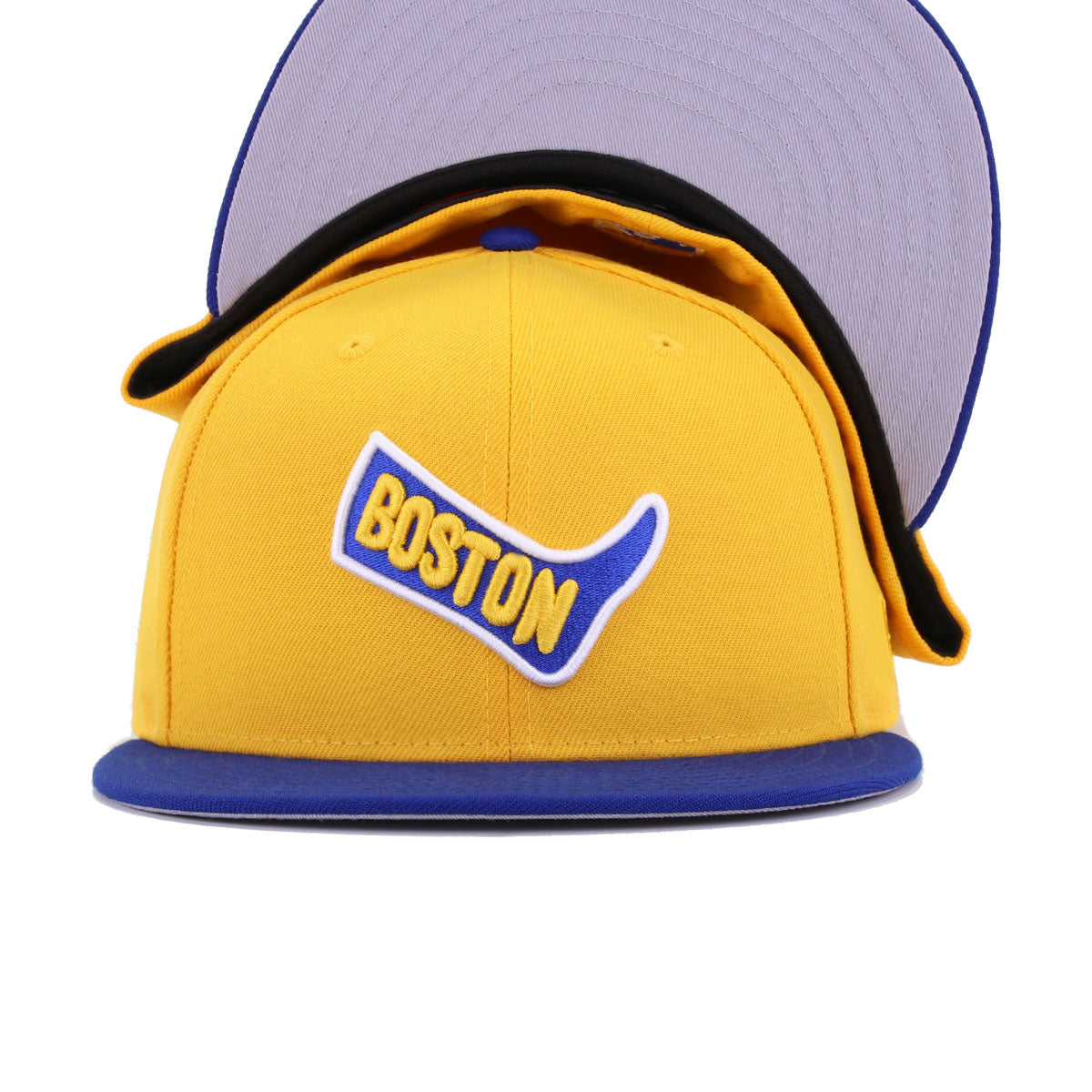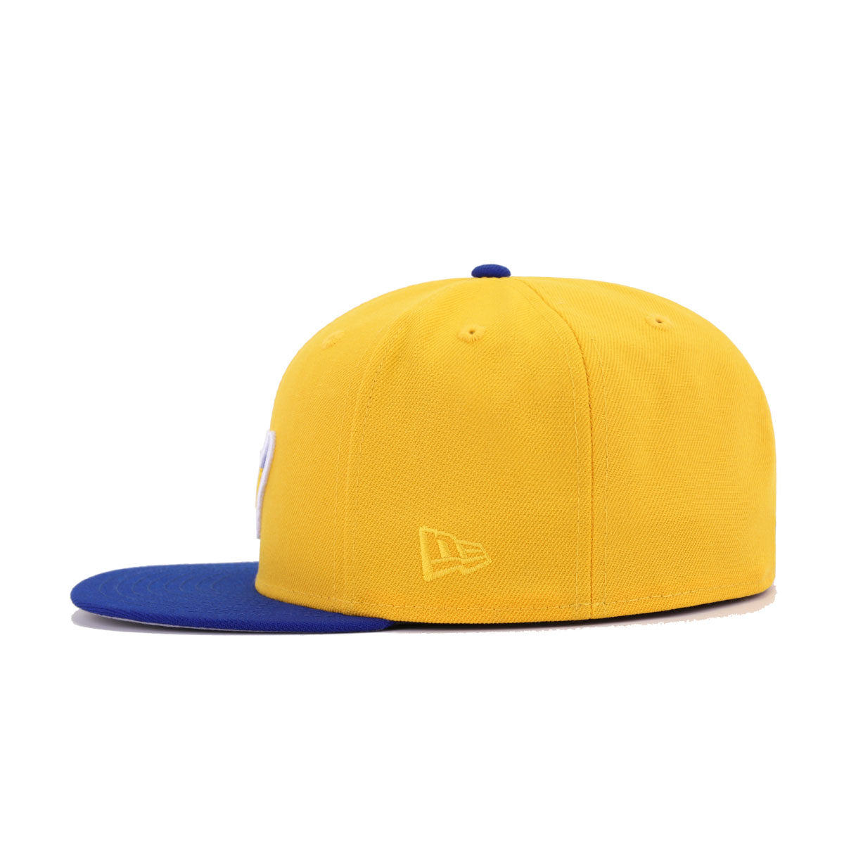This New Era Boston Red Sox A's Gold Light Royal Blue 59FIFTY Fitted Hat has a yellow six panel structured high crown and embroidered eyelets with a yellow fabric squatchee button. The fitted cap has a blue flat bill with a grey undervisor and black sweatband. The front panel features the Boston Red Sox logo embroidery. The left panel of the fitted displays the New Era logo and the official MLB logo embroidery on the rear crown.