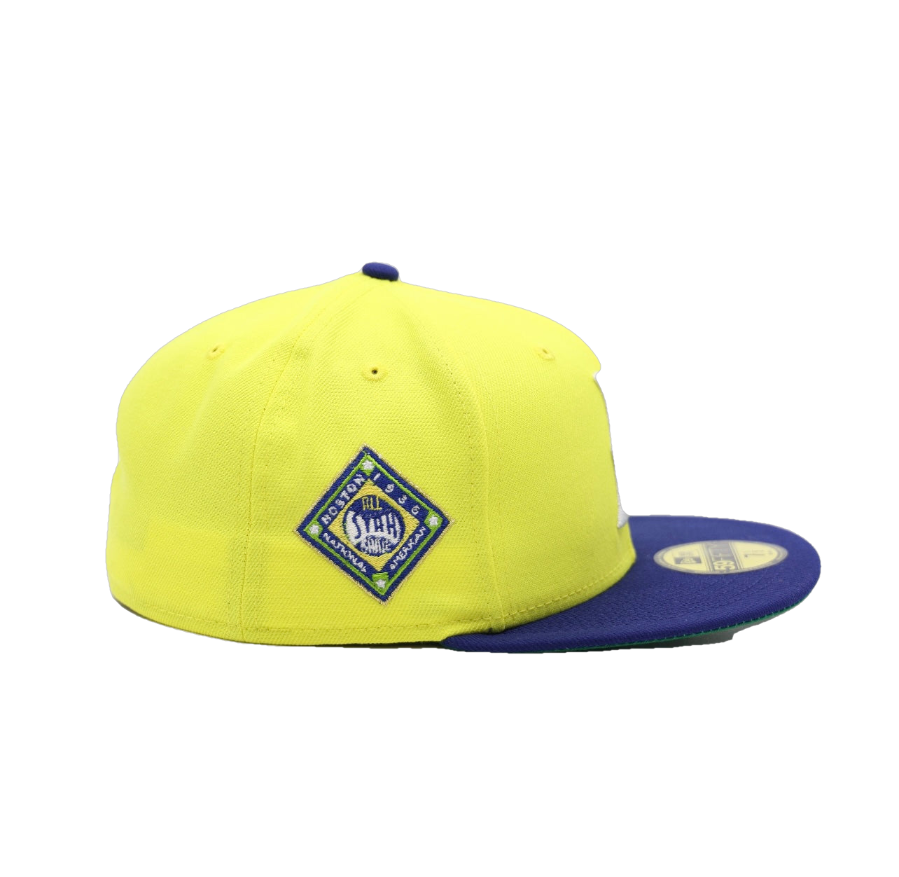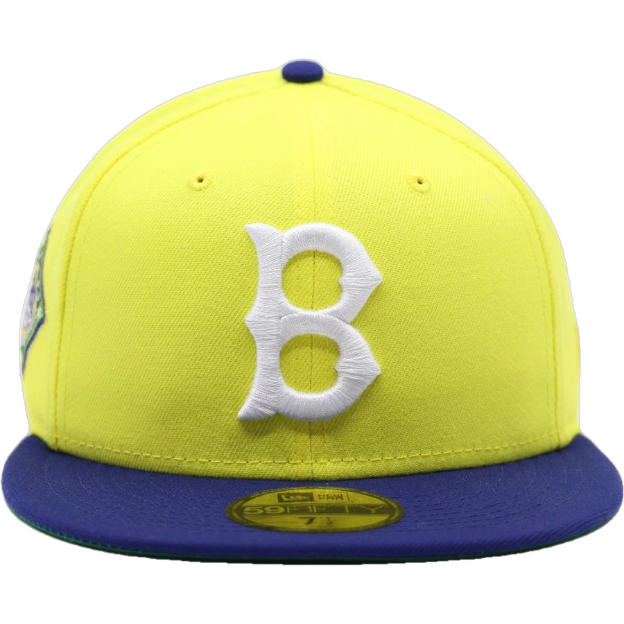 This New Era Boston Red Sox "Brazil" 1936 All-Star Game 59FIFTY Fitted Hat was released by All The Right. The fitted has a yellow six panel structured high crown, yellow embroidered eyelets and a royal blue flat bill. The front panel features the Boston Red Sox logo embroidery and a 1936 ASG side patch embroidered on the right panel. The left panel of the fitted displays the New Era logo and the official MLB logo embroidery on the rear crown.