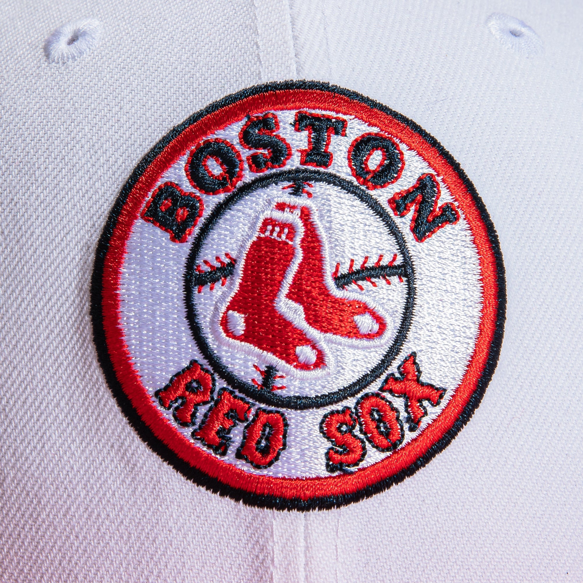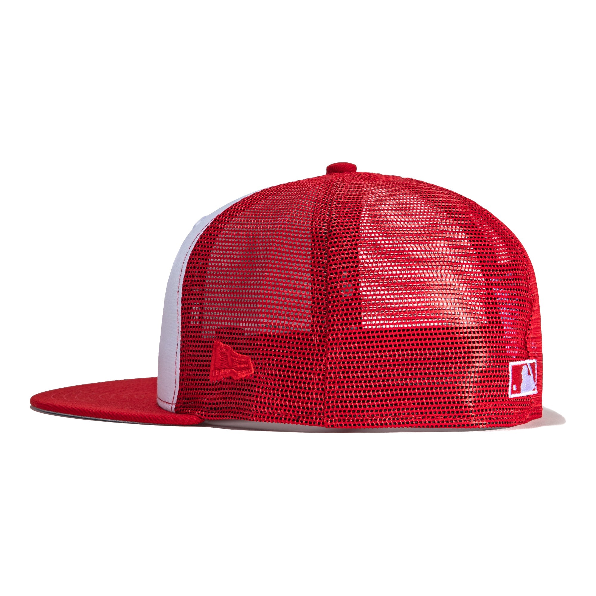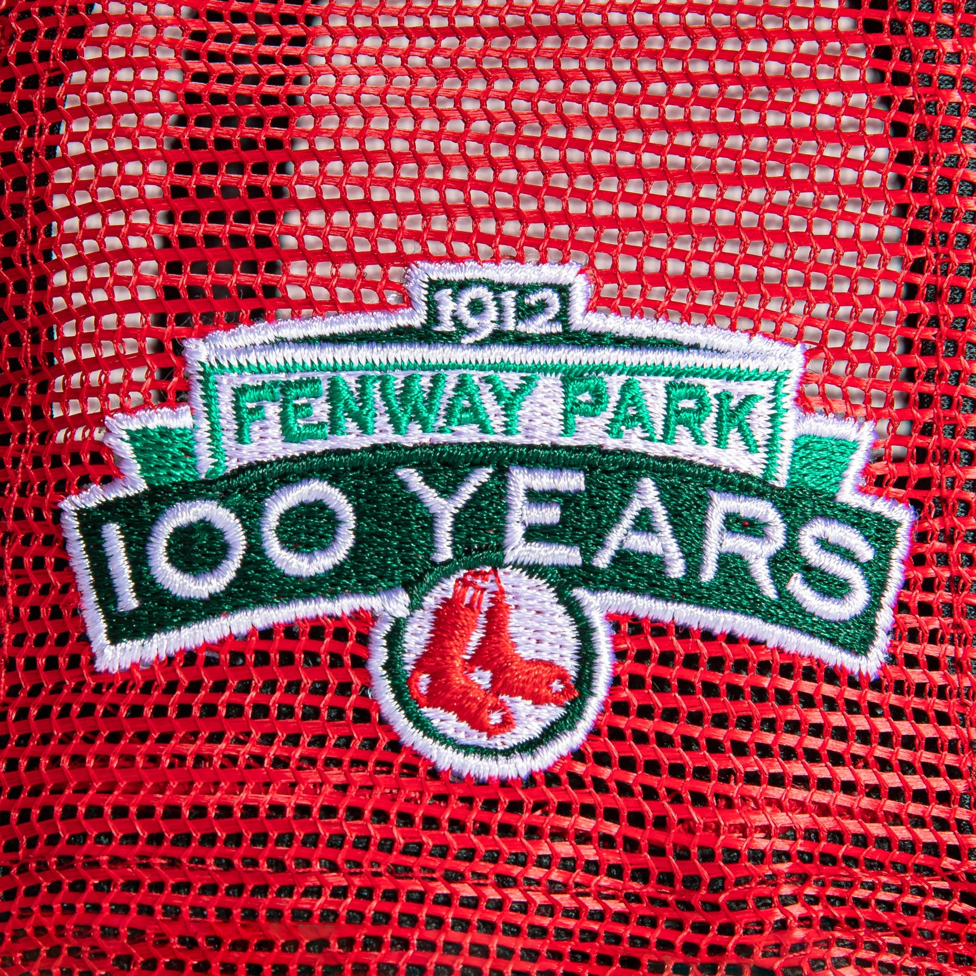 This New Era Boston Red Sox Fenway Logo Trucker Rail 2022 59FIFTY Fitted Hat is a Hat Club exclusive. The fitte has a split white and red six panel structured high crown and embroidered eyelets with a red fabric squatchee button. The fitted cap also has a red flat bill with a grey undervisor. The front panel features the Boston Red Sox logo embroidery and a 100 Years side patch embroidery on the right panel. The left panel of the fitted displays the New Era logo and the official MLB logo embroidery on the rear crown.