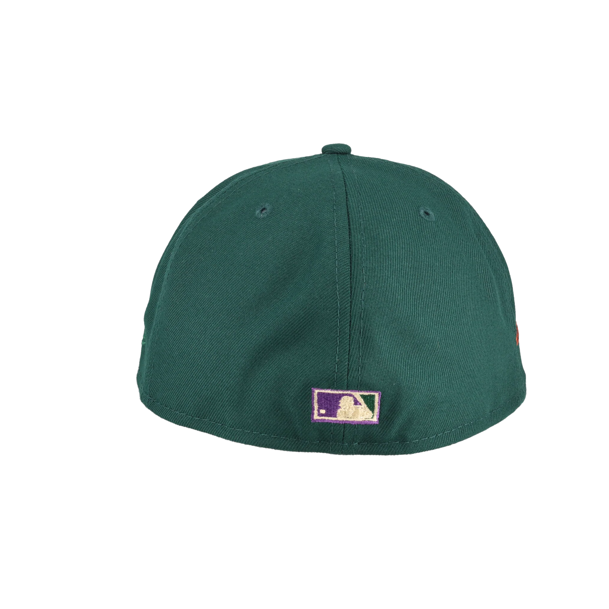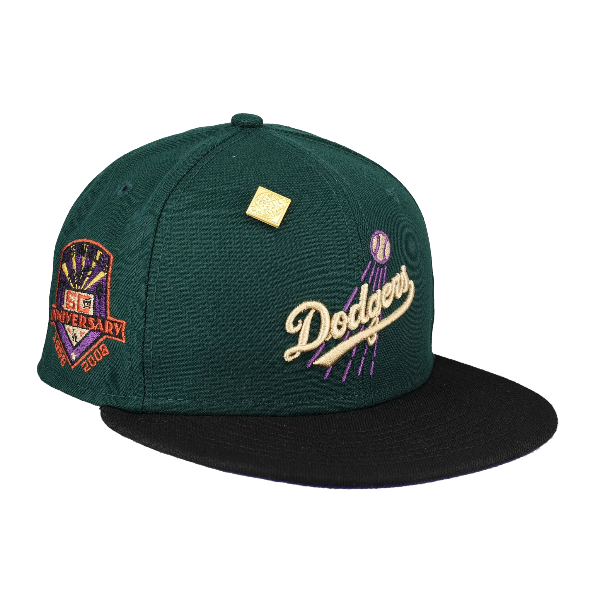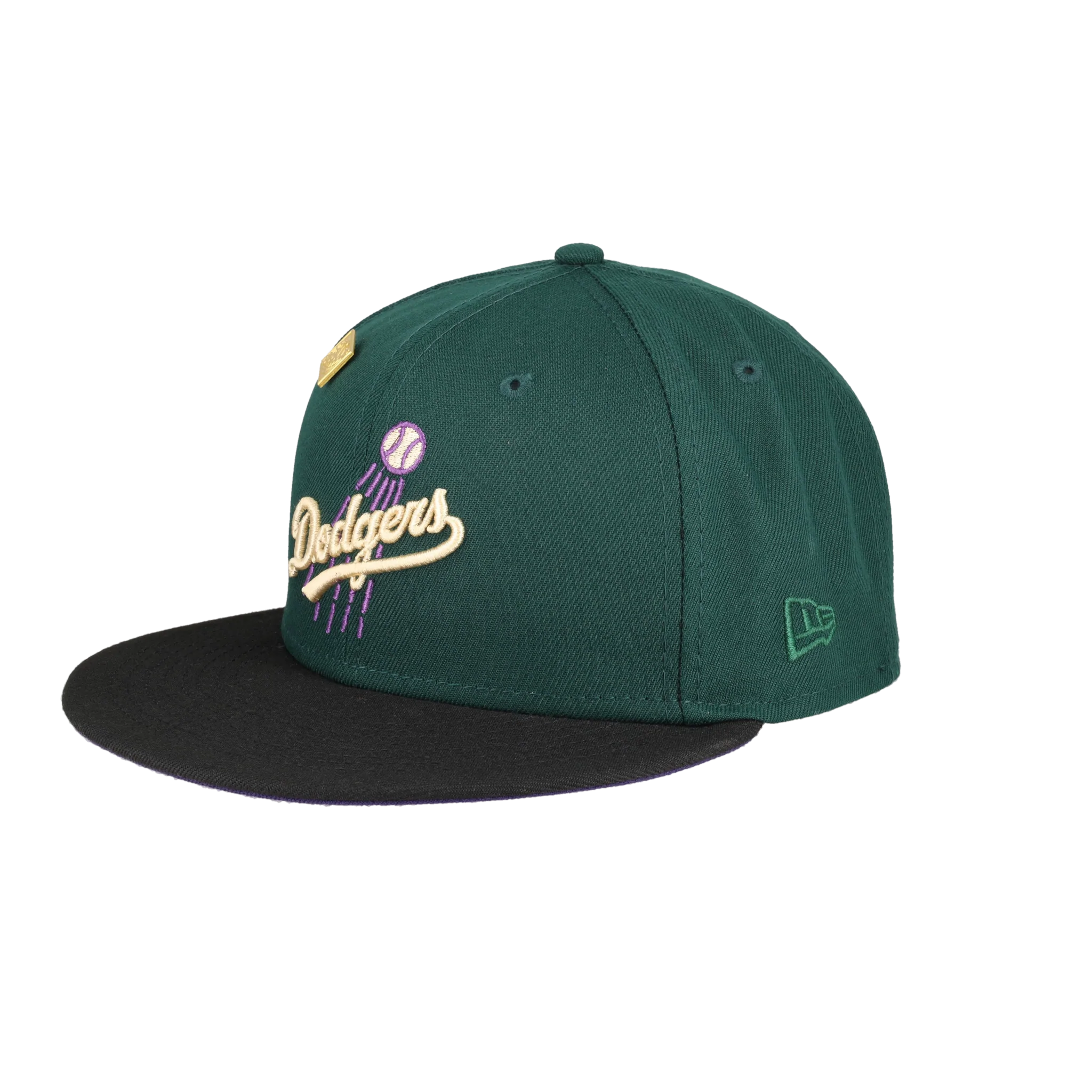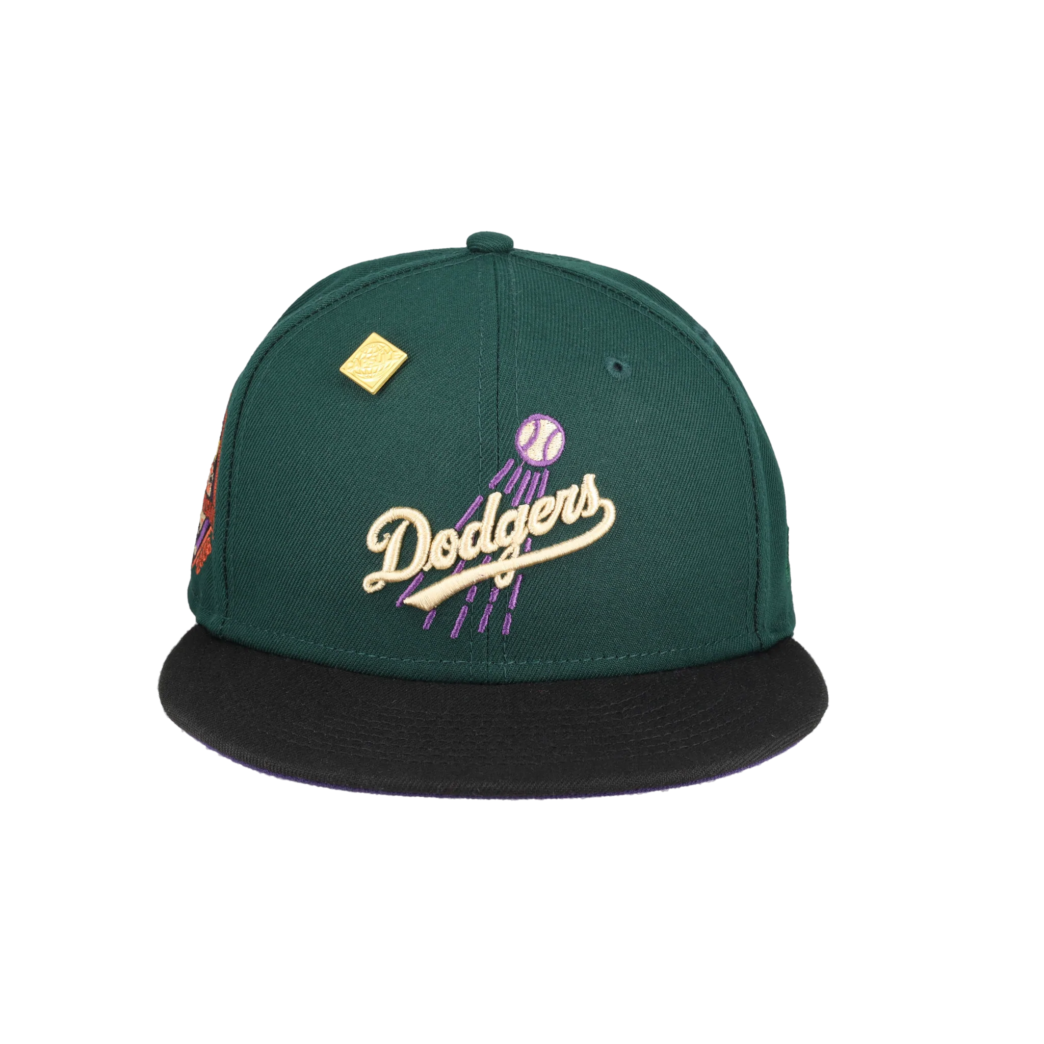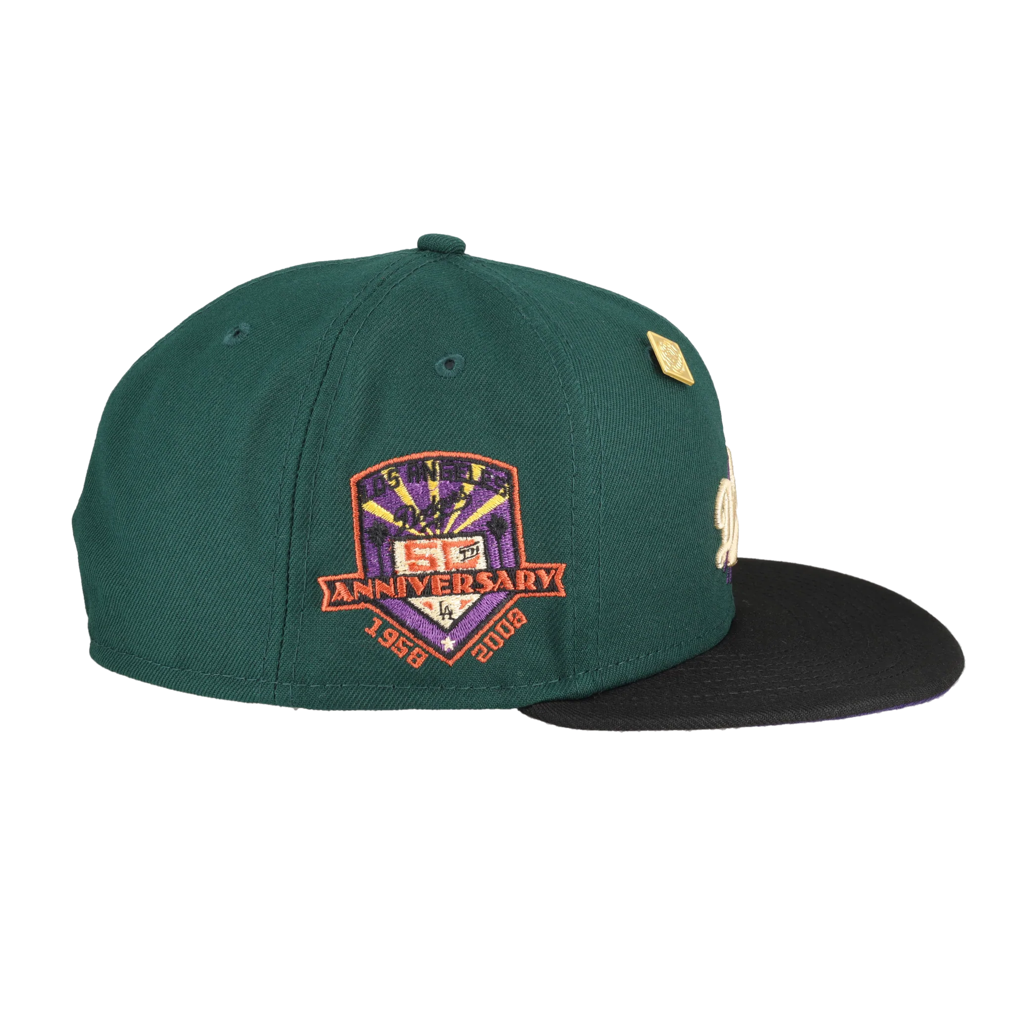 This New Era Brooklyn Dodgers Green Bark Collection 50th Anniversary 59FIFTY Fitted Hat was released by Capsule. The fitted has a dark green six panel structured high crown, embroidered eyelets and fabric squatchee button. The flat bill of the fitted cap is also black with a purple bottom undervisor and black sweatband. The front panel features the Brooklyn Dodgers logo embroidery and a side patch embroidered on the right panel. The left panel of the fitted displays the New Era logo and the official MLB logo insignia embroidered on the rear crown.