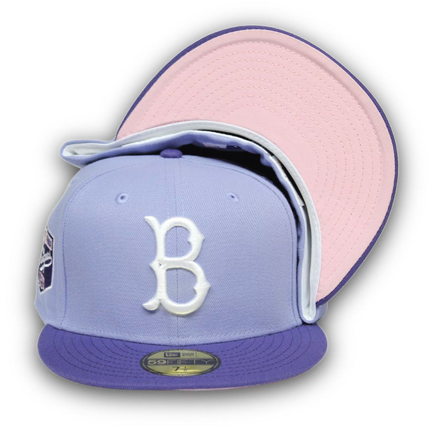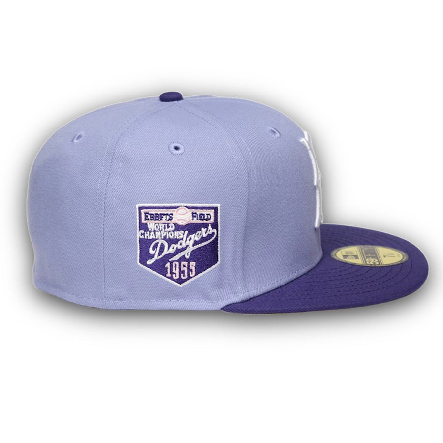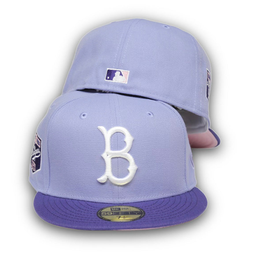 This New Era Brooklyn Dodgers 59FIFTY fitted hat has a lavender six panel structured high crown and embroidered eyelets with a purple fabric squatchee button and flat bill. The undervisor of the fitted is soft pink with a white sweatband. The front panel includes the Brooklyn dodgers logo embroidery and a 1955 World Champions side patch on the right panel.