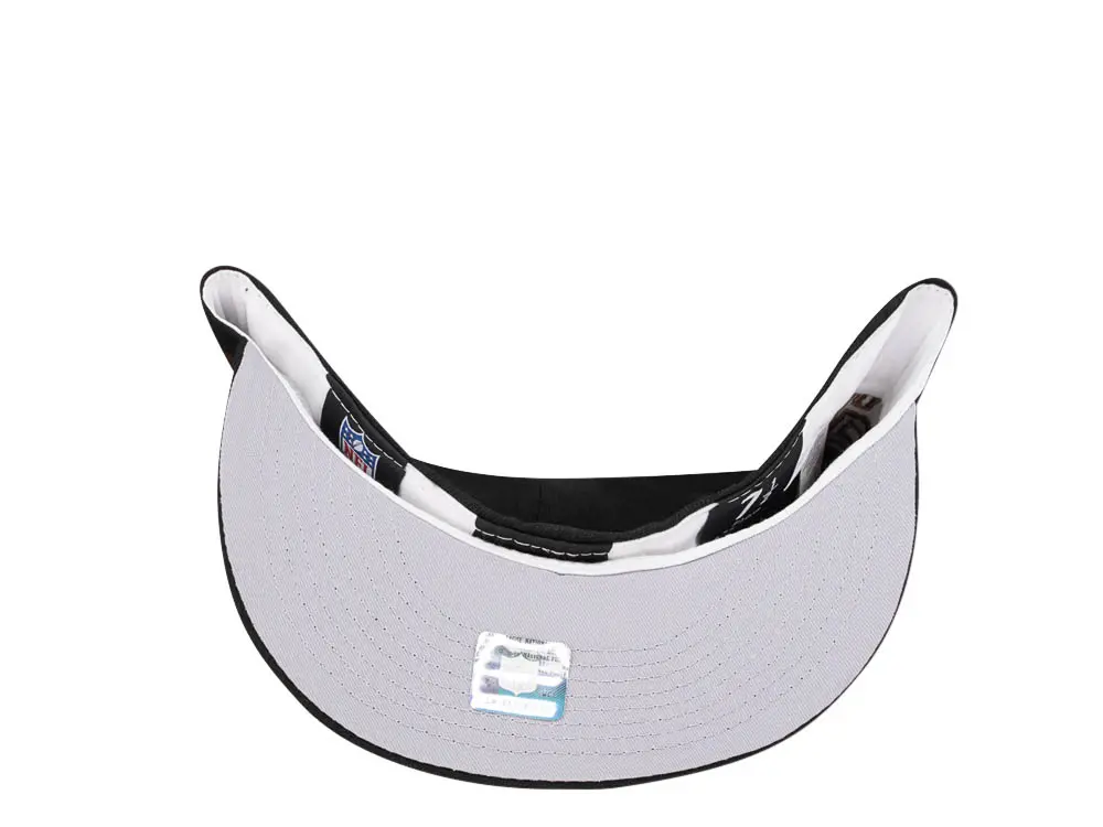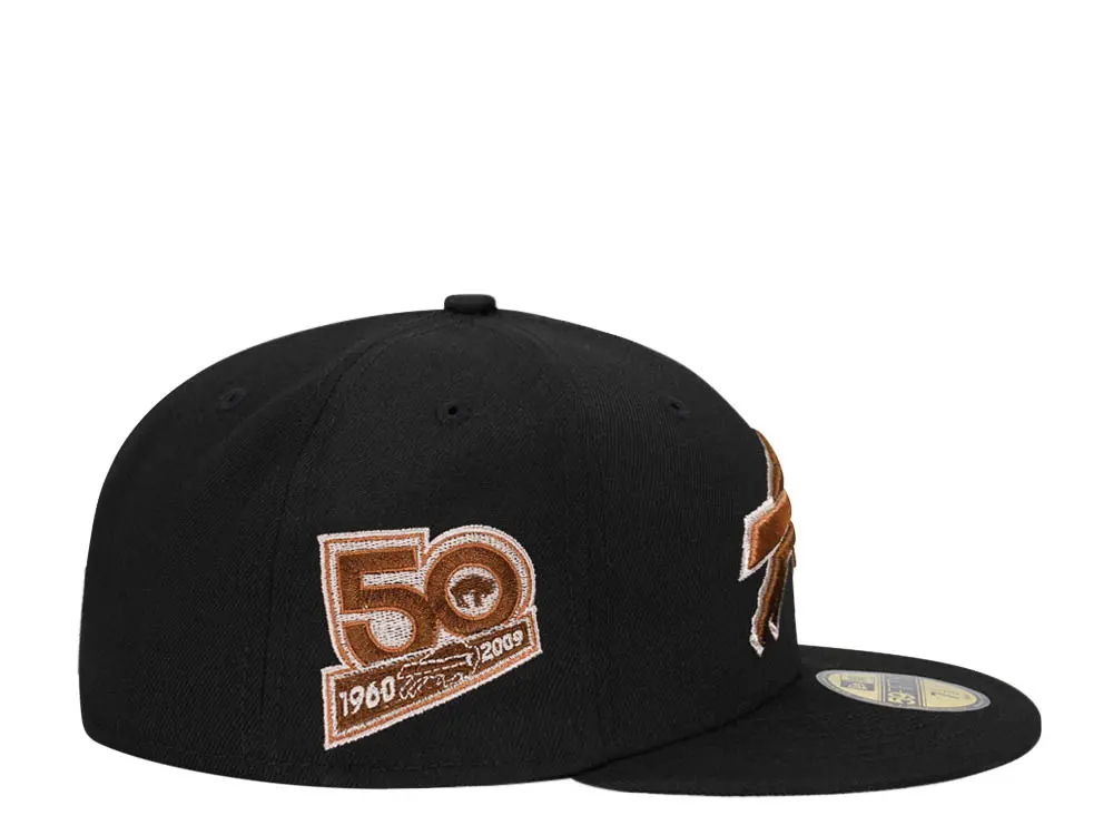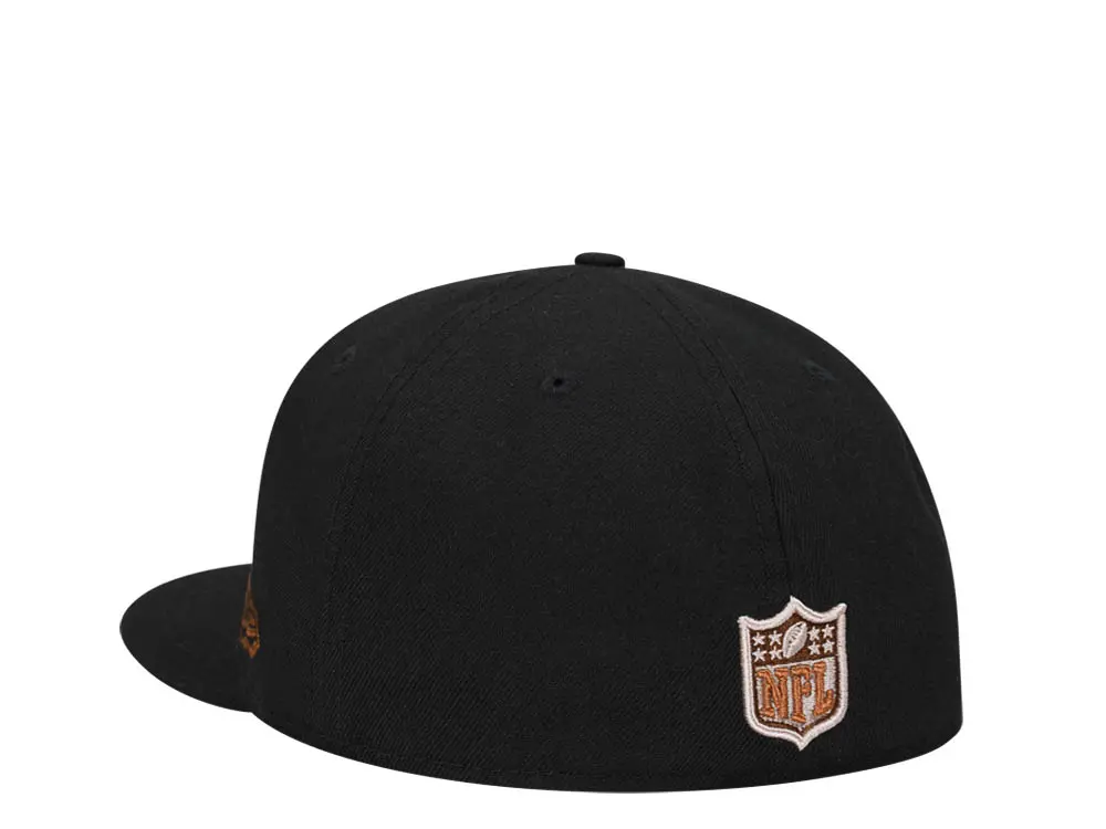 This New Era Buffalo Bills 50th Anniversary Black/Brown 59FIFTY Fitted Hat has a black six panel structured high crown and embroidered eyelets with a black fabric squatchee button. The fitted cap also has a black flat bill with a grey undervisor and white sweatband. The front panel features the Buffalo Bills logo embroidery and a 50th Anniversary side patch on the right panel. The left panel of the fitted displays the New Era logo and the official NFL shield logo embroidery on the rear crown.