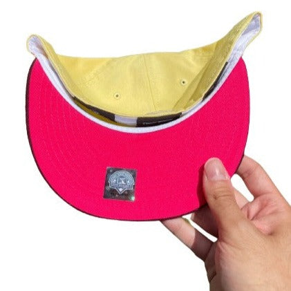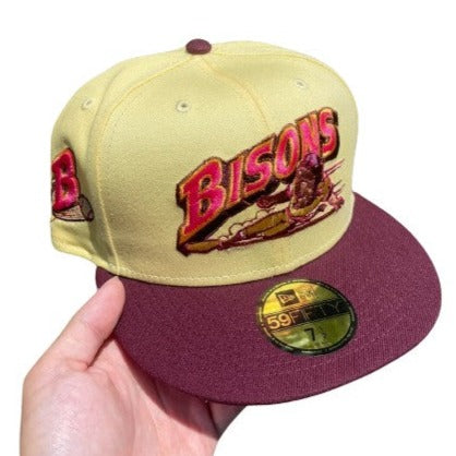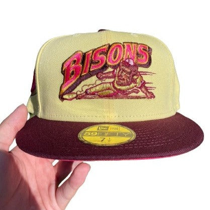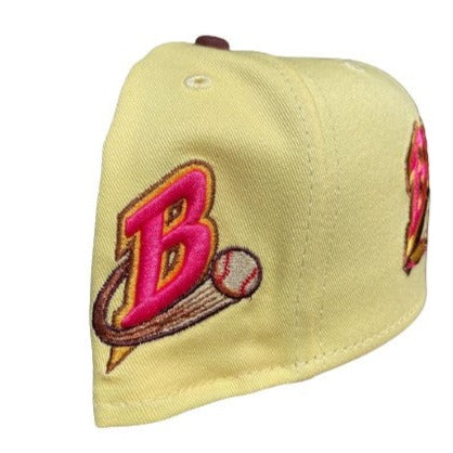 This New Era Buffalo Bison 'Peck Peck Chicken' Inspired 59FIFTY Fitted Hat has a soft yellow six panel structured high crown and embroidered eyelets with a soft yellow fabric squatchee button. The fitted cap has a maroon flat bill with a hot pink undervisor and black sweatband. The front panel features the Buffalo Bisons logo embroidery and a Bison side patch embroidery on the right panel. The left panel of the fitted displays the New Era logo and the official MILB logo embroidery on the rear crown.
