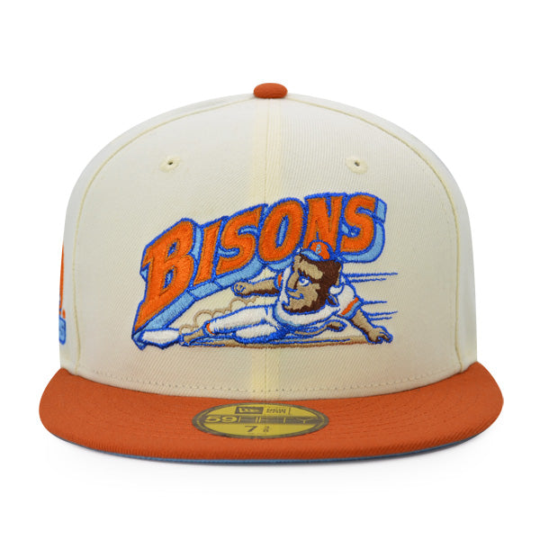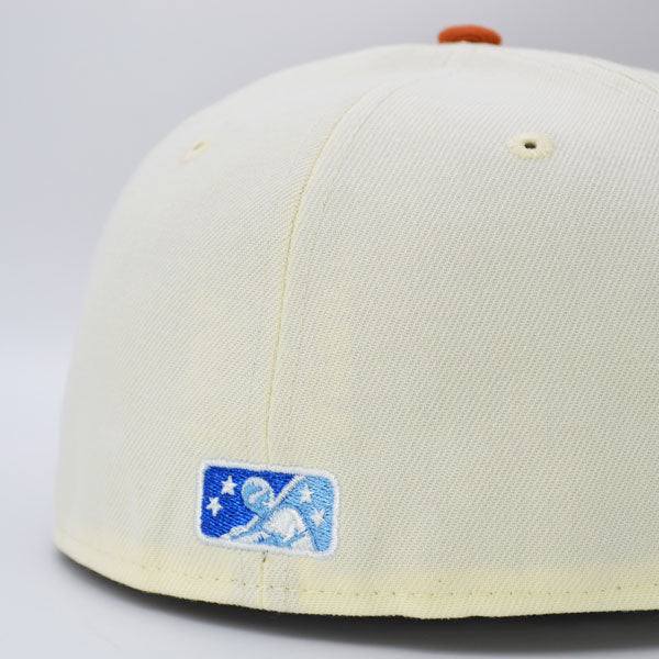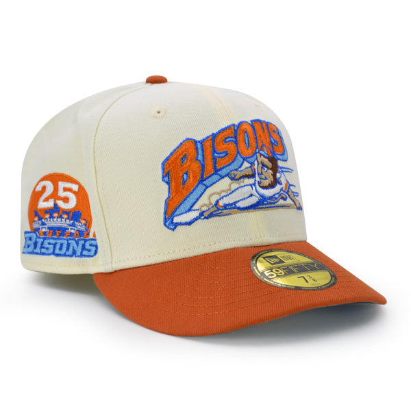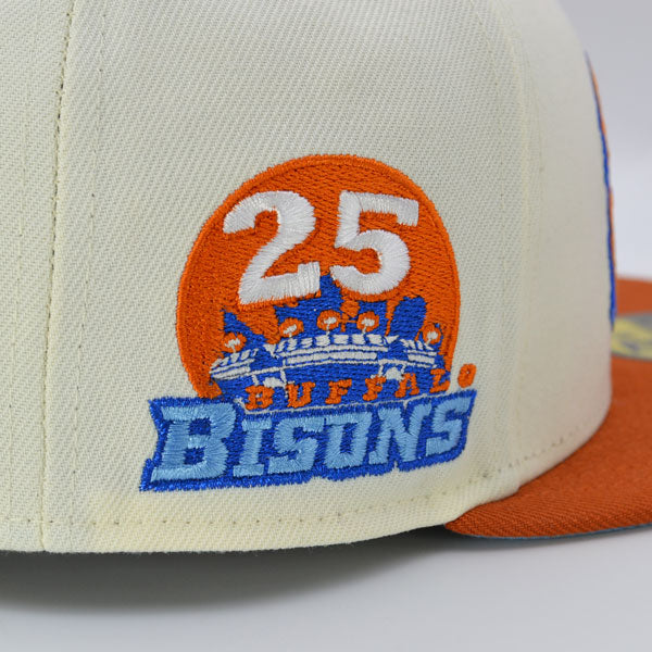 This New Era Buffalo Bisons 25th Anniversary Chrome/Rust 59FIFTY Fitted Hat was released by Hat Dreams. The fitted has a chrome six panel structured high crown and embroidered eyelets with a rust orange fabric squatchee button. The fitted cap also has a rust orange flat bill with a sky blue undervisor. The front panel features the Buffalo Bison logo embroidery and a 25th Anniversary side patch embroidery on the right panel. The left panel of the fitted displays the New Era logo and the official MiLB logo embroidery on the rear crown.