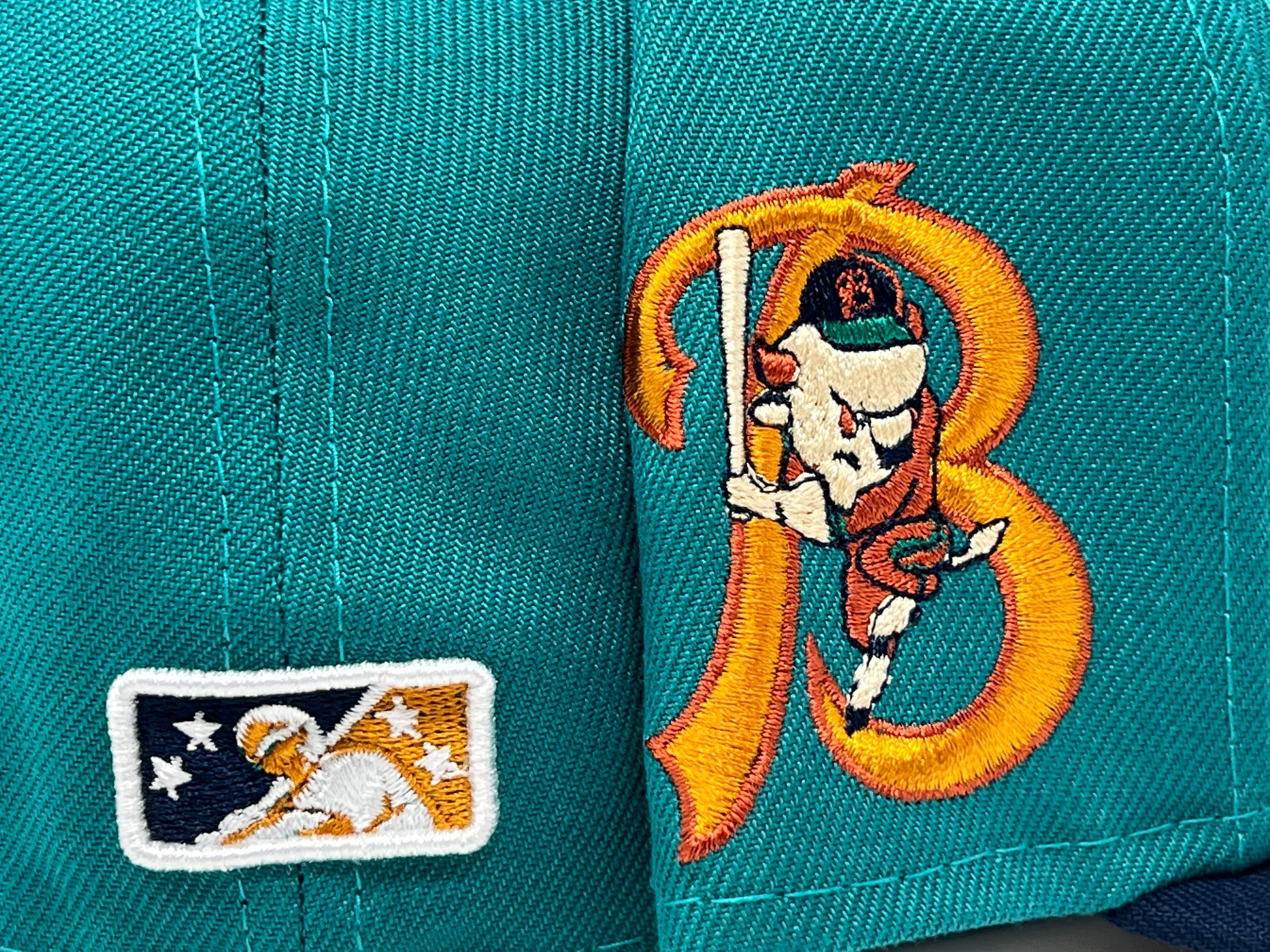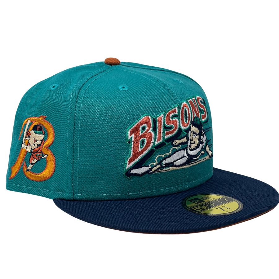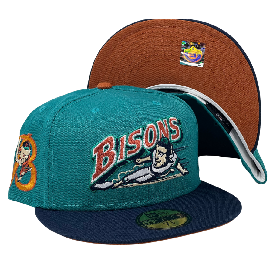 This New Era Buffalo Bisons " Galaxy Part 2" Rust Orange UV 59FIFTY Fitted Hat was released by Sports World 165. The fitted has a turquoise six panel structured high crown and embroidered eyelets with a rust orange fabric squatchee button. The flat bill of the fitted cap is also navy with a rust orange undervisor and white sweatband. The front panel features the Buffalo Bisons logo embroidery and _ side patch on the right panel. The New Era "Fly Your Own Flag" logo is embroidered on the left panel and the rear crown has the official MILB logo on display.
