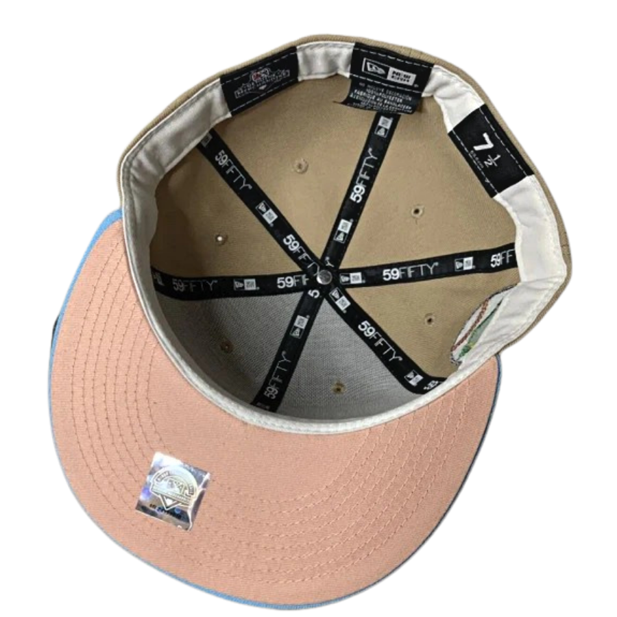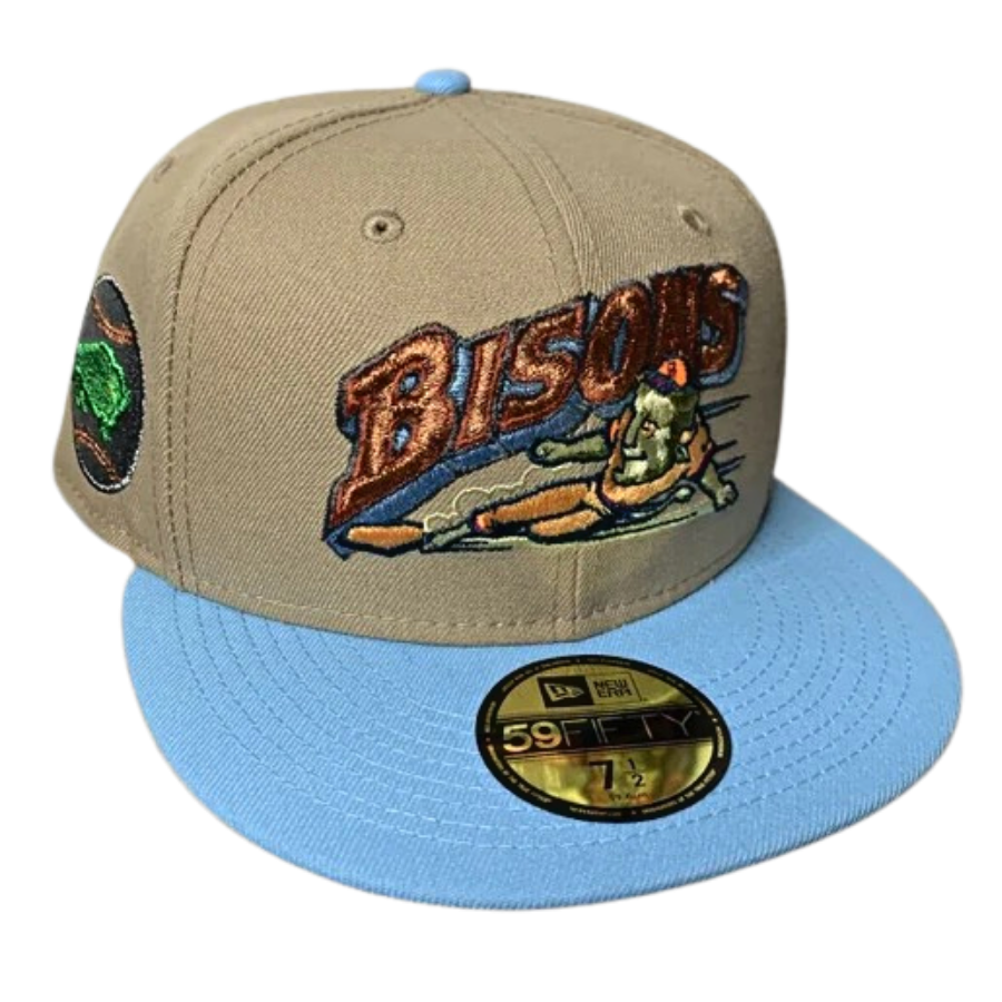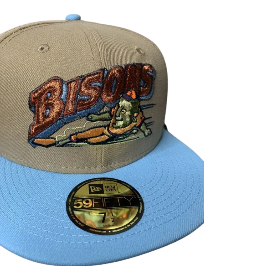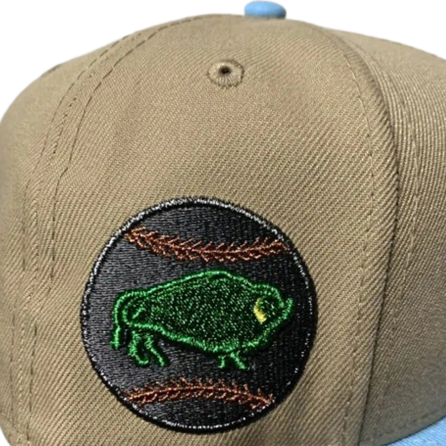 This New Era Buffalo Bisons 'Harry Potter and The Goblet of Fire' fitted hat is a My Fitteds exclusive. The fitted has a tan six panel structured high crown and embroidered eyelets with a sky blue fabric squatchee button and flat bill. The undervisor of the fitted cap is blush pink with a white sweatband. The front panel features the Buffalo Bisons logo embroidered in copper, orange, green and blue threads with a side patch embroidery on the right panel. This fitted hat colorway was inspired by J.K Rowling Harry Potter and The Goblet of Fire childrens book.