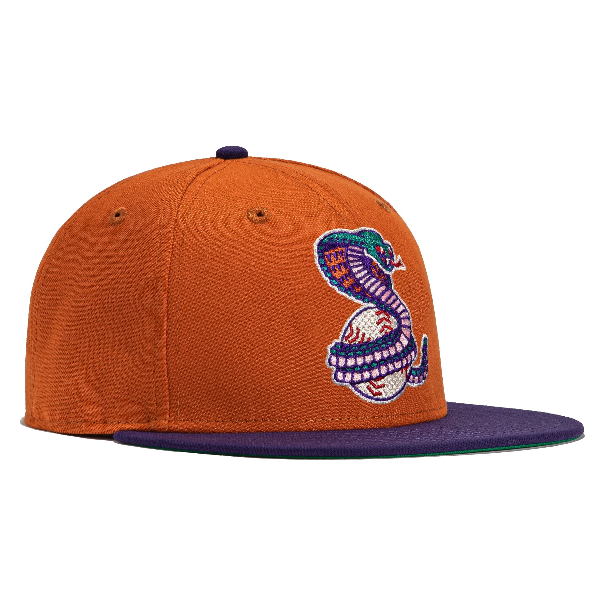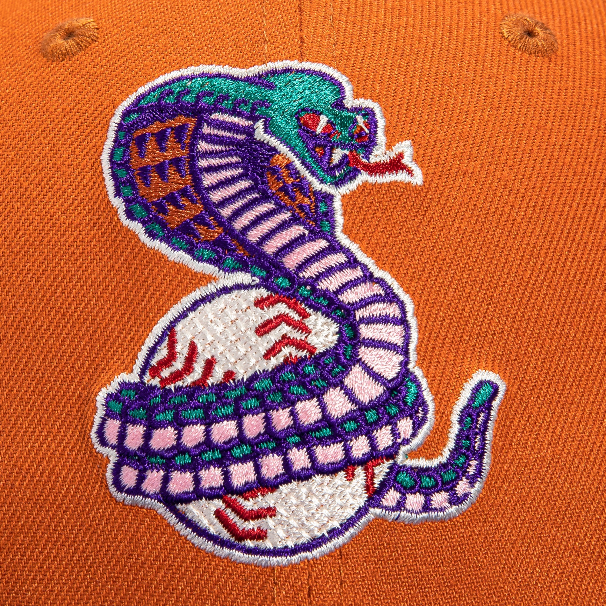 This New Era Cactus Fruit Kissimmee Cobras Hat 59FIFTY Fitted Hat is a Hat Club exclusive release. The fitted has a green/orange six panel structured high crown and embroidered eyelets with a green/orange fabric squatchee button. The fitted cap also has a green/orange flat bill with a green/pink undervisor. The front panel features the Kissimmee Cobras logo embroidery and a side patch embroidery on the right panel. The left panel of the fitted displays the New Era logo and the official MILB logo embroidery on the rear crown.