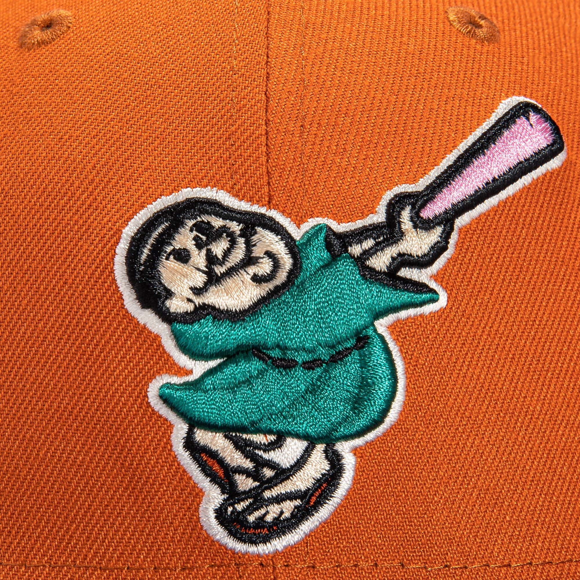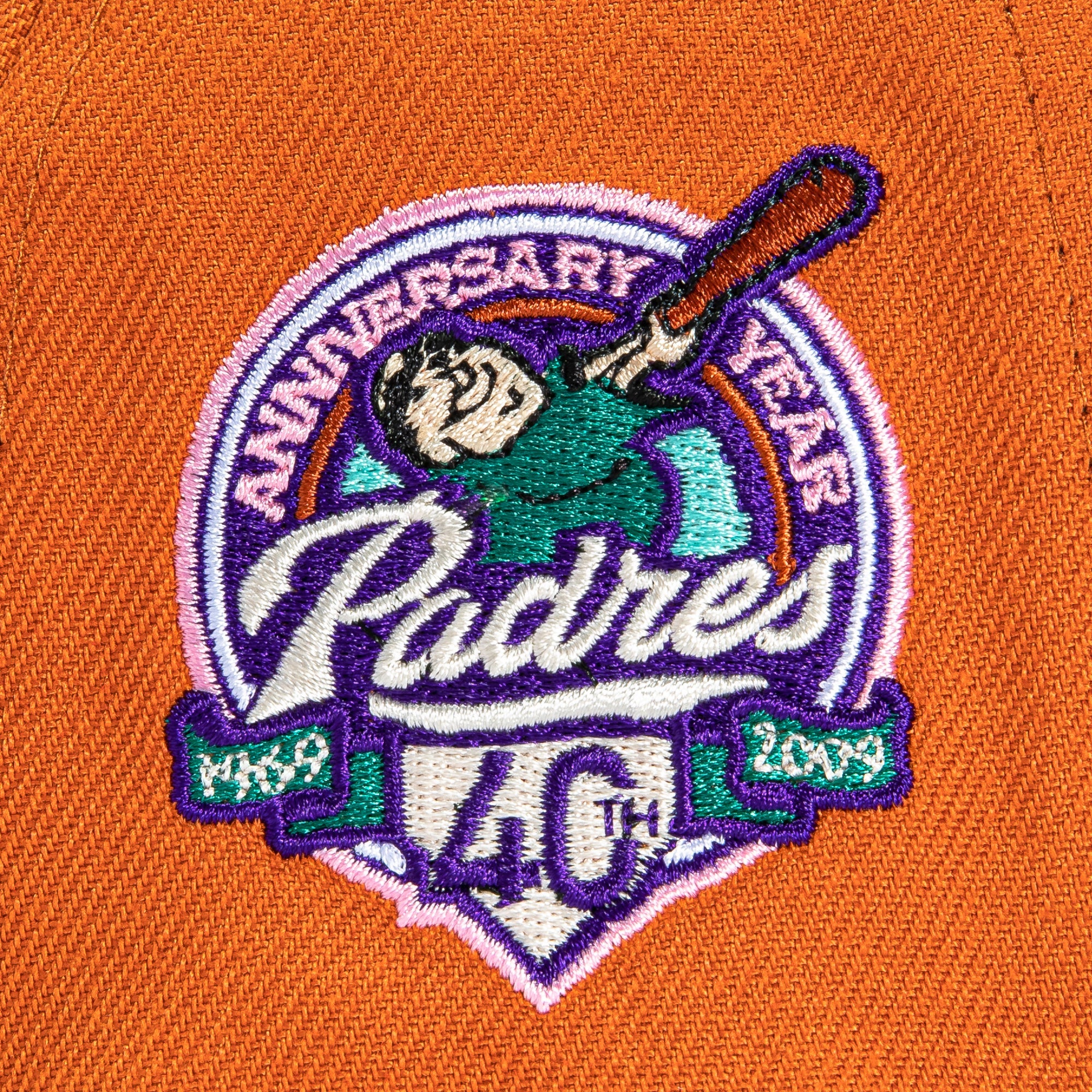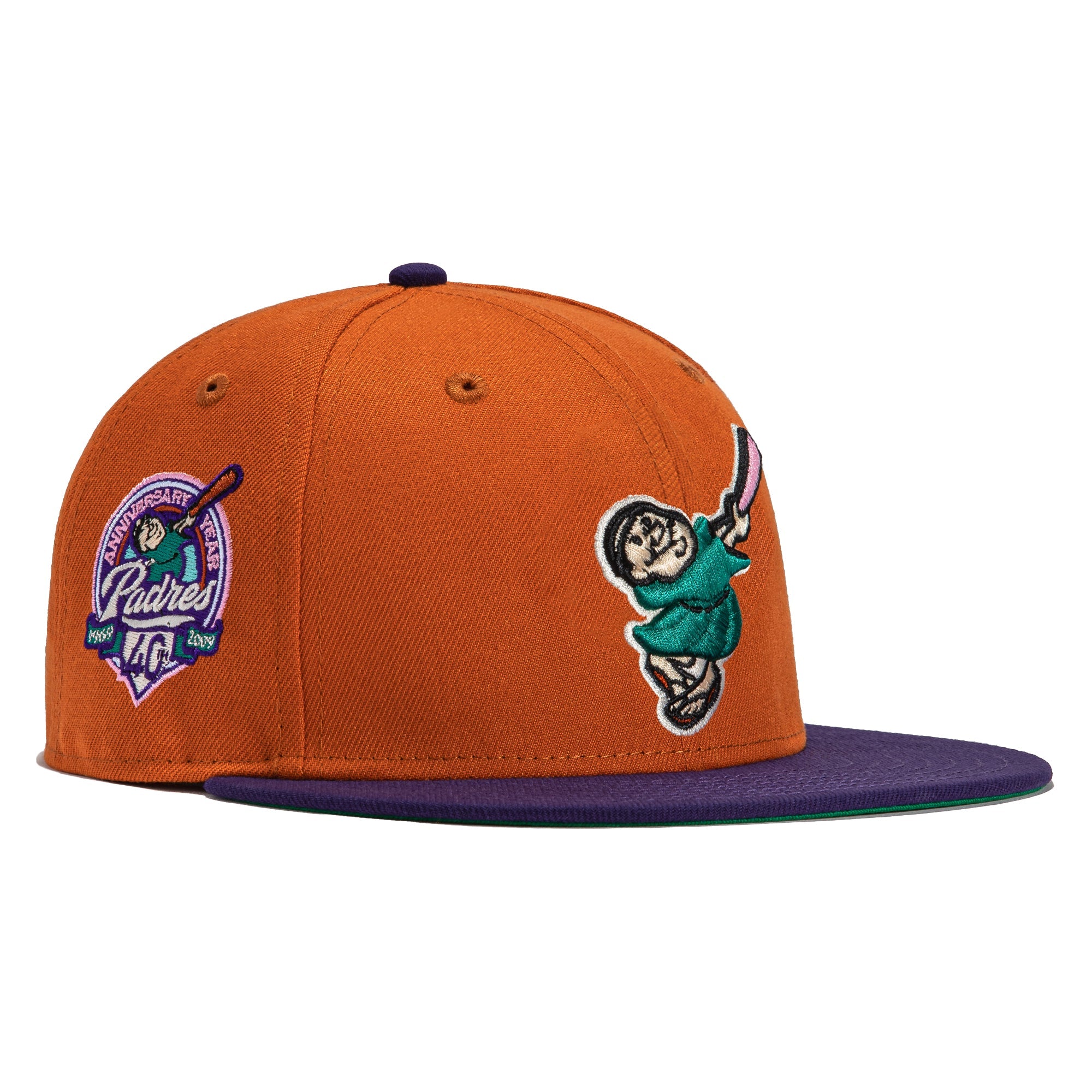 This New Era Cactus Fruit San Diego Padres Swinging Friar 40th Anniversary 59FIFTY Fitted Hat is a Hat Club exclusive release. The fitted has a green/orange six panel structured high crown and embroidered eyelets with a green/orange fabric squatchee button. The fitted cap also has a green/orange flat bill with a green/pink undervisor. The front panel features the San Diego Padres logo embroidery and a side patch embroidery on the right panel. The left panel of the fitted displays the New Era logo and the official MLB logo embroidery on the rear crown.