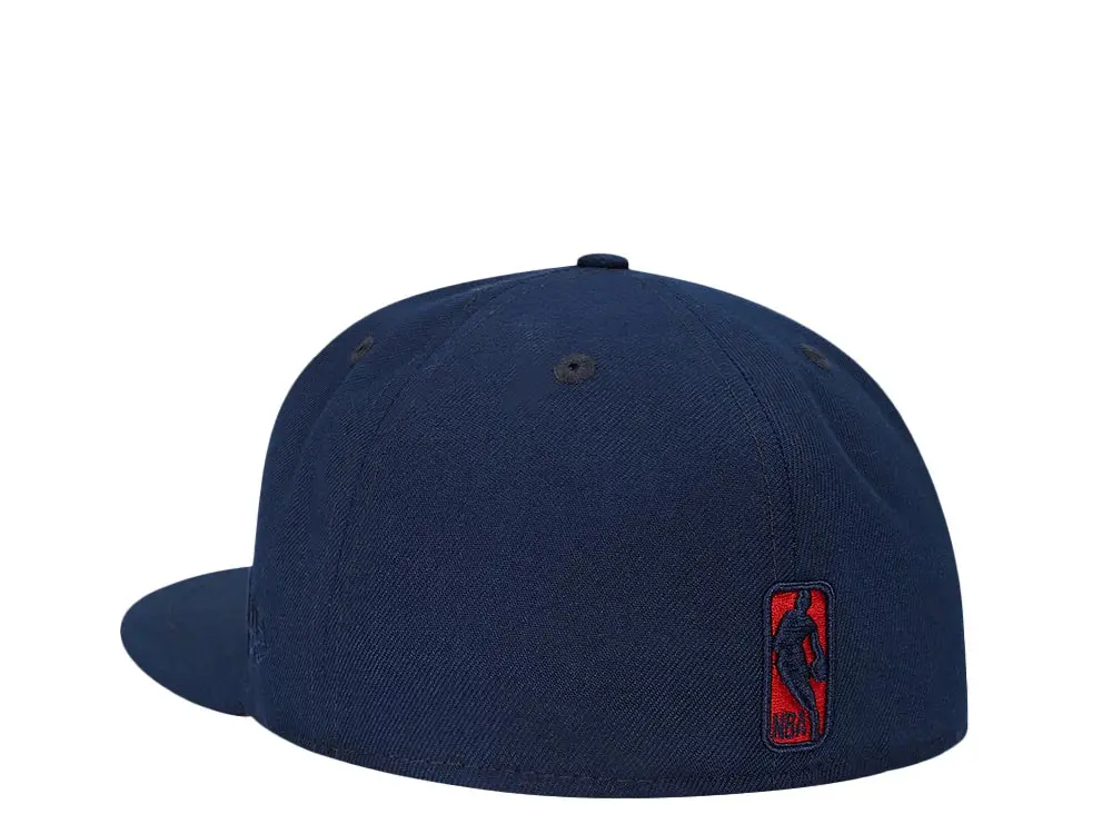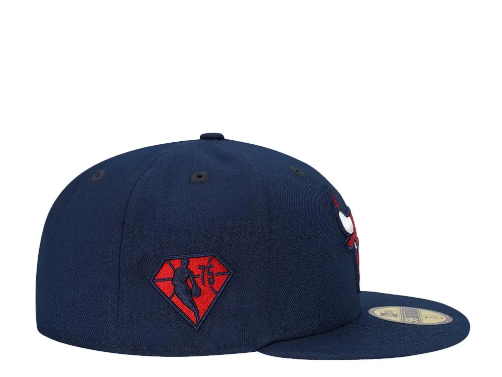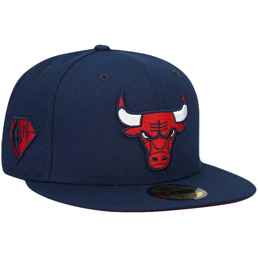 This New Era Chicago Bulls 75th Anniversary Ocean Blue/Red 59FIFTY Fitted Hat has an ocean blue six panel structured high crown and embroidered eyelets with an ocean blue fabric squatchee button. The fitted cap also has an ocean blue flat bill with a red undervisor and white sweatband. The front panel features the Chicago Bulls logo embroidery and a 75th anniversary side patch embroidery on the right panel. The left panel of the fitted displays the New Era logo and the official NBA logo embroidery on the rear crown.