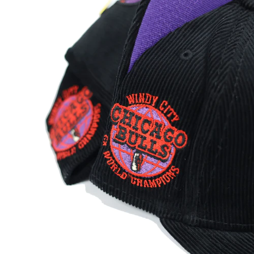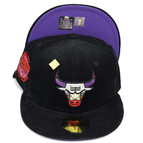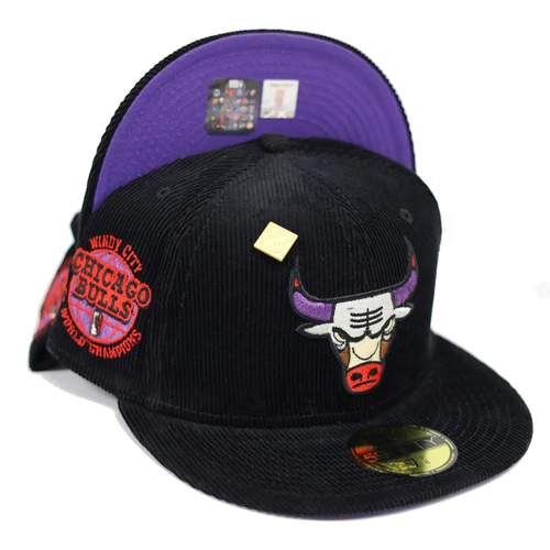 This New Era Chicago Bulls Black Corduroy 6x World Champs 59FIFTY fitted hat is a Capsule exclusive. The fitted has a black corduroy six panel construction including eyelets and squatchee button. The flat bill of the fitted is also black corduroy with a grape purple undervisor. The front panel features the Chicago Bulls logo embroidered in white, purple, brown and red colorway. The right panel features a 6x World Champs side patch embroidery.
