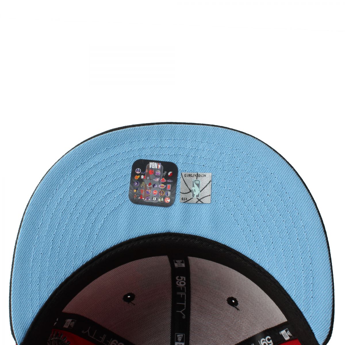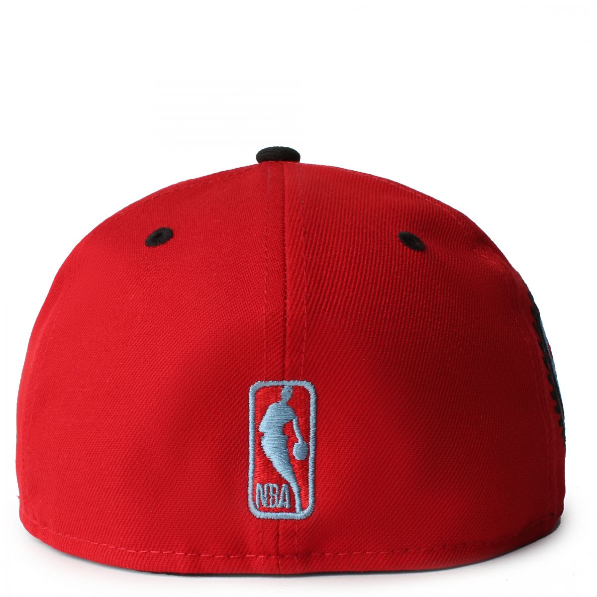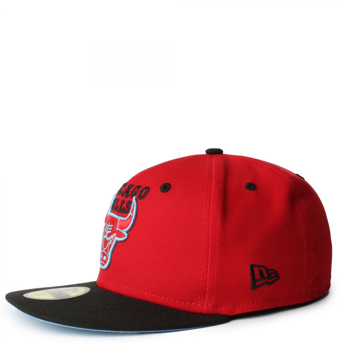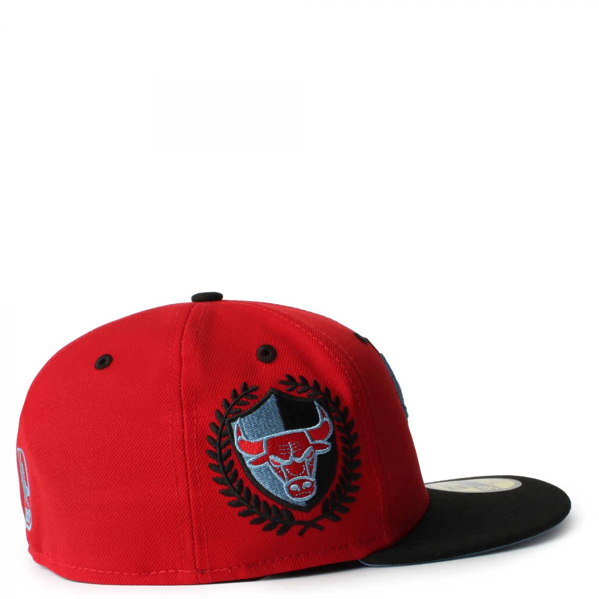 This Chicago Bulls fitted hat was released by Karma Loop. The fitted has a red six panel structured high crown with black embroidered eyelets and fabric squatchee button. The fitted cap also has a black flat bill with a light blue undervisor and black sweatband. The front panel features the Chicago Bulls logo embroidery and a side patch embroidery on the right panel. The left panel of the fitted displays the New Era logo and the official NBA logo embroidery on the rear crown.