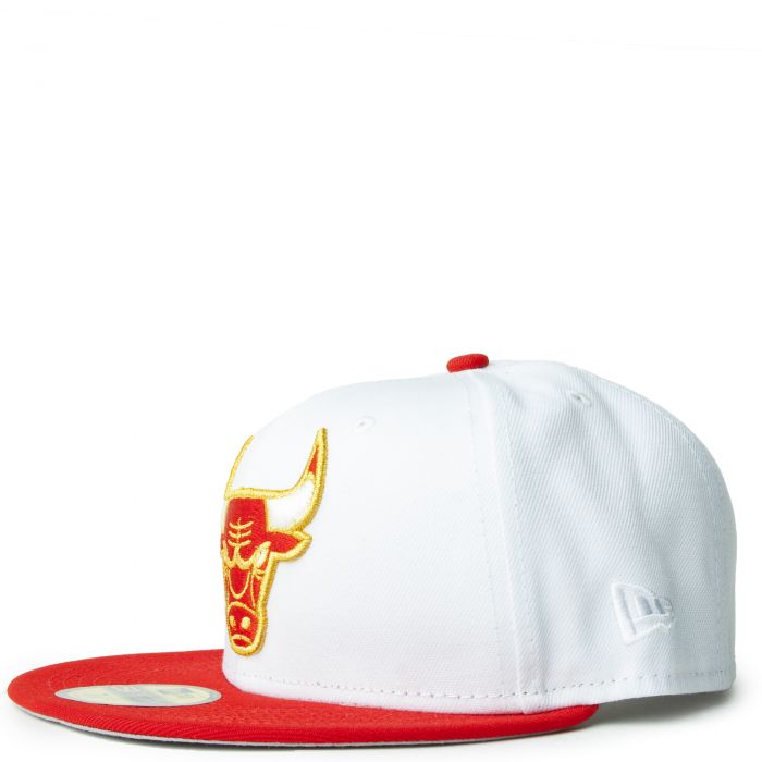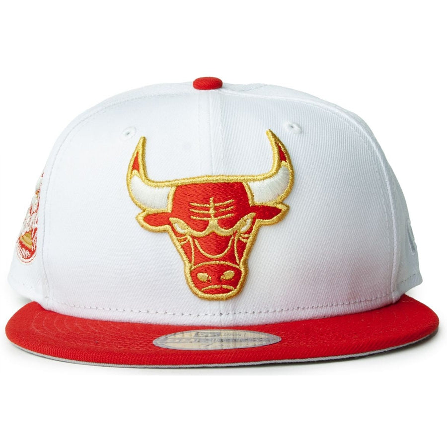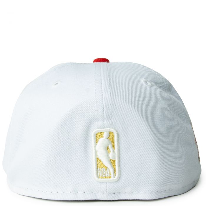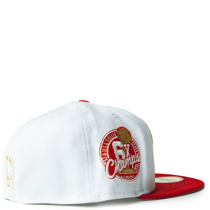 This New Era Chicago Bulls White/Red/Gold 6x Champs 59FIFTY Fitted Hat was released by Karma Loop. The fitted has a white six panel structured high crown and embroidered eyelets with a red fabric squatchee button. The fitted cap also has a red flat bill with a grey undervisor and black sweatband. The front panel features the Chicago Bulls logo embroidery and a 6x Champs side patch embroidery on the right panel. The left panel of the fitted displays the New Era logo and the official NBA logo embroidery on the rear crown.