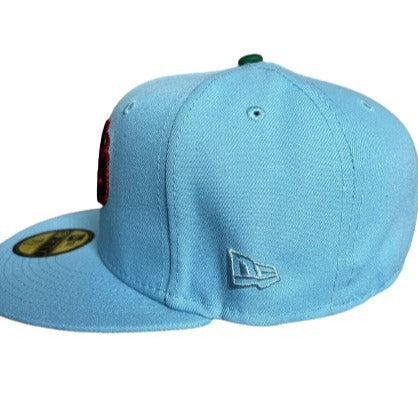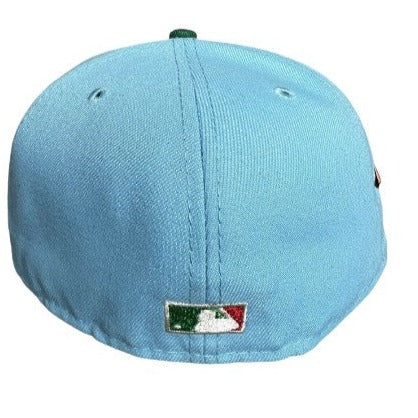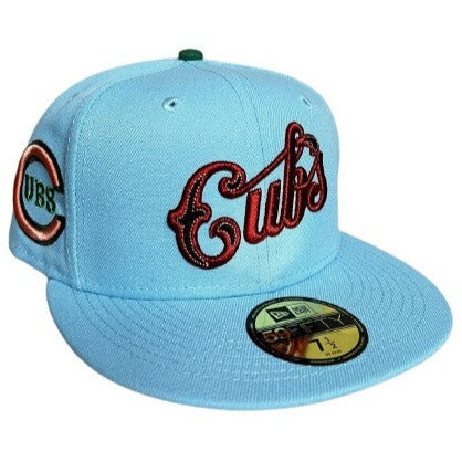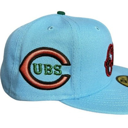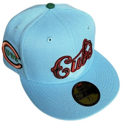 Chicago Cubs 'Harry Potter and the Chamber of Secrets' (Illustrated Edition) 59FIFTY fitted hat is a My Fitteds exclusive release. The fitted has a mint six panel structured high crown and embroidered eyelets with a botany green fabric squatchee button. The flat bill of the fitted is also mint with a blush pink undervisor and a white sweatband. The front panel features the Chicago Cubs logo embroidery and a side patch embroidered on the right panel. The fitted hat was inspired by