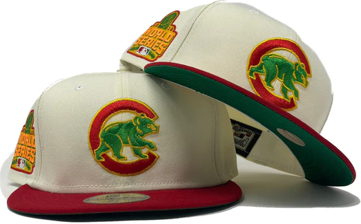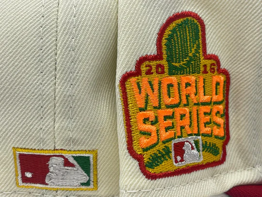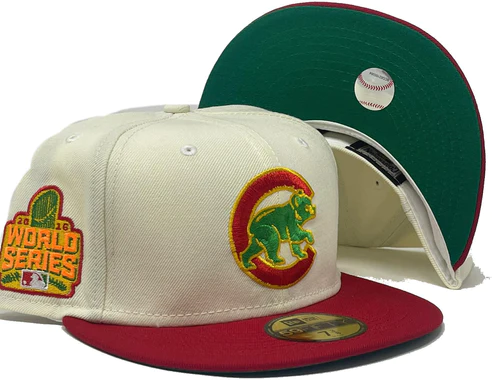 This New Era Chicago Cubs Off-White 2016 World Series Green Undervisor 59FIFTY Fitted Hat has a off-white six panel structured high crown and embroidered eyelets with a off-white fabric squatchee button. The fitted cap has a red flat bill with a kelly green undervisor and white sweatband. The front panel features the Chicago Cubs logo embroidery and a 2016 World Series side patch embroidery on the right panel. The left panel of the fitted displays the New Era logo and the official MLB logo embroidery on the rear crown.