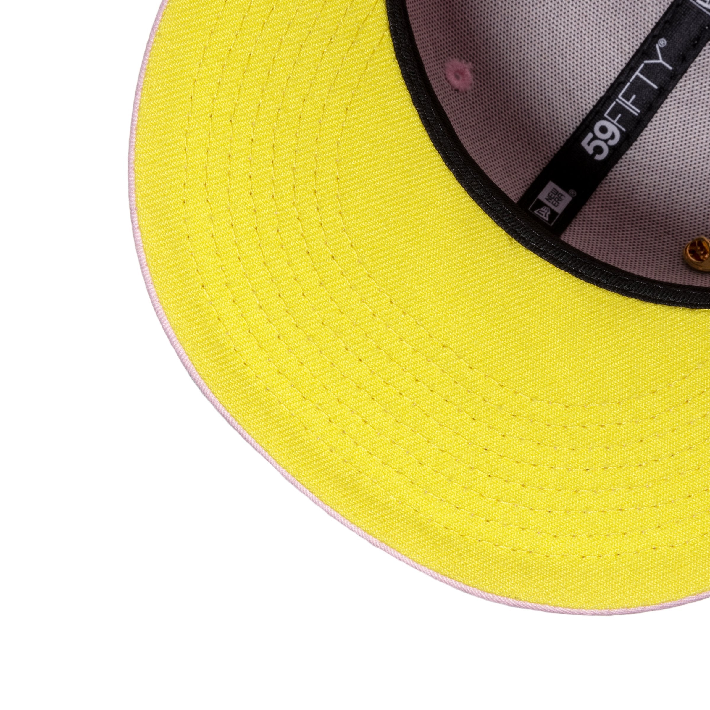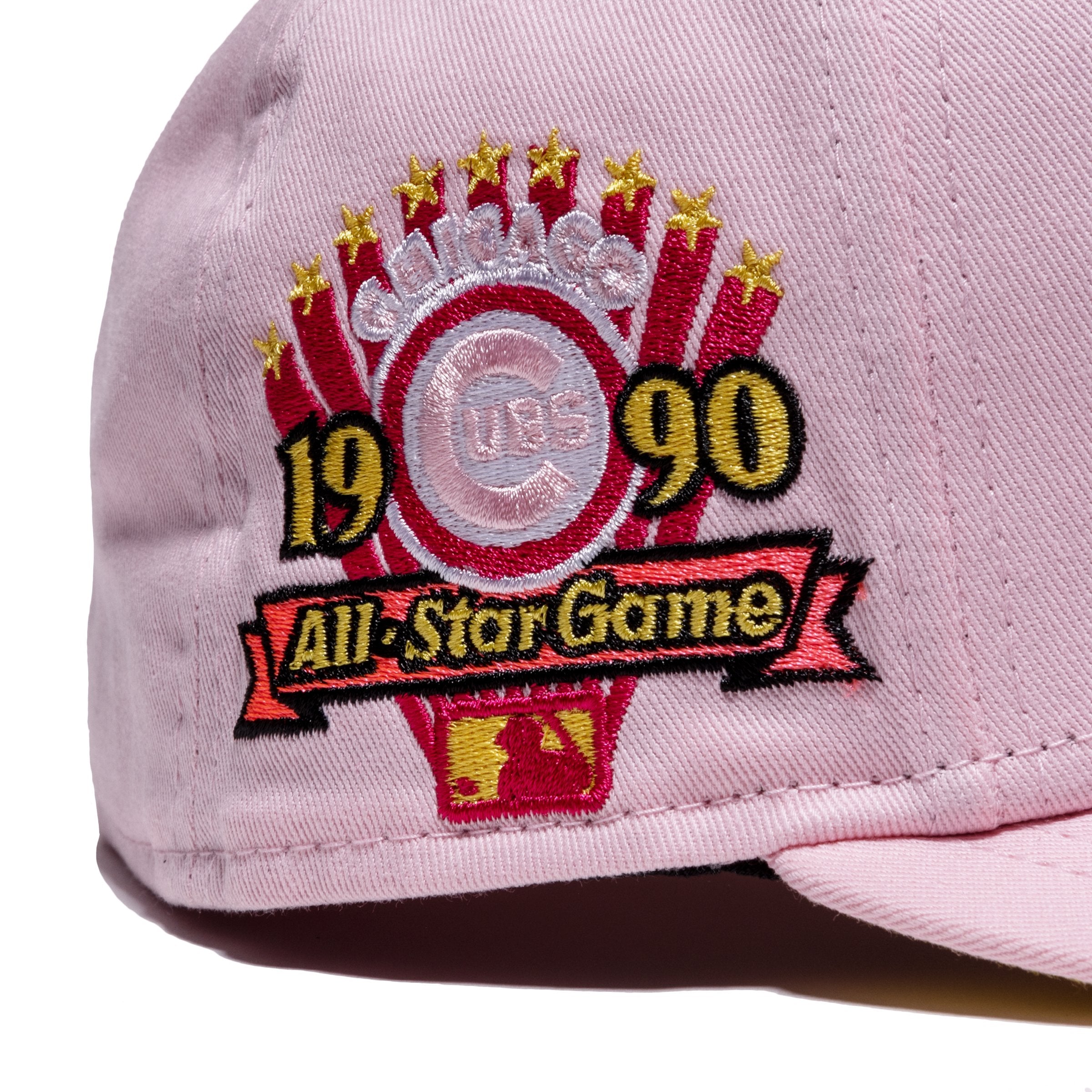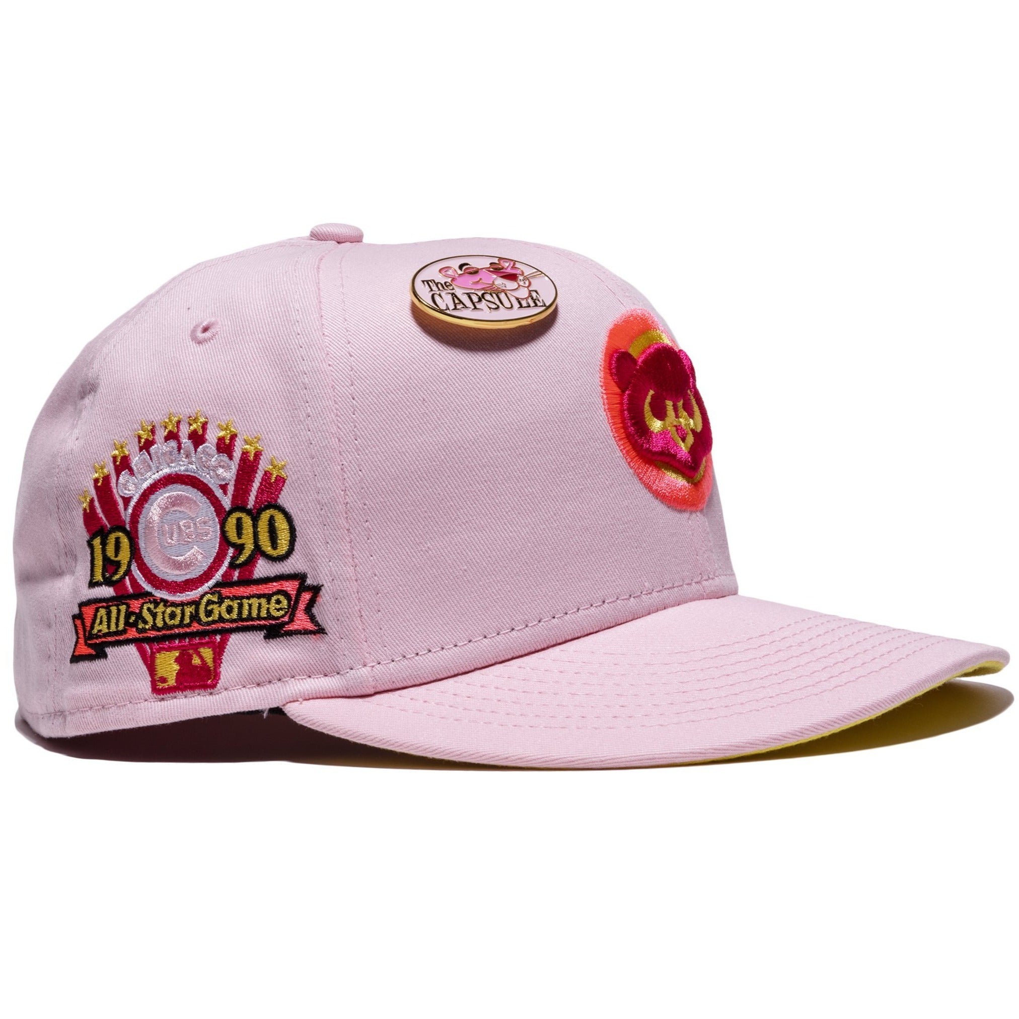 The New Era Chicago Cubs Pink Pather fitted hat is a Capsule Hats exclusive part of their "Pink Panther Collection". The fitted features a soft pink six panel structured high crown, embroidered eyelets and fabric squatchee button. The flat bill of the fitted is also soft pink with a yellow undervisor and black sweatband. The front panel features the Chicago Cubs logo embroidered in flourescent pink and yellow threads with a 1990 All-Star Game side patch embroidered on the right panel. The fitted hat when released from Capsule included an exclusive Capsule Pink Panther pin.