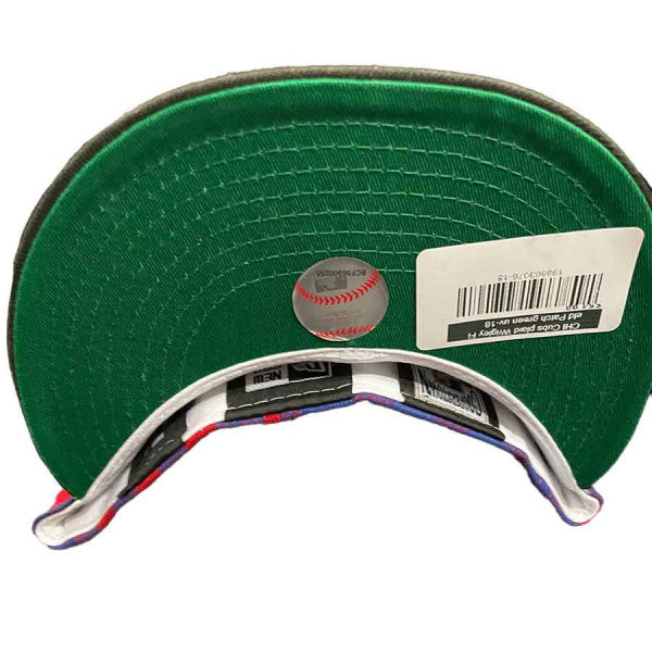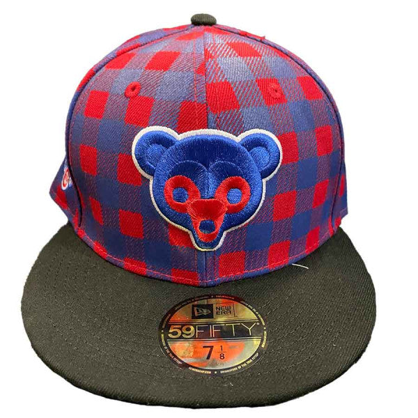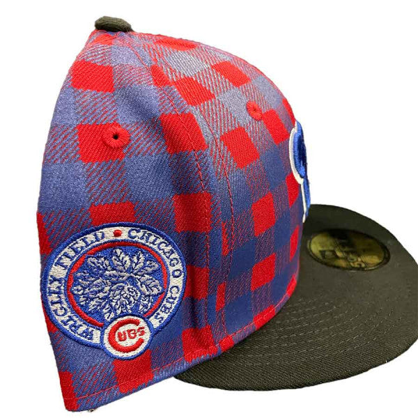 This New Era Chicago Cubs Plaid Collection Wrigley Field 59FIFTY Fitted Hat was released by Pro Image Sports. The fitted has a red and blue plaid six panel structured high crown and embroidered eyelets with a black fabric squatchee button. The fitted cap also has a black flat bill with a green undervisor and white sweatband. The front panel features the Chicago Cubs logo embroidery and a Wrigleys Field side patch embroidery on the right panel. The left panel of the fitted displays the New Era logo and the official MLB logo embroidery on the rear crown.