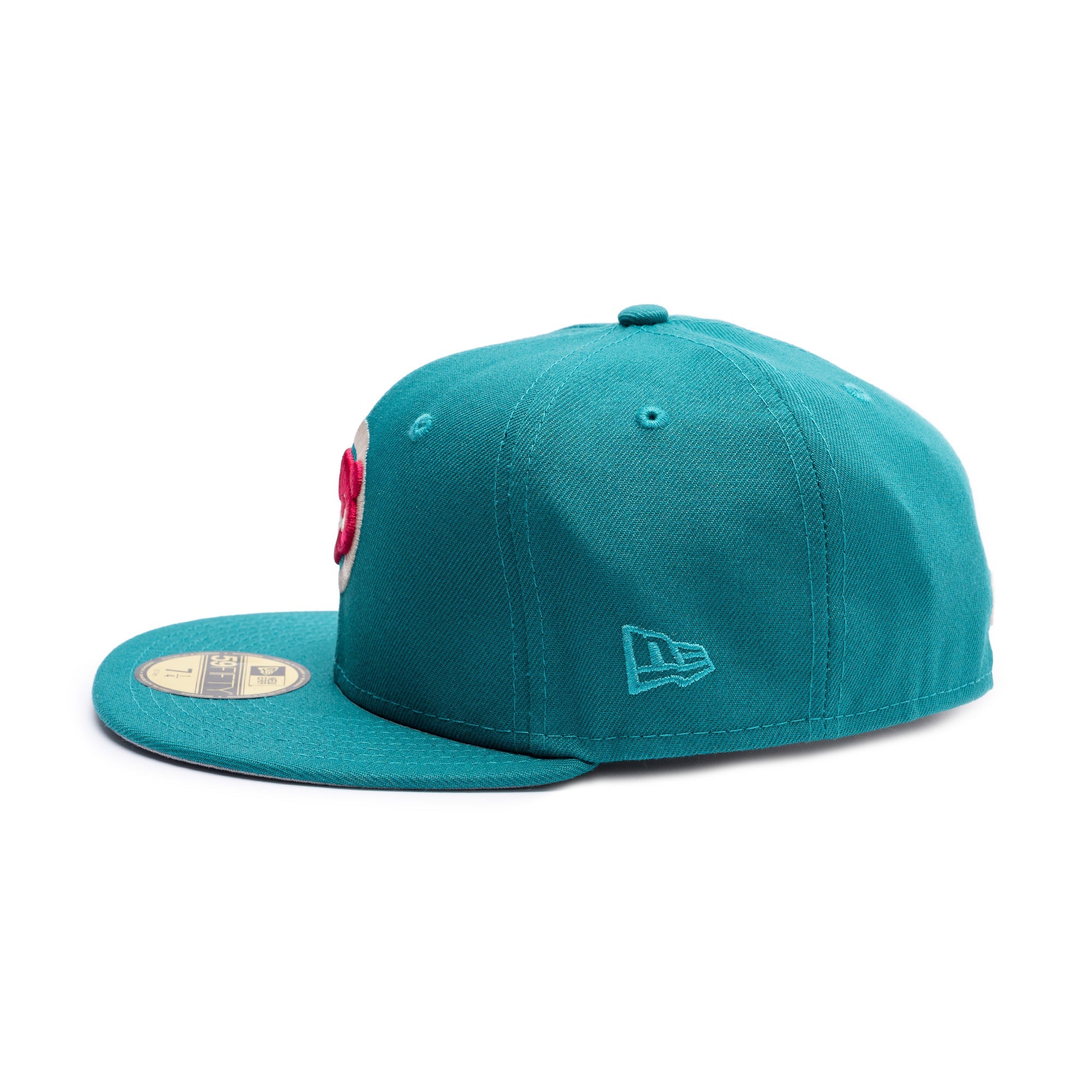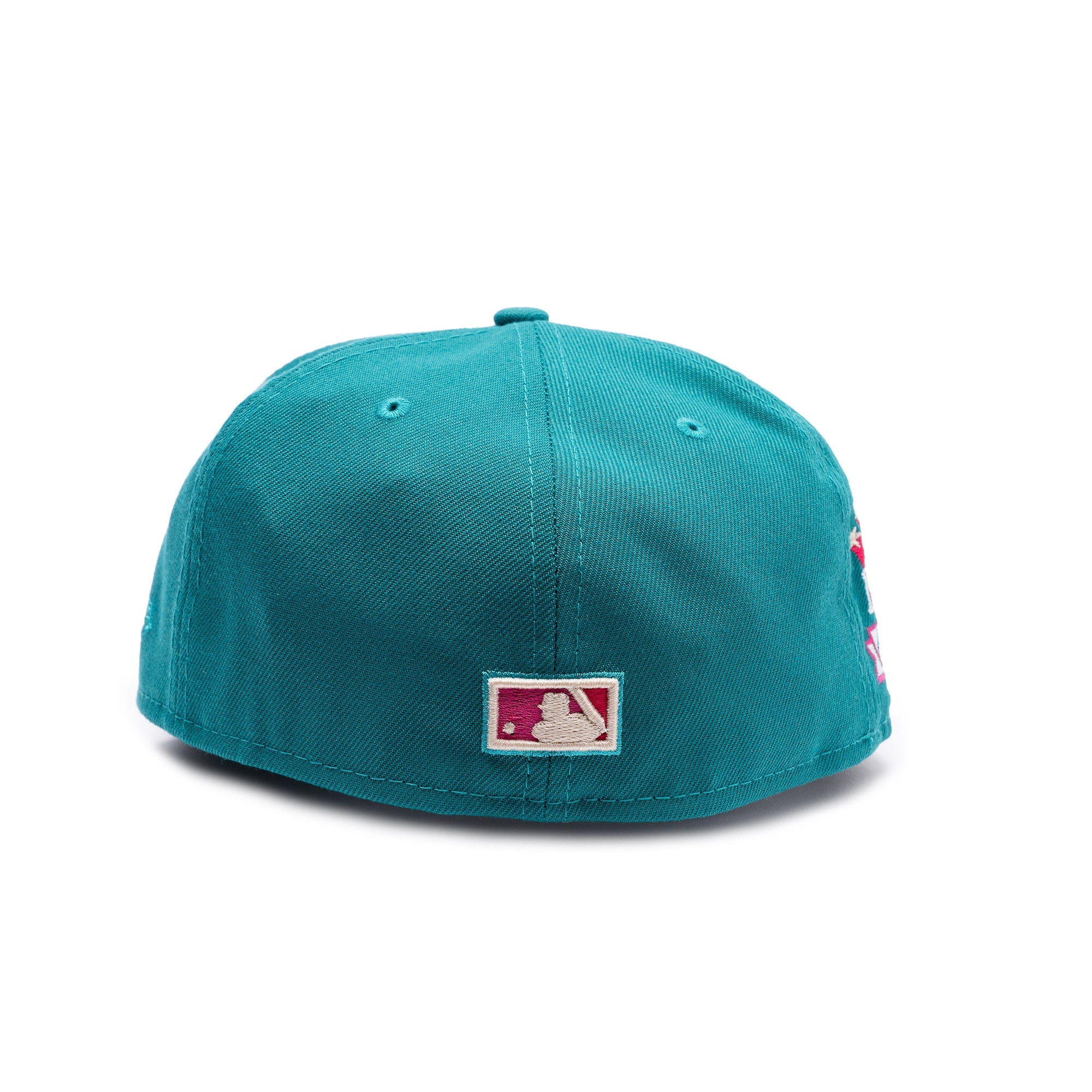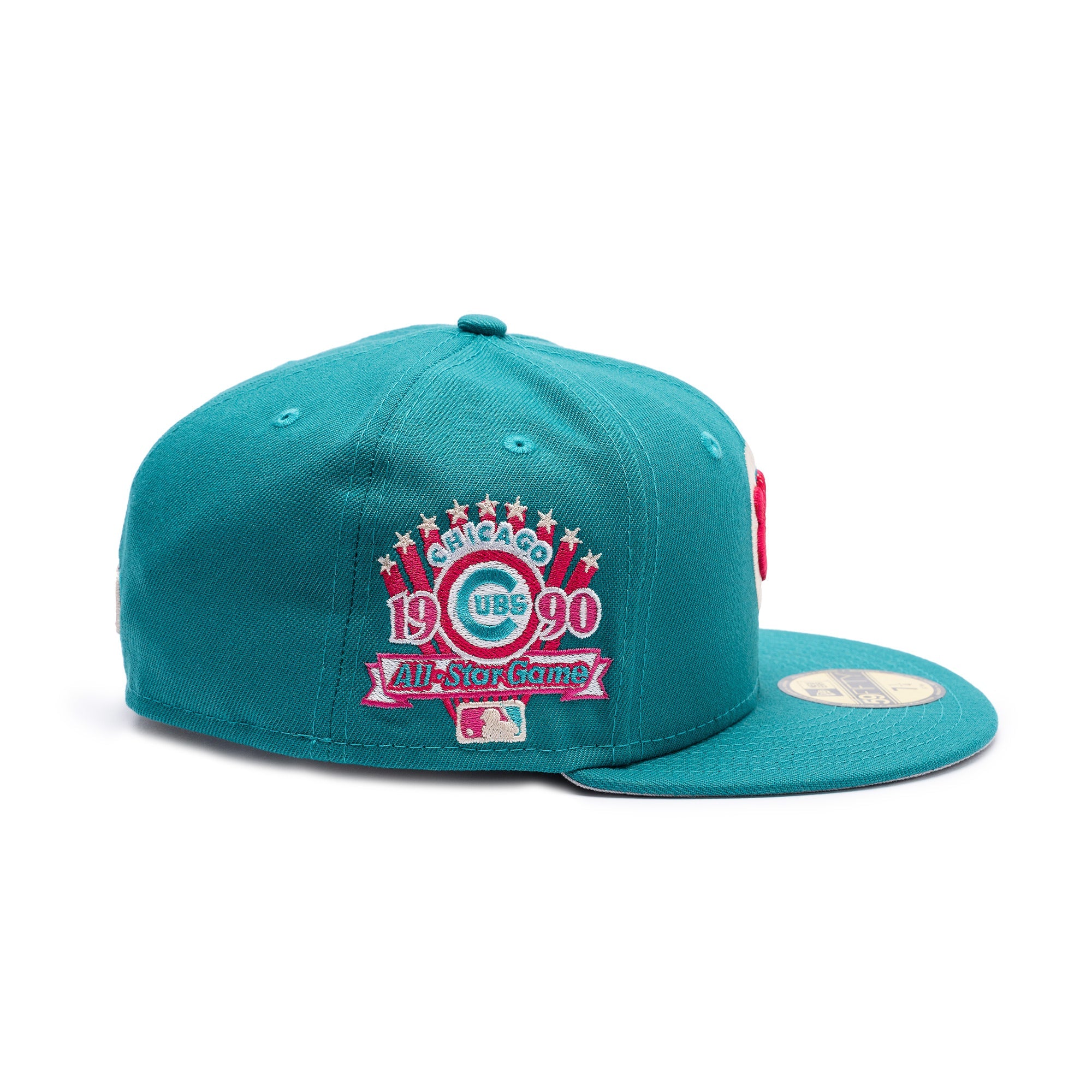 This New Era Chicago Cubs Teal/Pink 1990 All-Star Game 59FIFTY Fitted Hat  has a teal six panel structured high crown and embroidered eyelets with a teal fabric squatchee button. The fitted cap has a teal flat bill with a light gray undervisor and black sweatband. The front panel features the Chicago Cubs logo embroidery and a 1990 ASG side patch embroidery on the right panel. The left panel of the fitted displays the New Era logo and the official MLB logo embroidery on the rear crown.