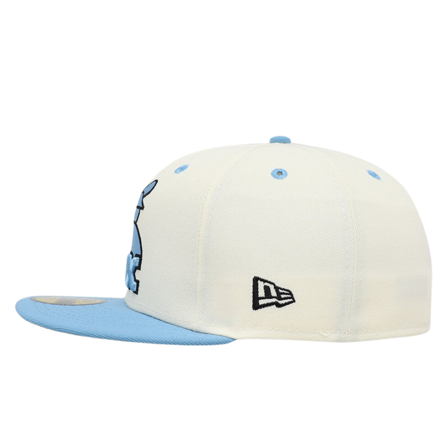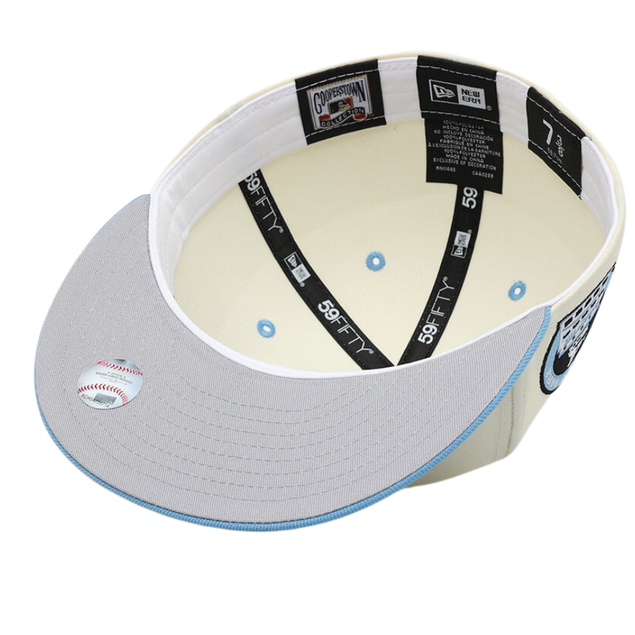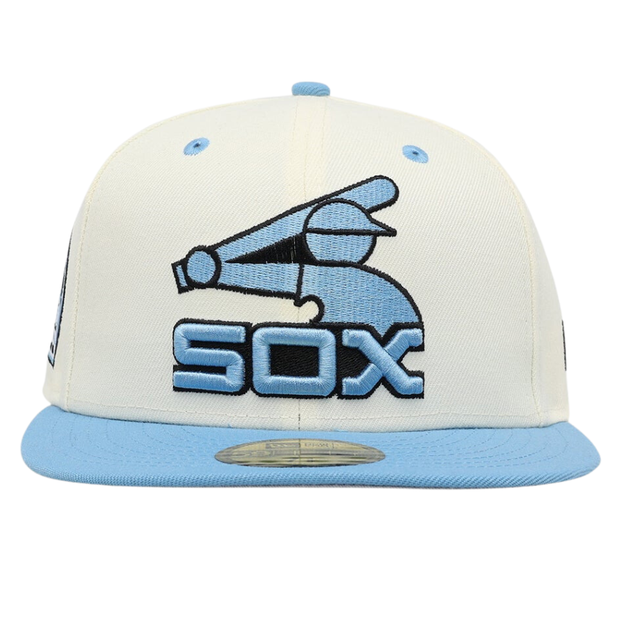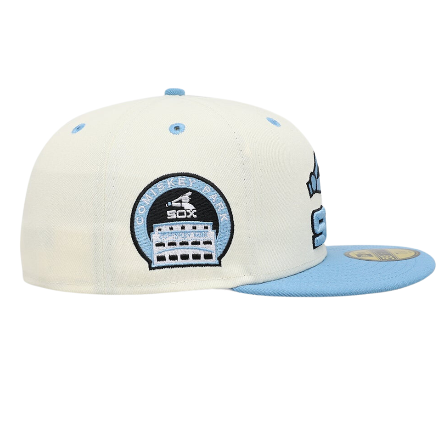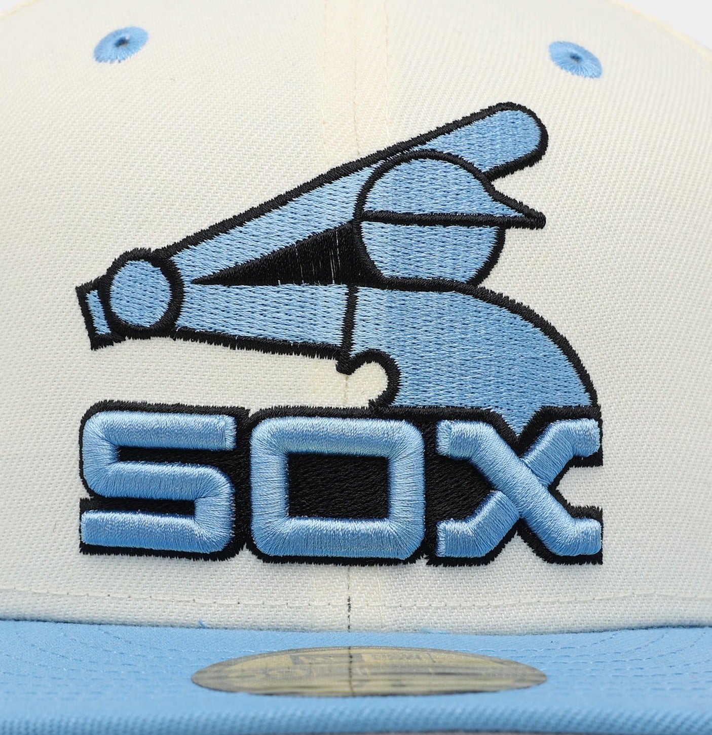 This New Era Chicago White Sox 'Chrome University Blue' 59FIFTY Fitted White was released by Culture Kings. The fitted has a chrome/white six panel structured high crown, university blue embroidered eyelets & fabric squatchee button. The flat bill of the fitted cap is also university blue with a grey bottom undervisor and a white sweatband. The front panel features the Chicago White Sox logo embroidery with a side patch on the right panel. The left panel of the fitted displays the New Era logo and the official MLB Batterman logo on the rear-crown .
