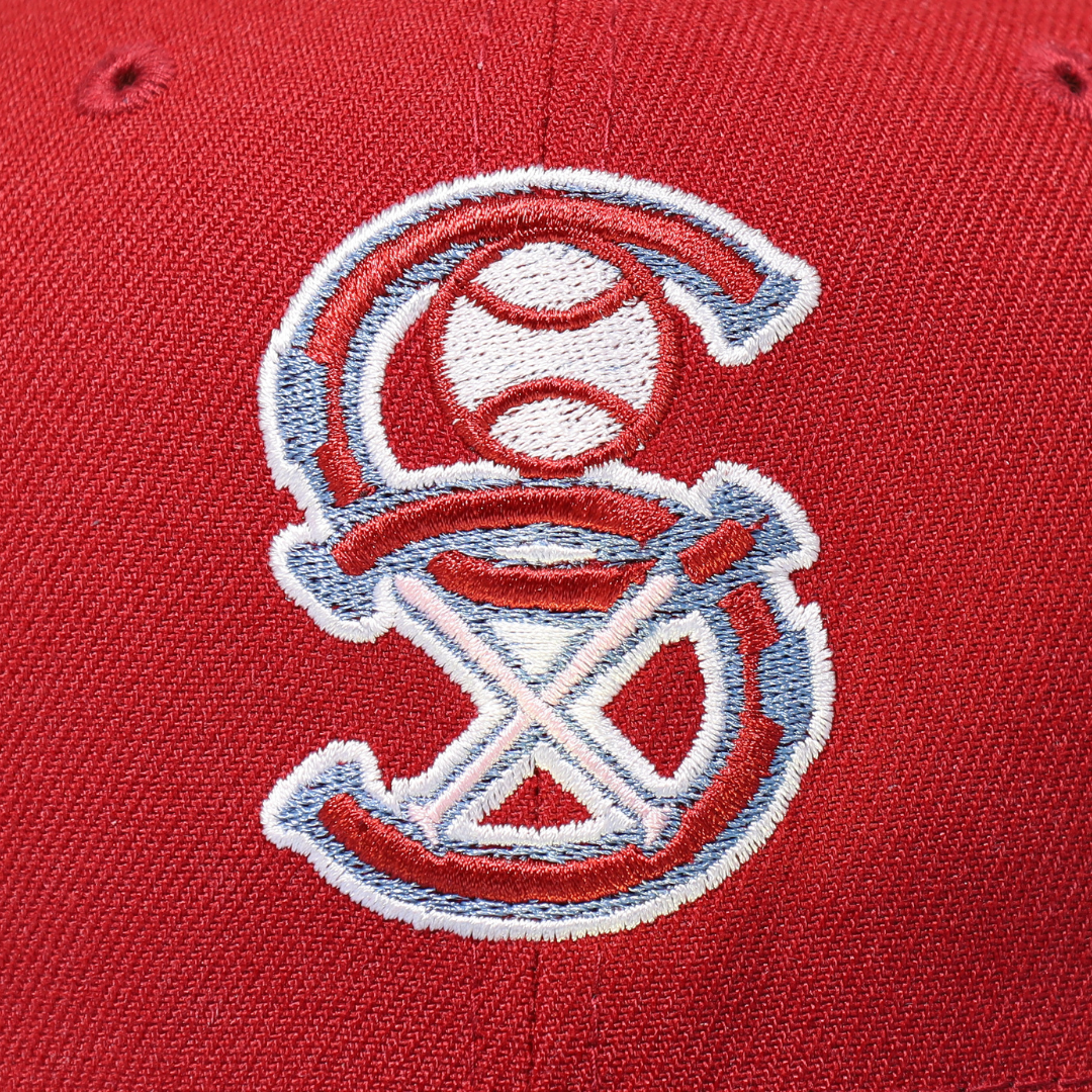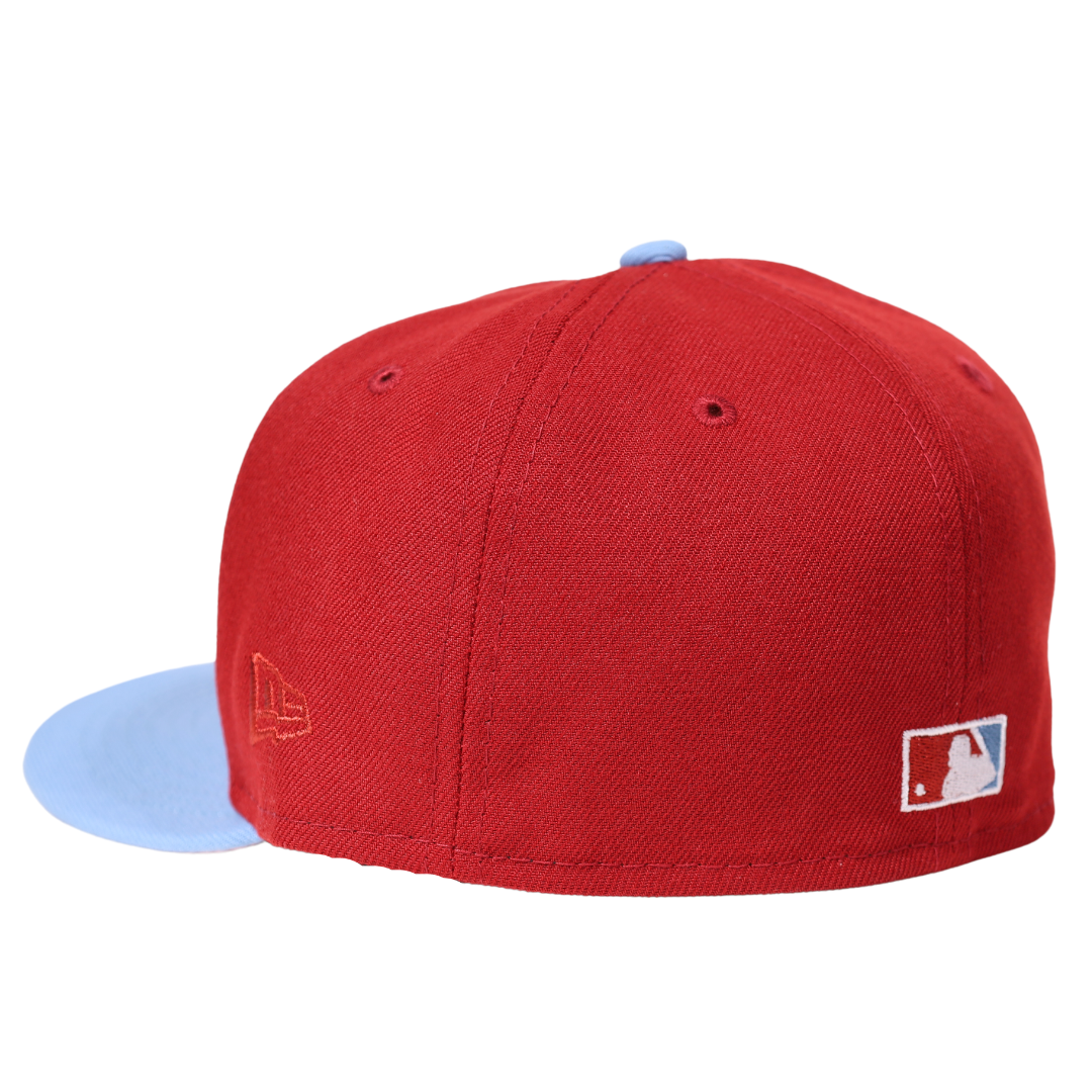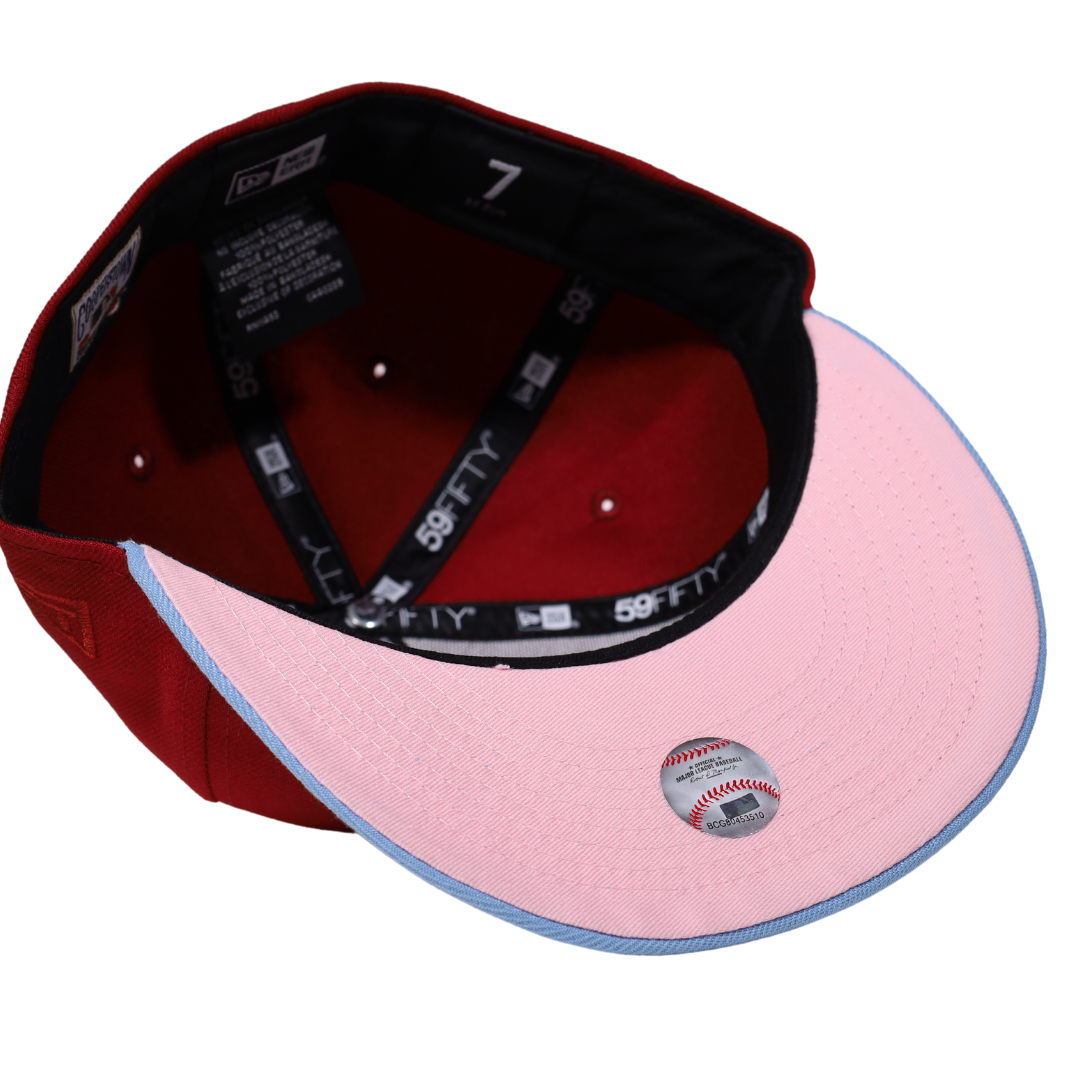 This New Era Chicago White Sox Retro 59FIFTY Fitted Hat has a burgundy/cardinal red six panel structured high crown and embroidered eyelets with a sky blue fabric squatchee button. The fitted cap has a sky blue flat bill with a pink bottom undervisor. The front panel features the Chicago White Sox logo embroidery and a MLB Batterman logo on the rear-crown.