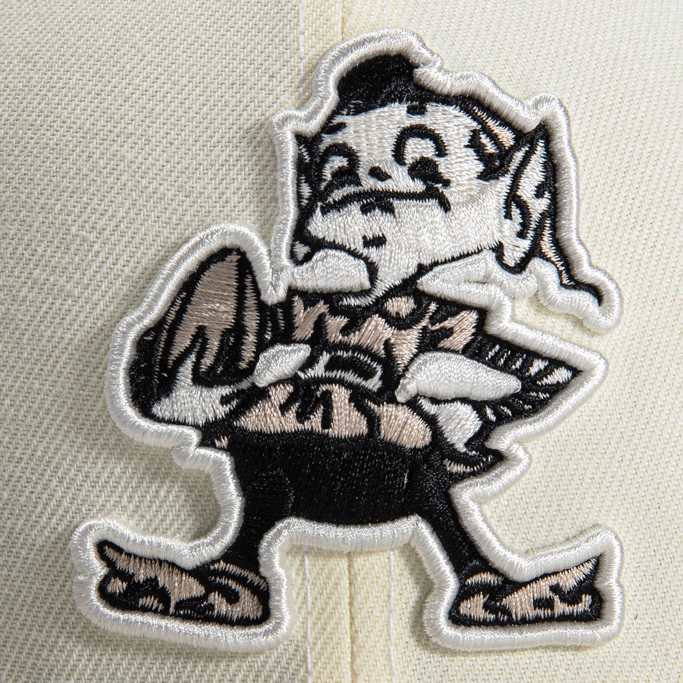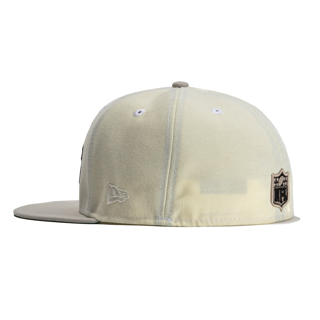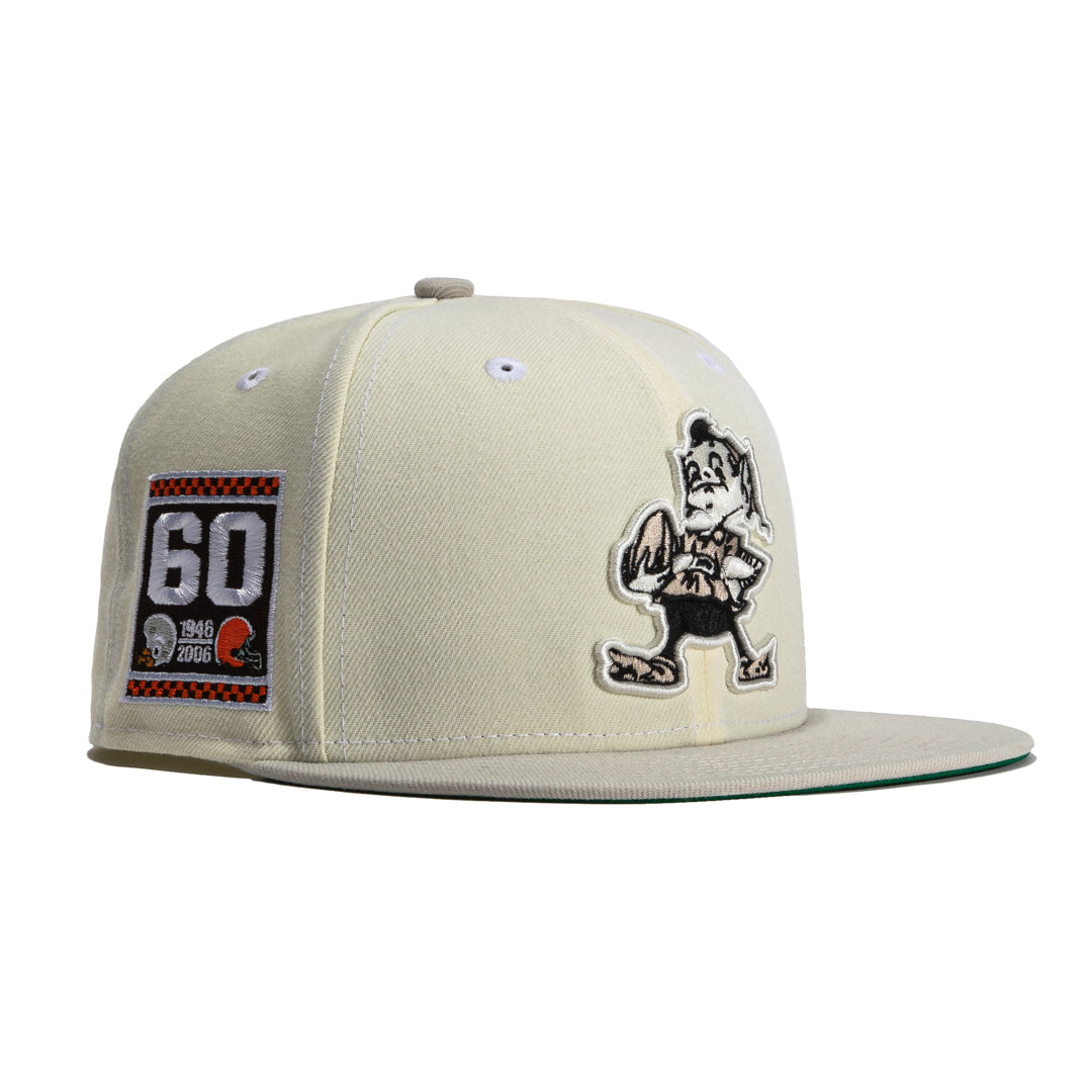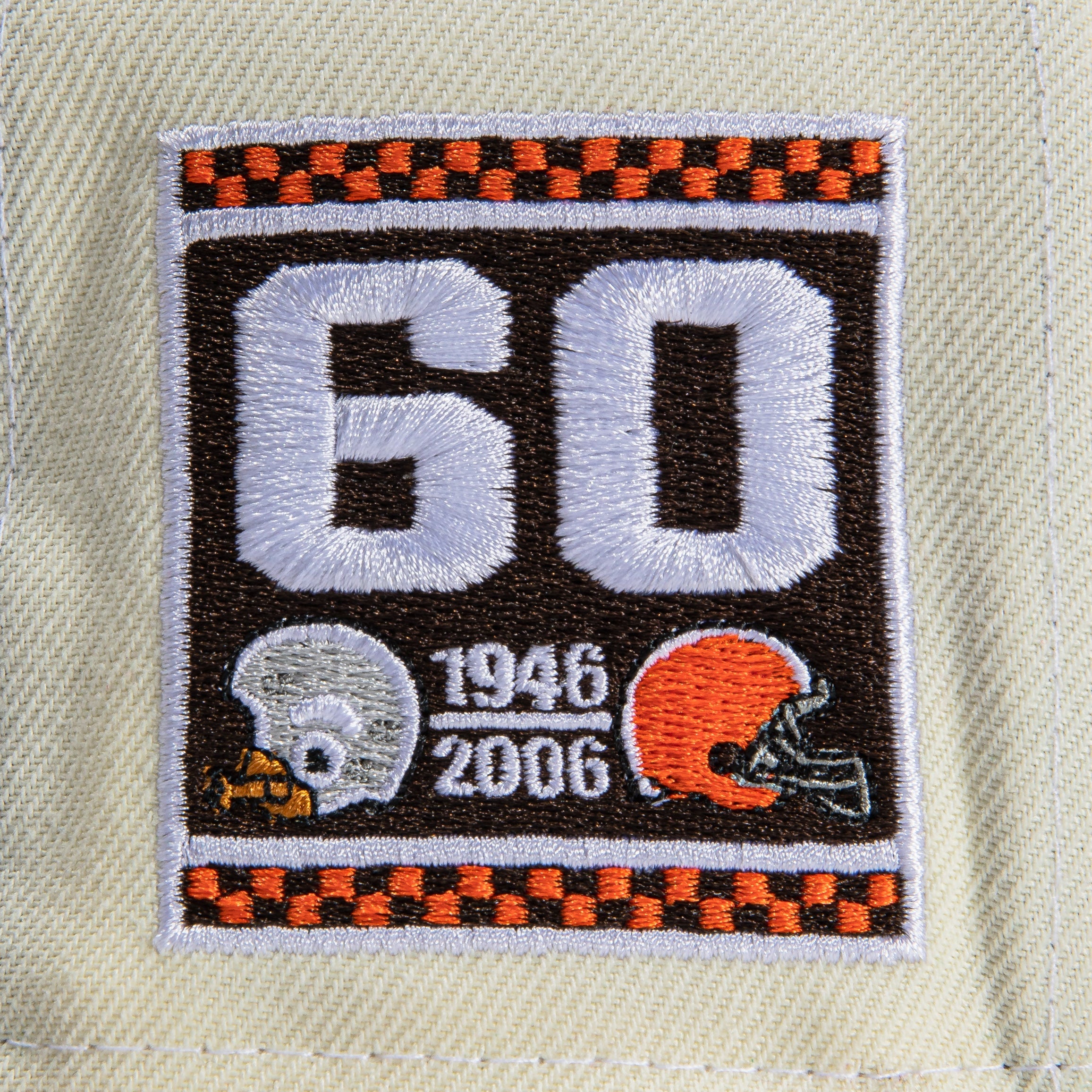 This New Era Chrome Cleveland Browns 60th Anniversary 59FIFTY Fitted Hat is a Hat Club Exclusive. It has a chome six panel structured high crown and embroidered eyelets with a stone fabric squatchee button. The fitted cap has a stone flat bill with a green undervisor and white sweatband. The front panel features the Cleveland Browns logo embroidery and a 60th Anniversary side patch embroidery on the right panel. The left panel of the fitted displays the New Era logo and the official NFL logo embroidery on the rear crown.
