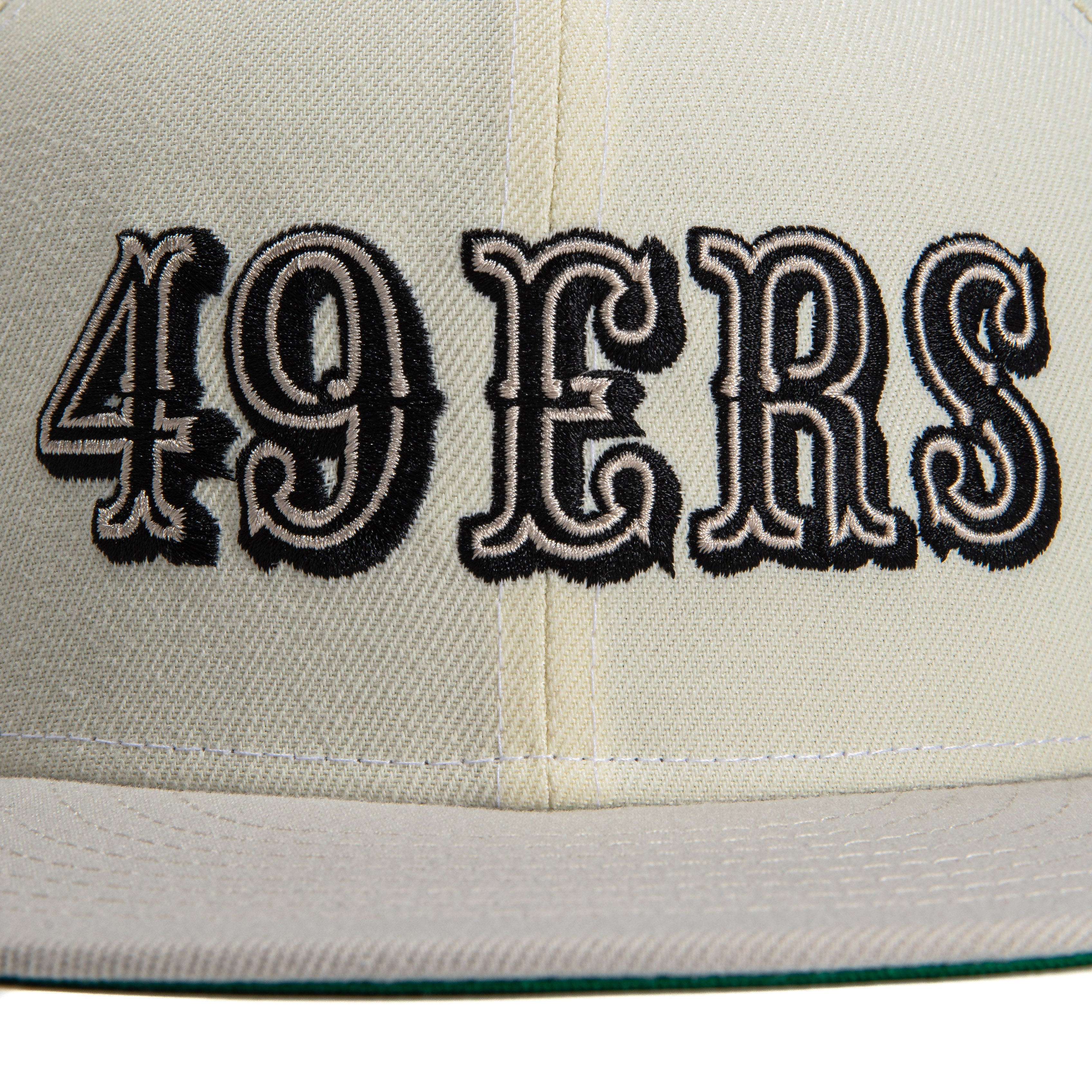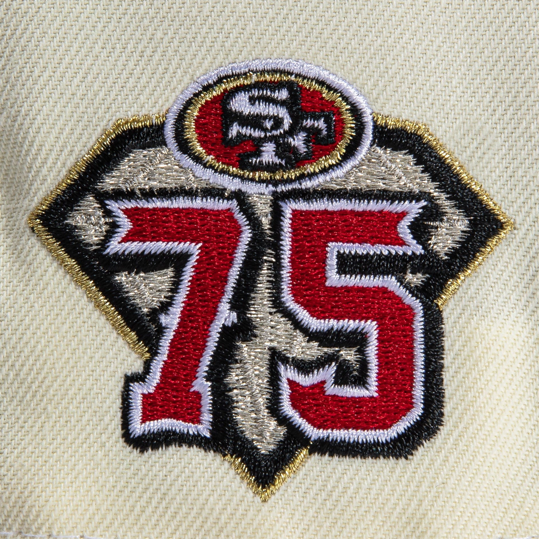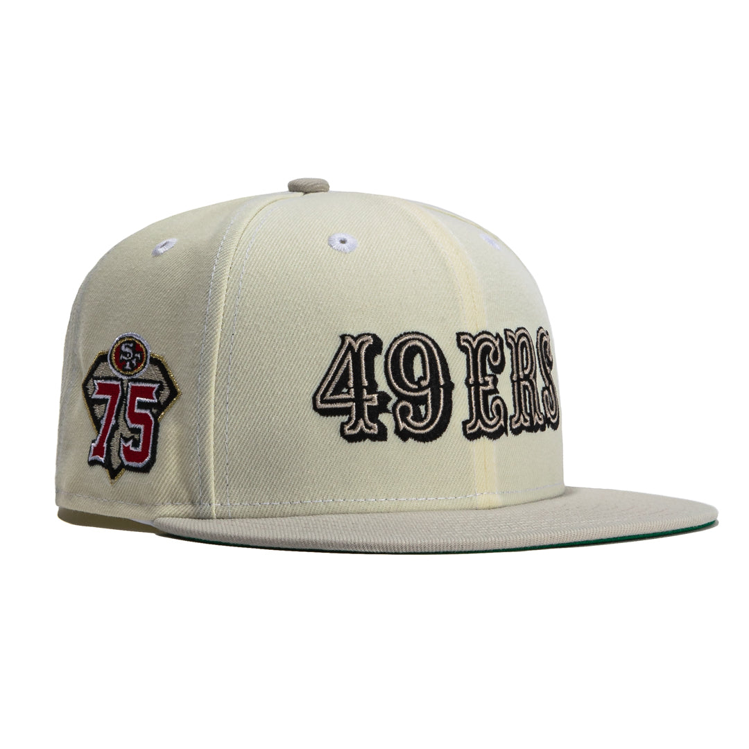 This New Era Chrome San Francisco 49ers 75th Anniversary 59FIFTY Fitted Hat is a Hat Club Exclusive. It has a chome six panel structured high crown and embroidered eyelets with a stone fabric squatchee button. The fitted cap has a stone flat bill with a green undervisor and white sweatband. The front panel features the San Francisco 49ers logo embroidery and a _ side patch embroidery on the right panel. The left panel of the fitted displays the New Era logo and the official NFL logo embroidery on the rear crown.