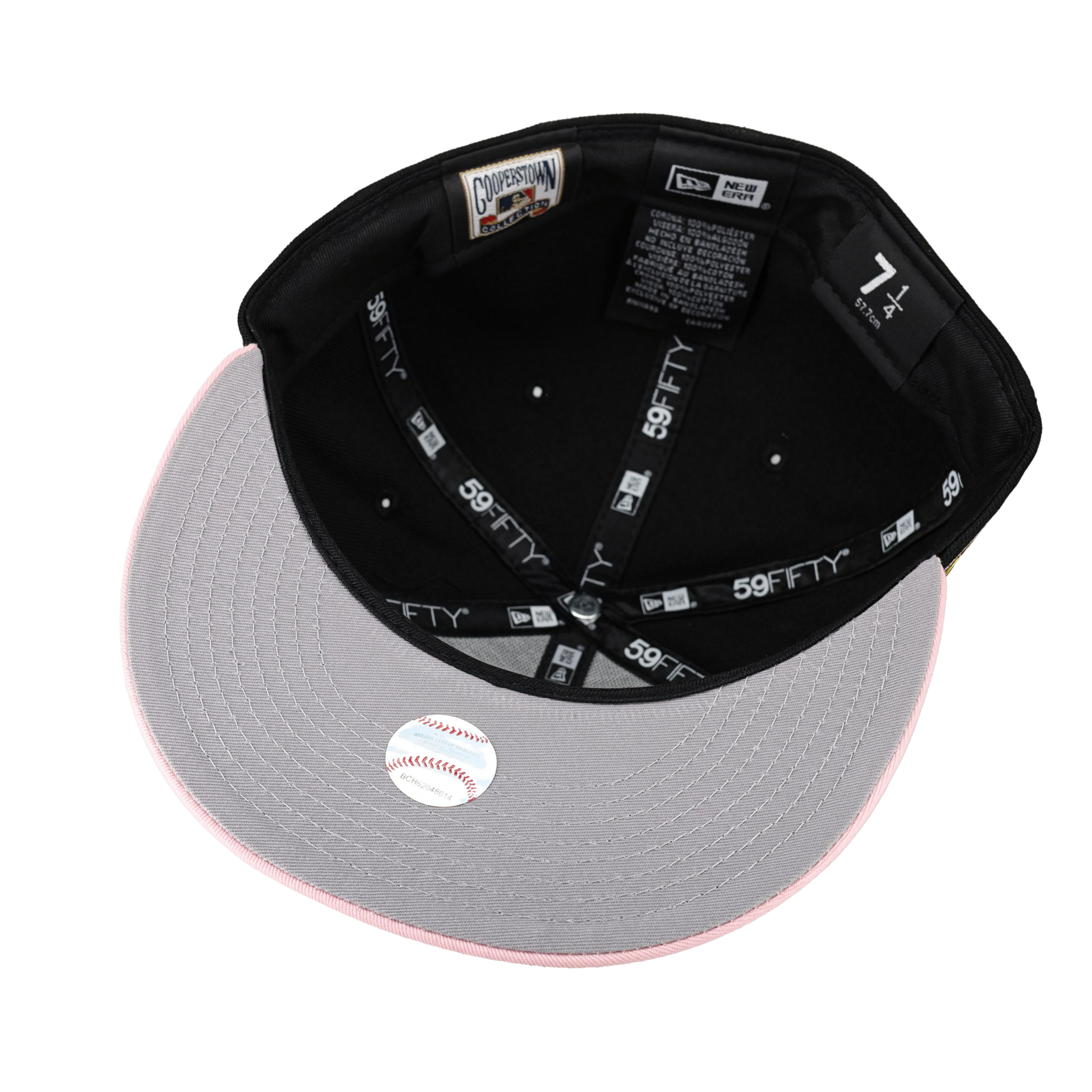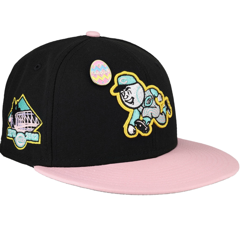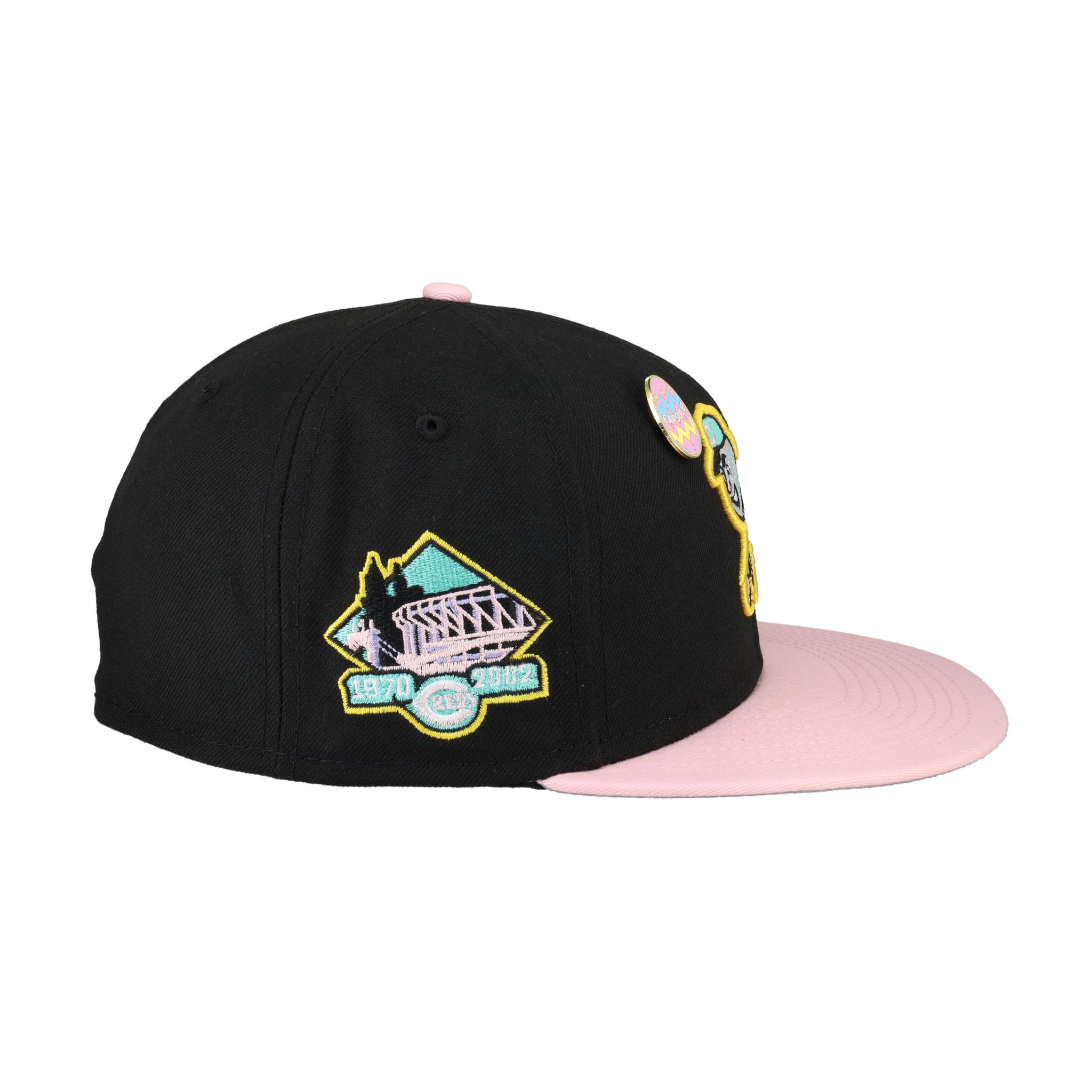 This New Era Cincinnati Reds Easter 1970-2002 Patch 2023 59FIFTY Fitted Hat was released by Capsule. The fitted has a black six panel structured high crown and embroidered eyelets with a pink fabric squatchee button. The flat bill of the fitted cap is pink with a grey undervisor and a black sweatband. The front panel features the Cincinnati Reds logo embroidery with a 1970-2002 side patch on the right panel. The left panel of the fitted displays the New Era logo and the official MLB Batterman logo on the rear-crown .