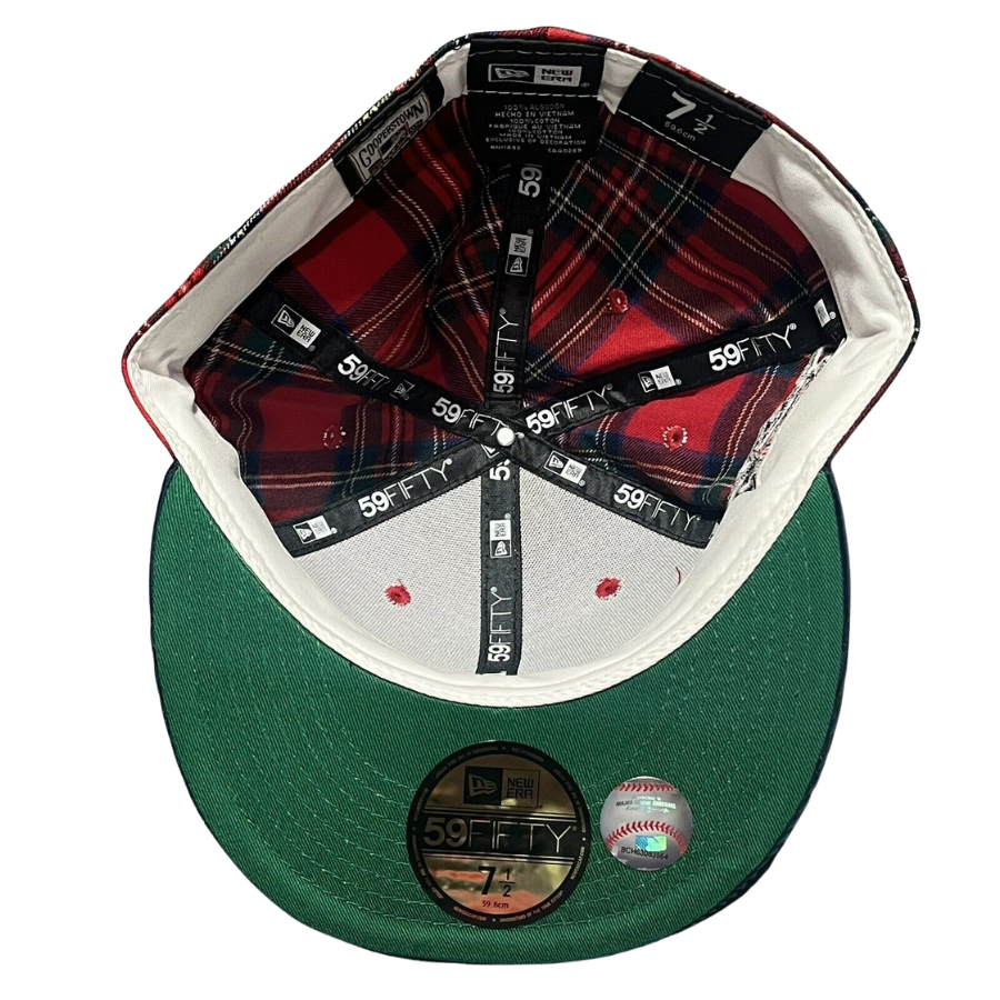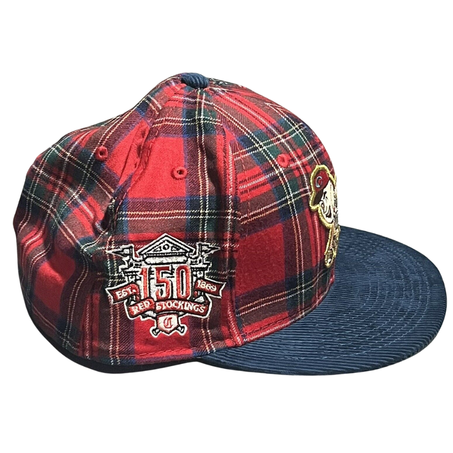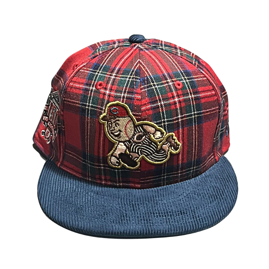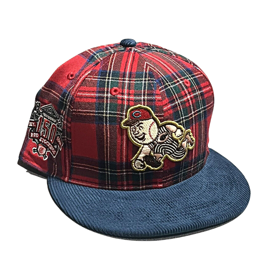This New Era Cincinnati Reds 'Tartan Plaid' 59FIFTY Fitted Hat was released by My Fitteds. The fitted has a tartan plaid six panel structured high crown, embroidered eyelets and fabric squatchee button. The fitted cap also has a navy corduroy flat bill with a green undervisor and white sweatband. The front panel features the Mr. Redlegs logo embroidery and a 150th Anniversary side patch embroidery on the right panel. The left panel of the fitted displays the New Era logo and the official MLB Batterman embroidery on the rear crown.