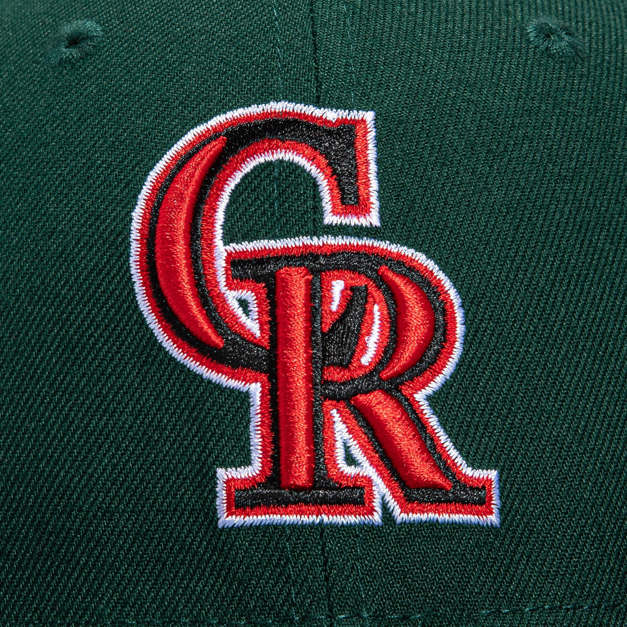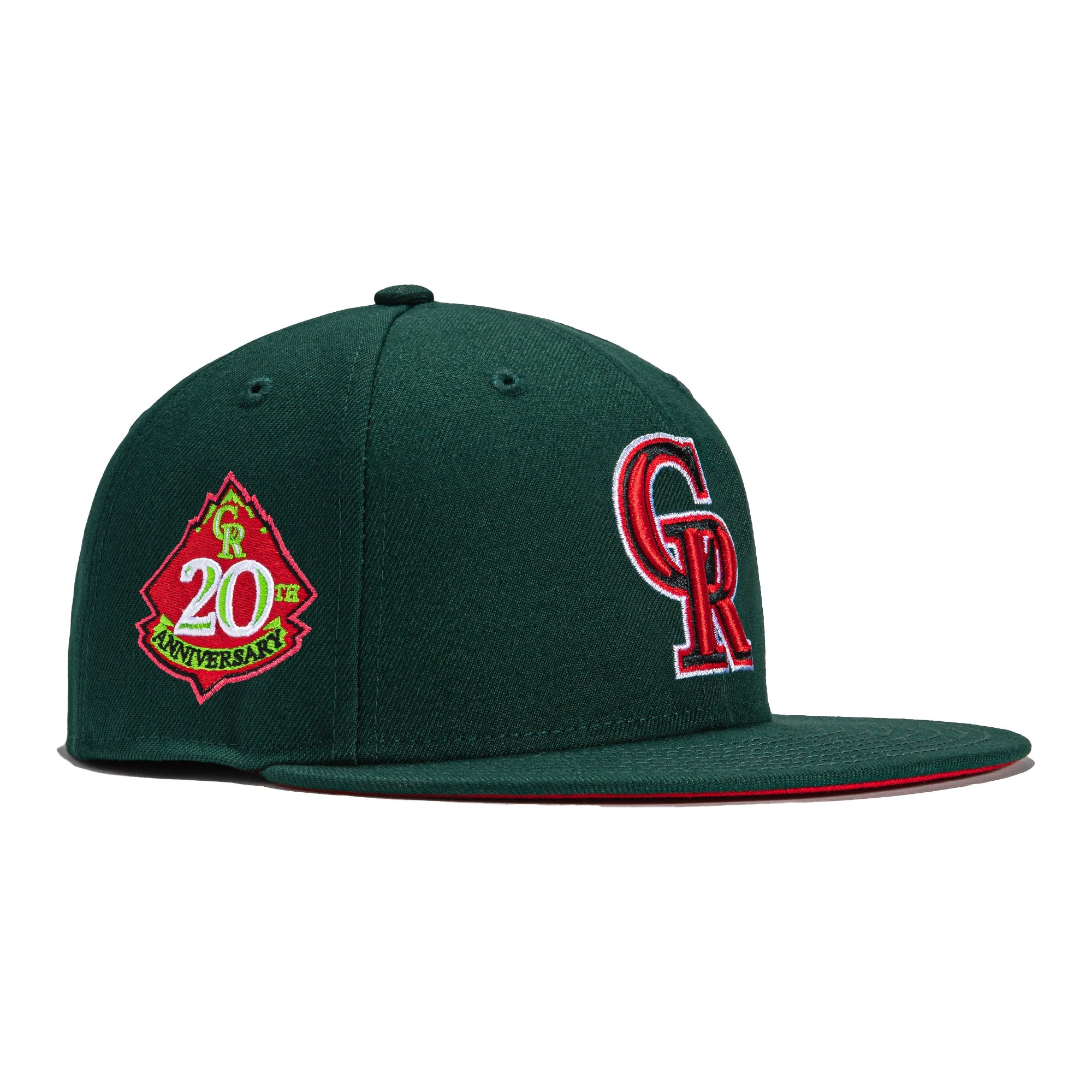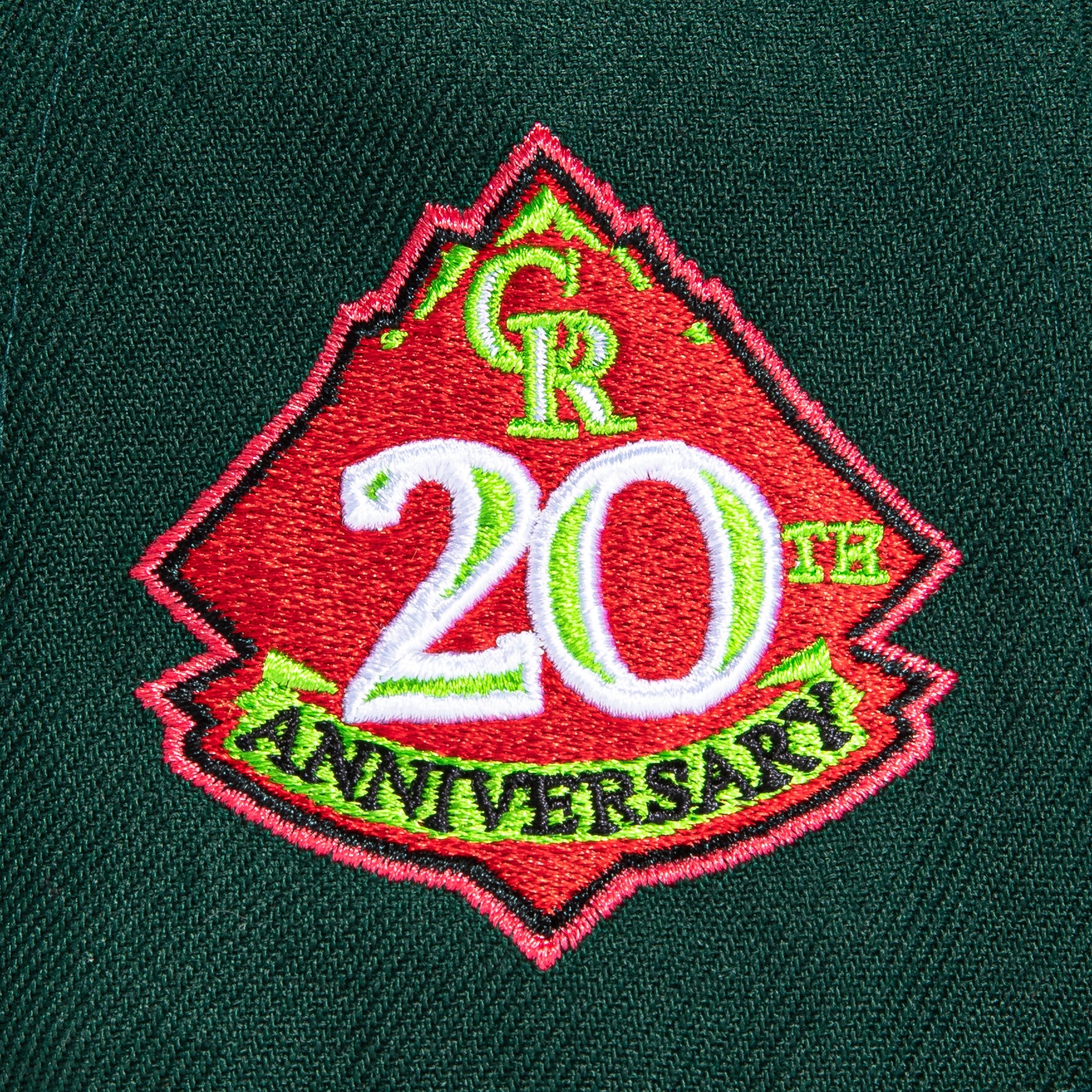 This New Era Colorado Rockies 20th Anniversary 'Watermelon' 59FIFTY Fitted Hat was originally released by Hat Club. The fitted has a dark green six panel structured high crown, embroidered eyelets and fabric squatchee button. The flat bill of the fitted cap is also dark green with a red bottom undervisor. The front panel features the Colorado Rockies logo embroidery and a side patch embroidered on the right panel. The left panel of the fitted displays the New Era logo and the official MLB insignia embroidered on the rear crown. The fitted hat colorway is inspired by the colors of a watermelon.