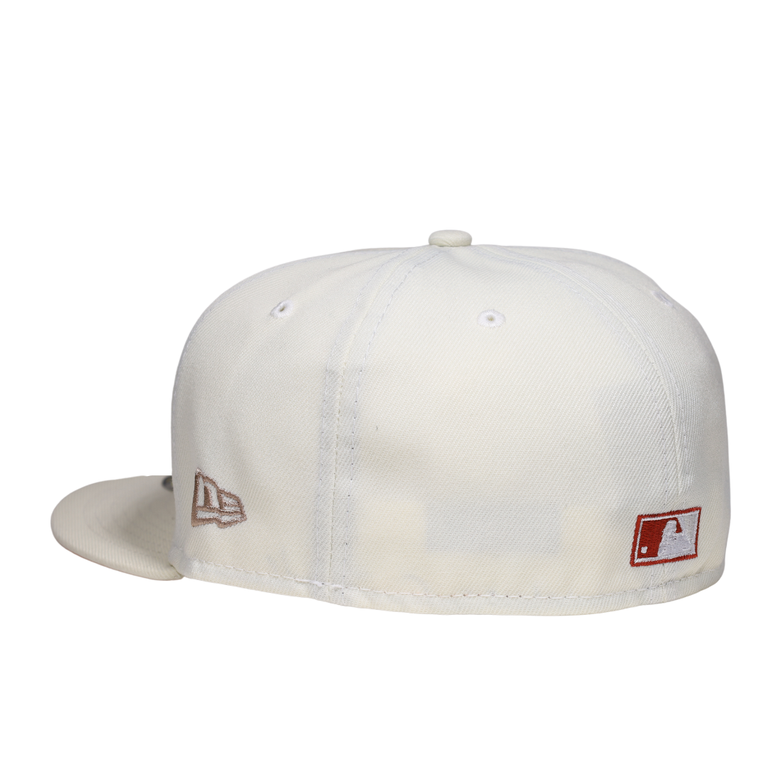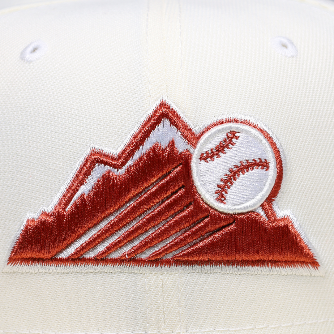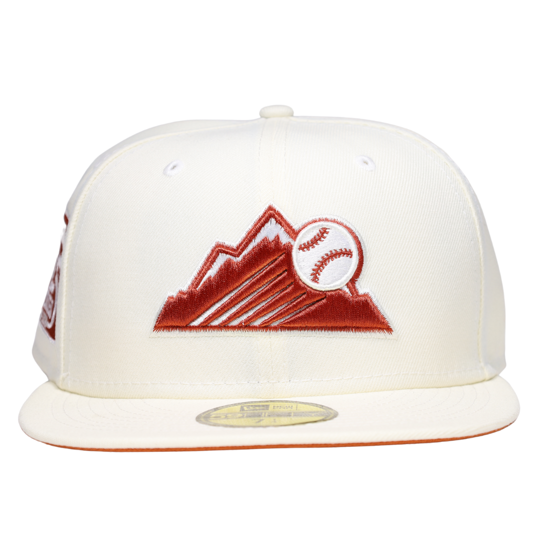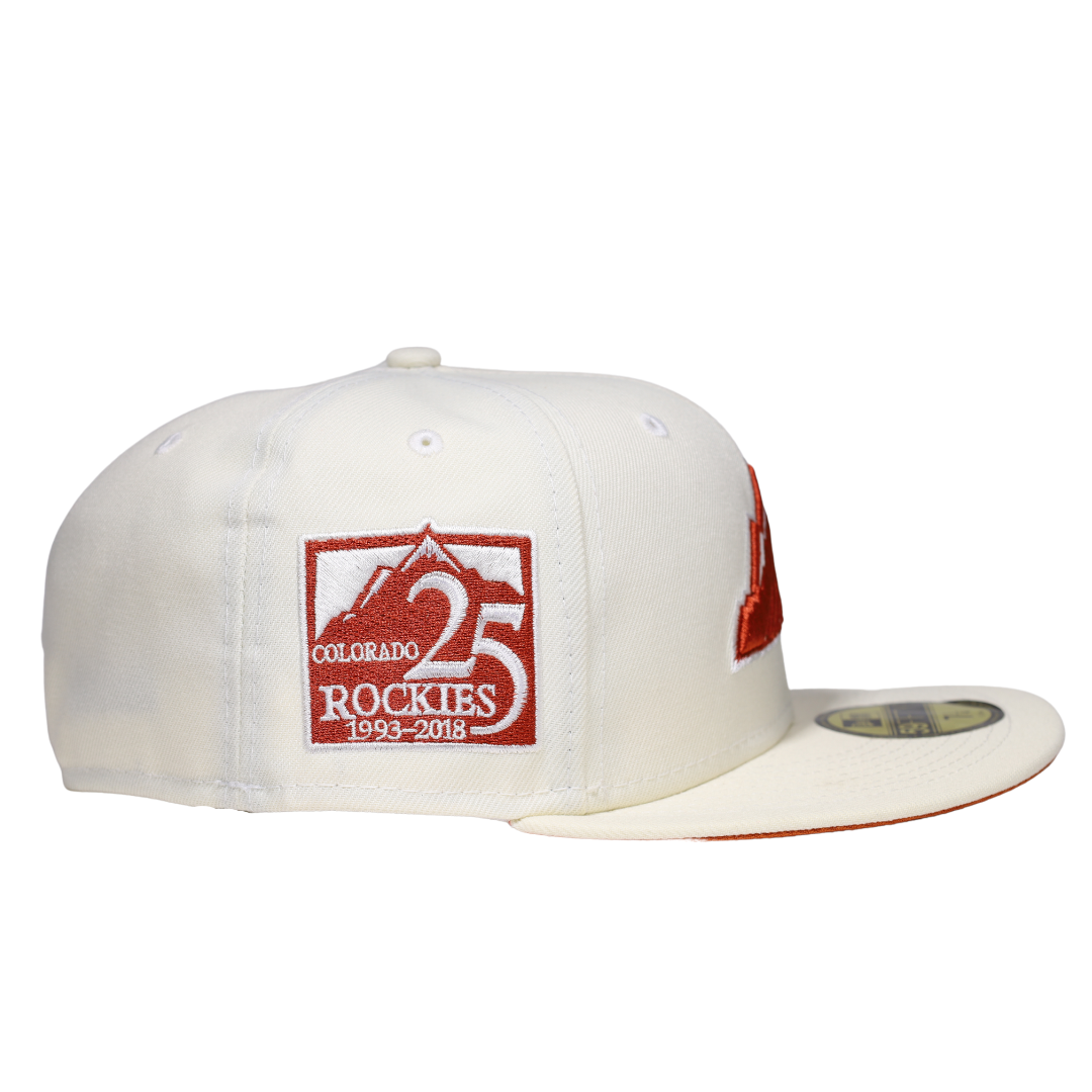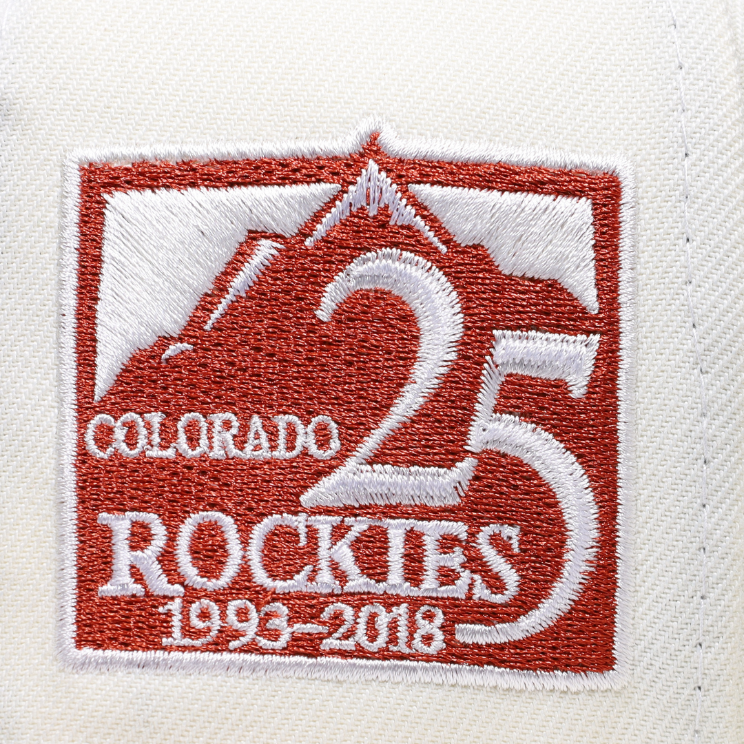 This New Era Colorado Rockies 25Th Anniversary 59FIFTY Fitted Hat has a six panel structured high crown and embroidered eyelets with a fabric squatchee button. The fitted cap has a flat bill with a sweatband. The front panel features the Colorado Rockies logo embroidery.
