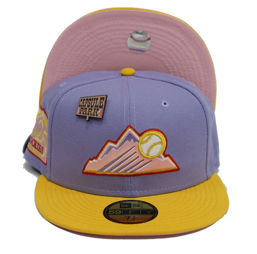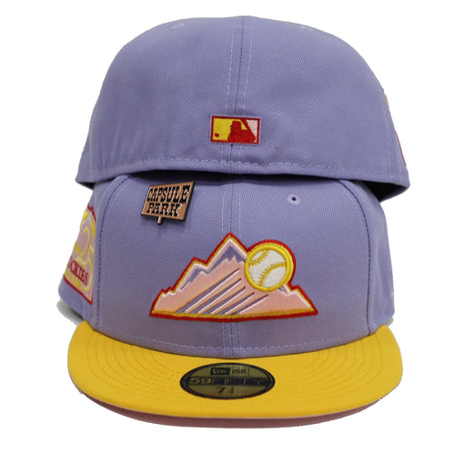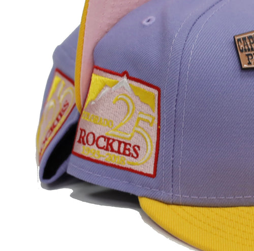 This New Era Colorado Rockies 'Capsule Park' 59FIFTY fitted hat is a Capsule Hat exclusive release. The fitted cap has a lavender six panel structured high crown and embroidered eyelets with a yellow fabric squatchee button and flat bill. The undervisor of the fitted cap is soft pink with a black sweatband. The front panel features the Colorado Rockies logo embroidered in a soft pink, lavender, white and yellow threads with a 25th Anniversary side patch embroidery on the right panel. The fitted hat colorway was inspired by Towelie a character from the popular cartoon South Park.