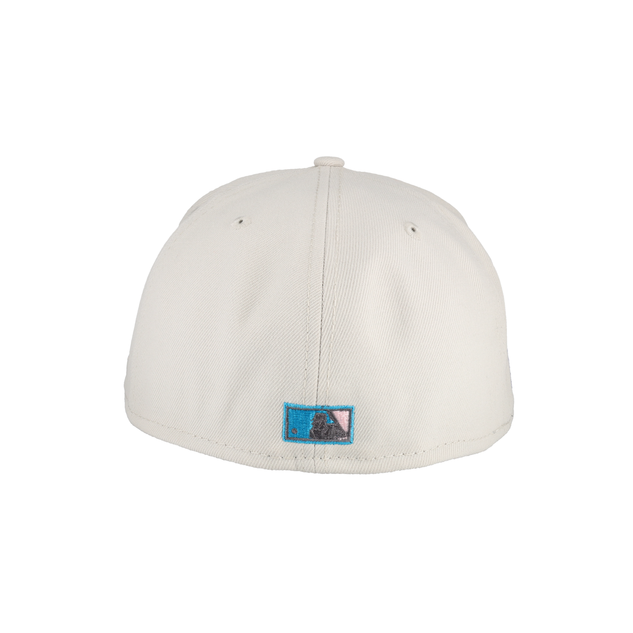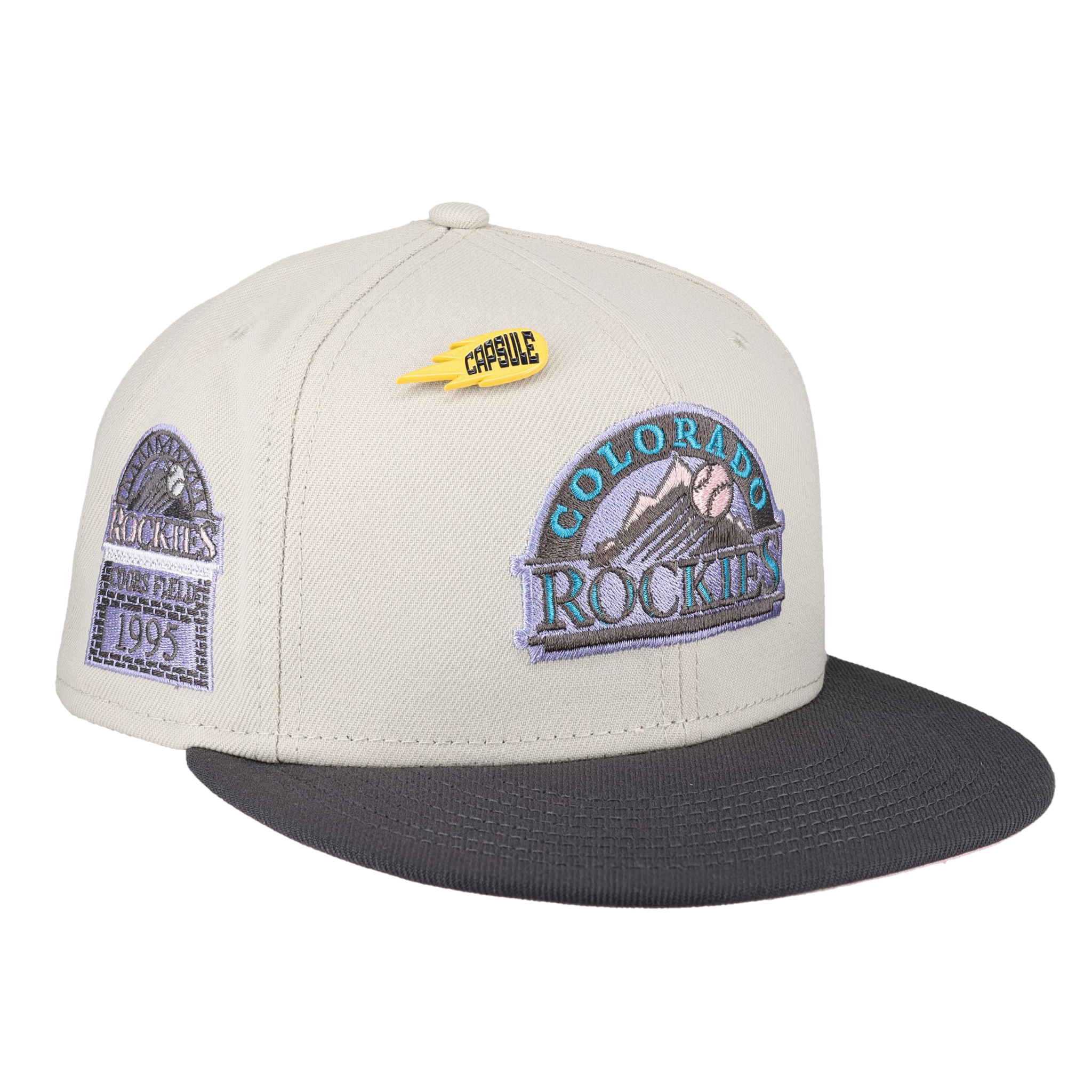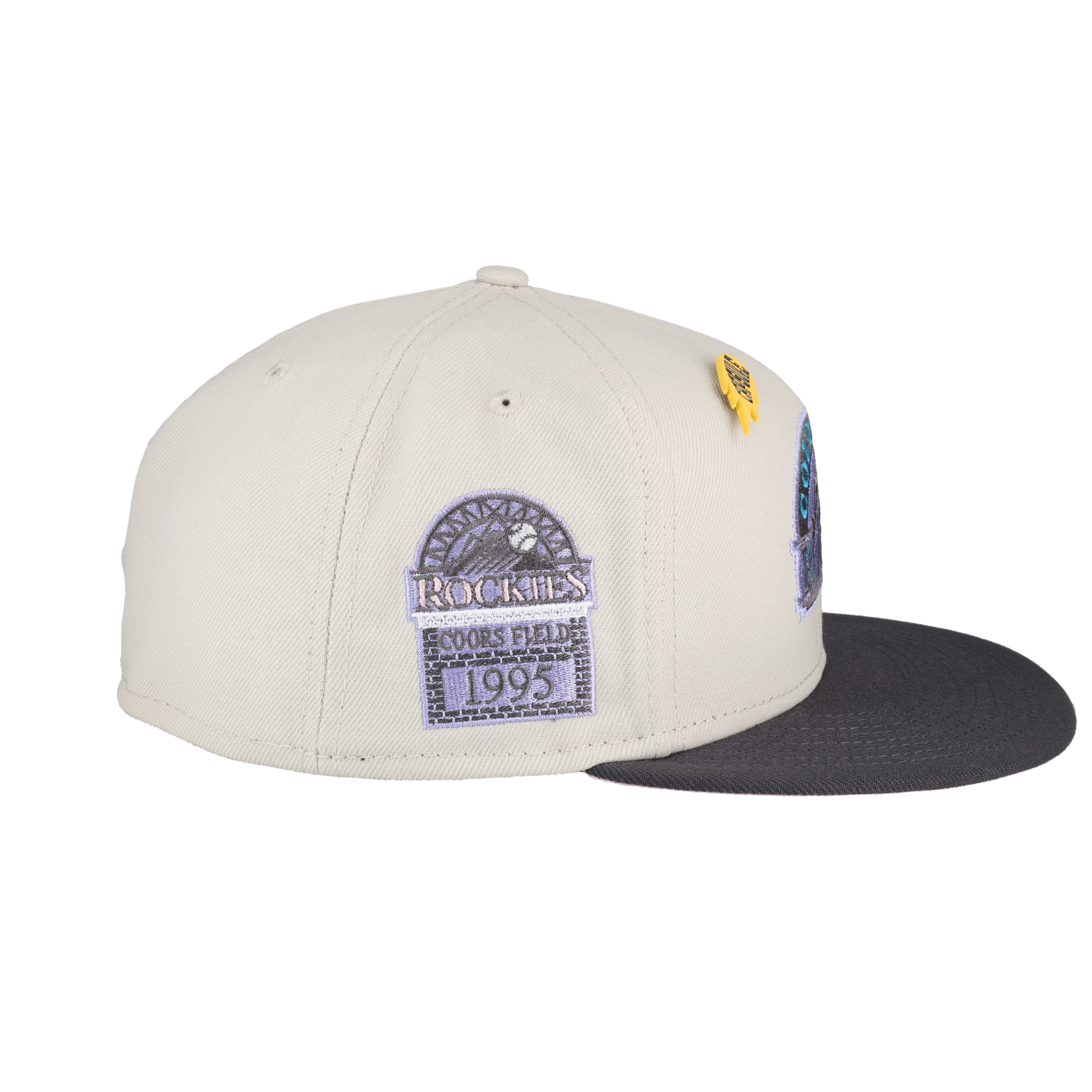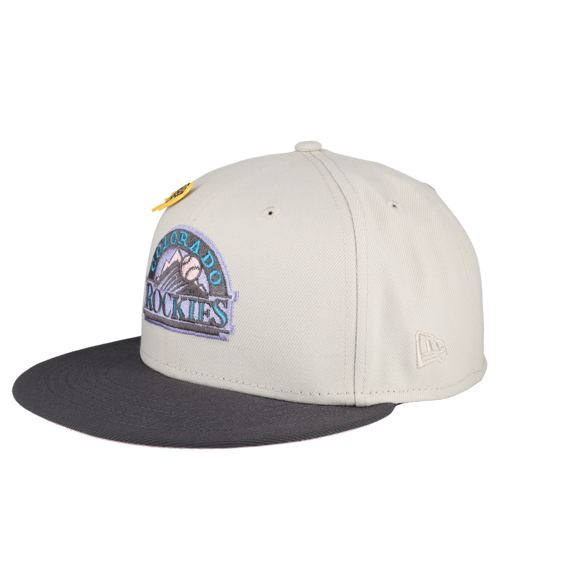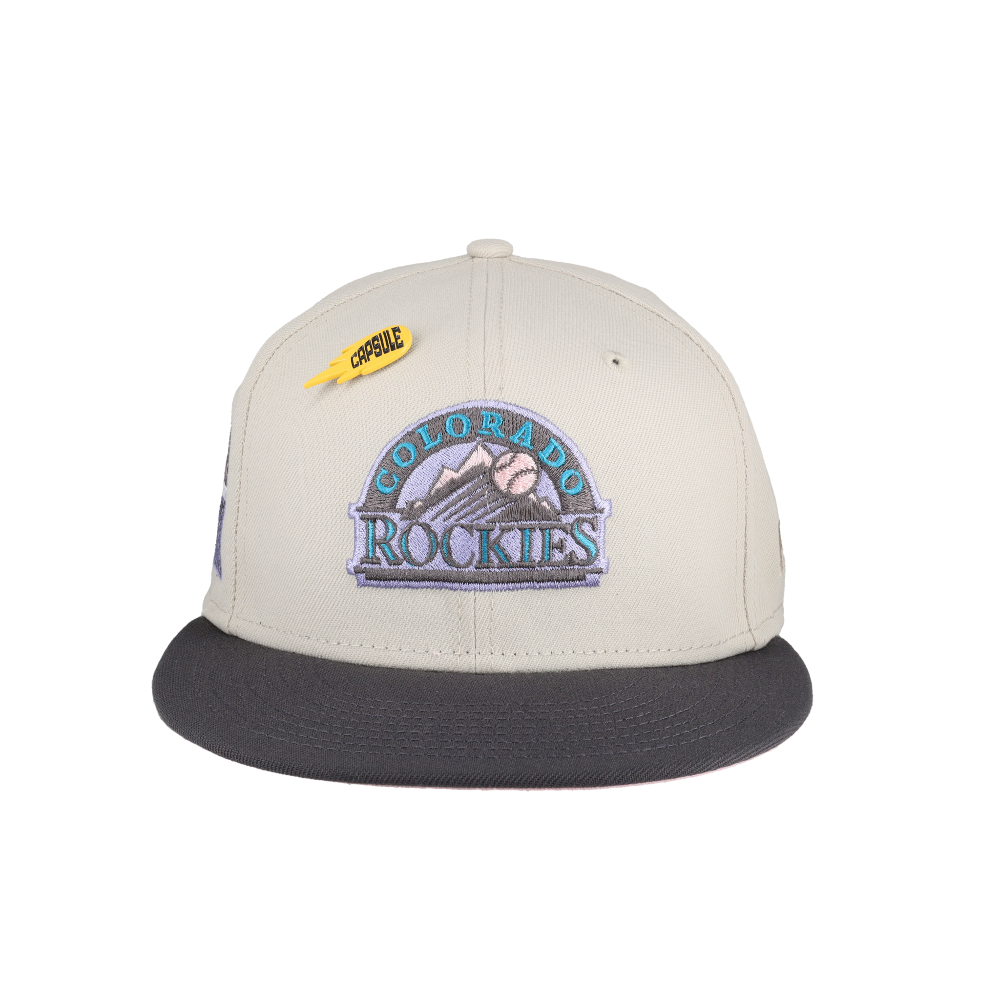 This New Era Colorado Rockies 'Comet' 1995 Coors Field 2023 59FIFTY Fitted Hat was released by Capsule. The fitted has a chrome six panel structured high crown, embroidered eyelets and fabric squatchee button. The flat bill of the fitted cap is black with a pink bottom undervisor. The front panel features the Colorado Rockies logo embroidery and a side patch embroidered on the right panel. The left panel of the fitted displays the New Era logo and the official MLB Batterman logo embroidered on the rear crown.