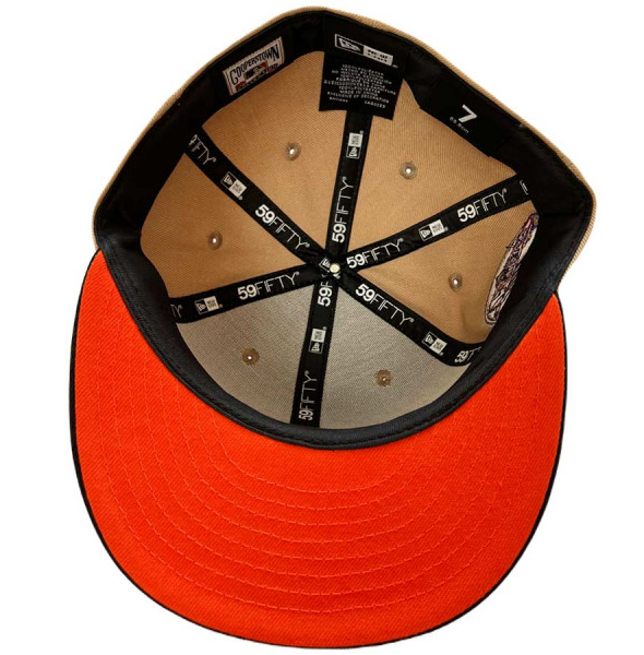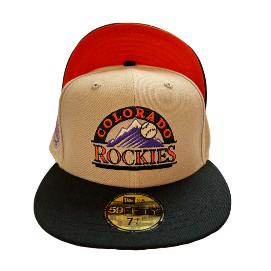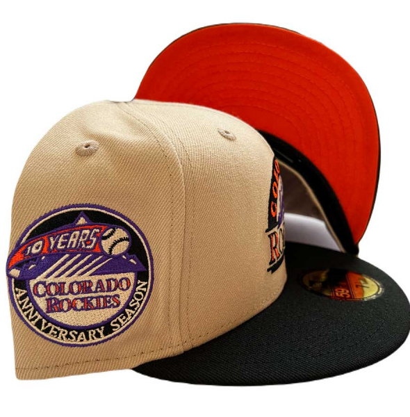 This New Era Colorado Rockies 'Strain Pack Train Wreck' 10 Year Anniversary 59FIFTY Fitted Hat has a tan six panel structured high crown and embroidered eyelets with a black fabric squatchee button. The fitted cap has a black flat bill with a orange undervisor. The front panel features the Colorado Rockies logo embroidery and a 10th Anniversary side patch embroidery on the right panel. The left panel of the fitted displays the New Era logo and the official MLB logo embroidery on the rear crown.