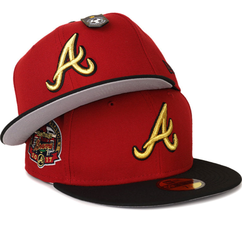 This New Era Atlanta Braves 'Golden Goal' 59FIFTY fitted hat has a red six panel structured high crown, red embroidered eyelets and a red fabric squatchee button. The fitted cap also has a black flat bill with a gray undervisor and white sweatband. The front panel features the Atlanta Braves logo embroidery and a side patch embroidery on the right panel. The left panel of the fitted displays the New Era logo and the rear crown features the official MLB logo embroidery.