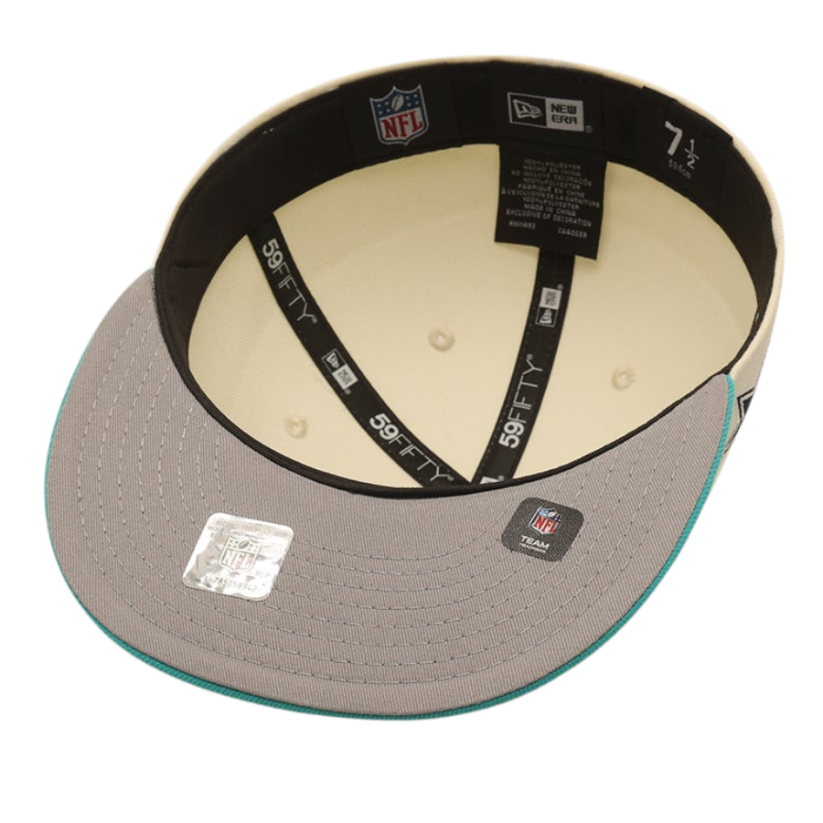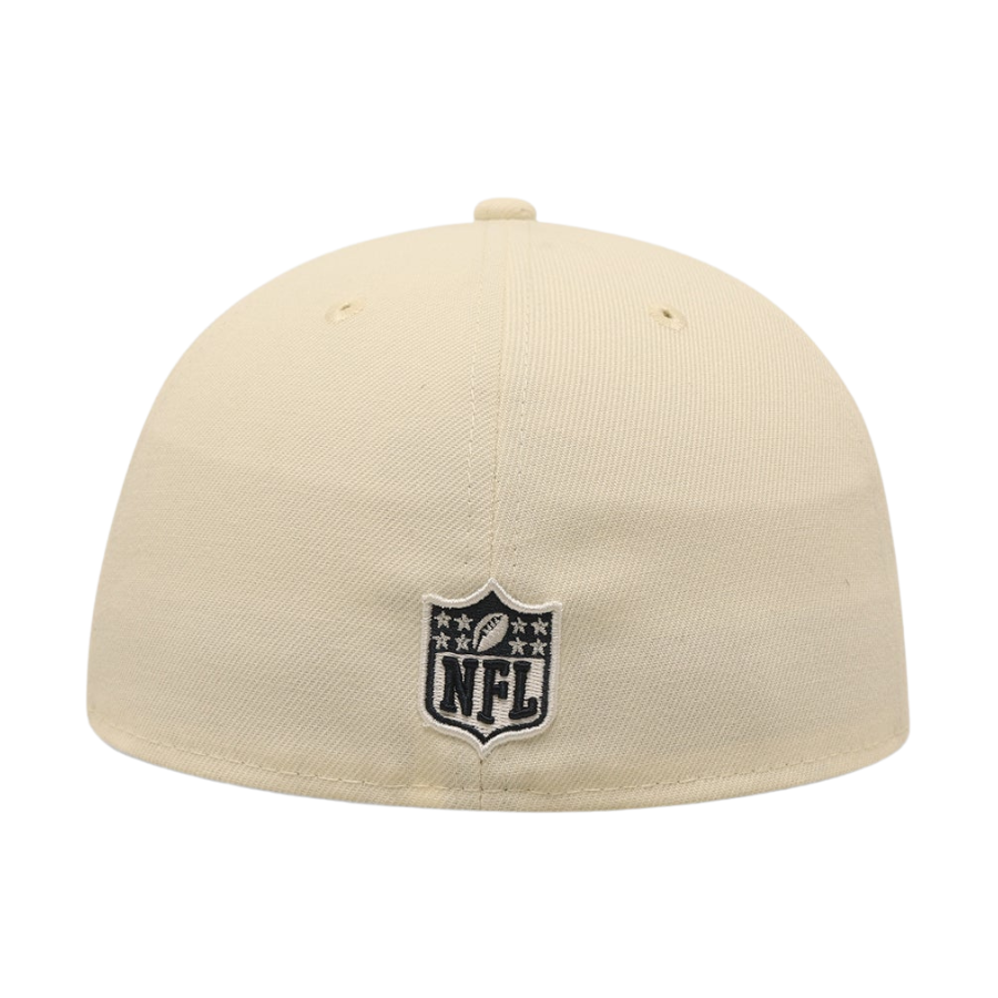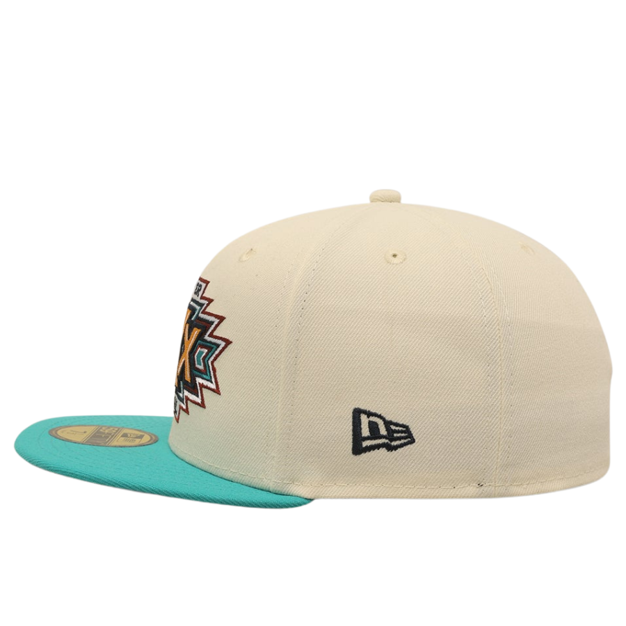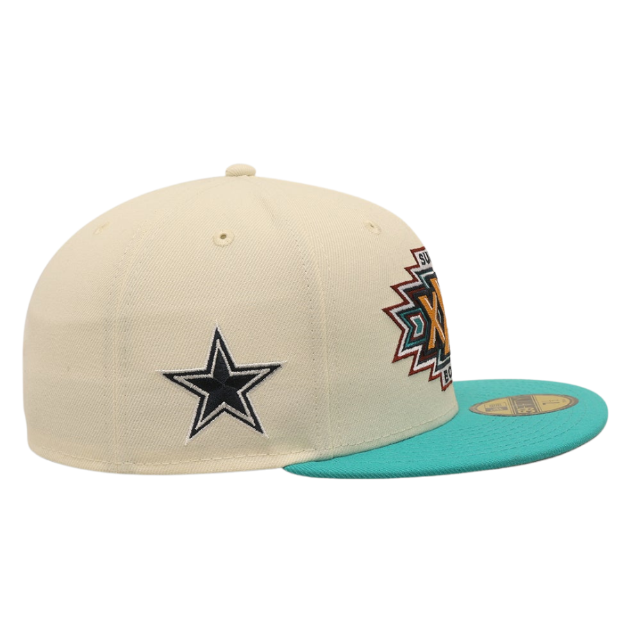 This New Era Dallas Cowboys '1996 Super Bowl' Chrome White 2023 59FIFTY Fitted Hat was released by Culture Kings. The fitted has a chrome six panel structured high crown and embroidered eyelets with a chrome fabric squatchee button. The flat bill of the fitted cap is also teal with a gray undervisor and black sweatband. The front panel features a Super Bowl logo embroidery and the New Era "Fly Your Own Flag" logo on the left panel. The rear crown has the official NFL logo on display.