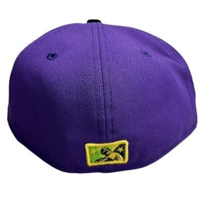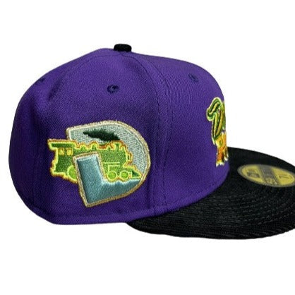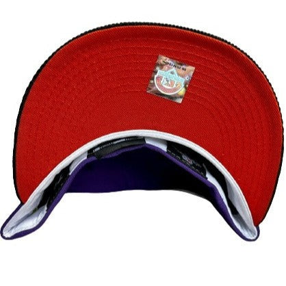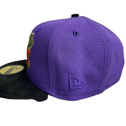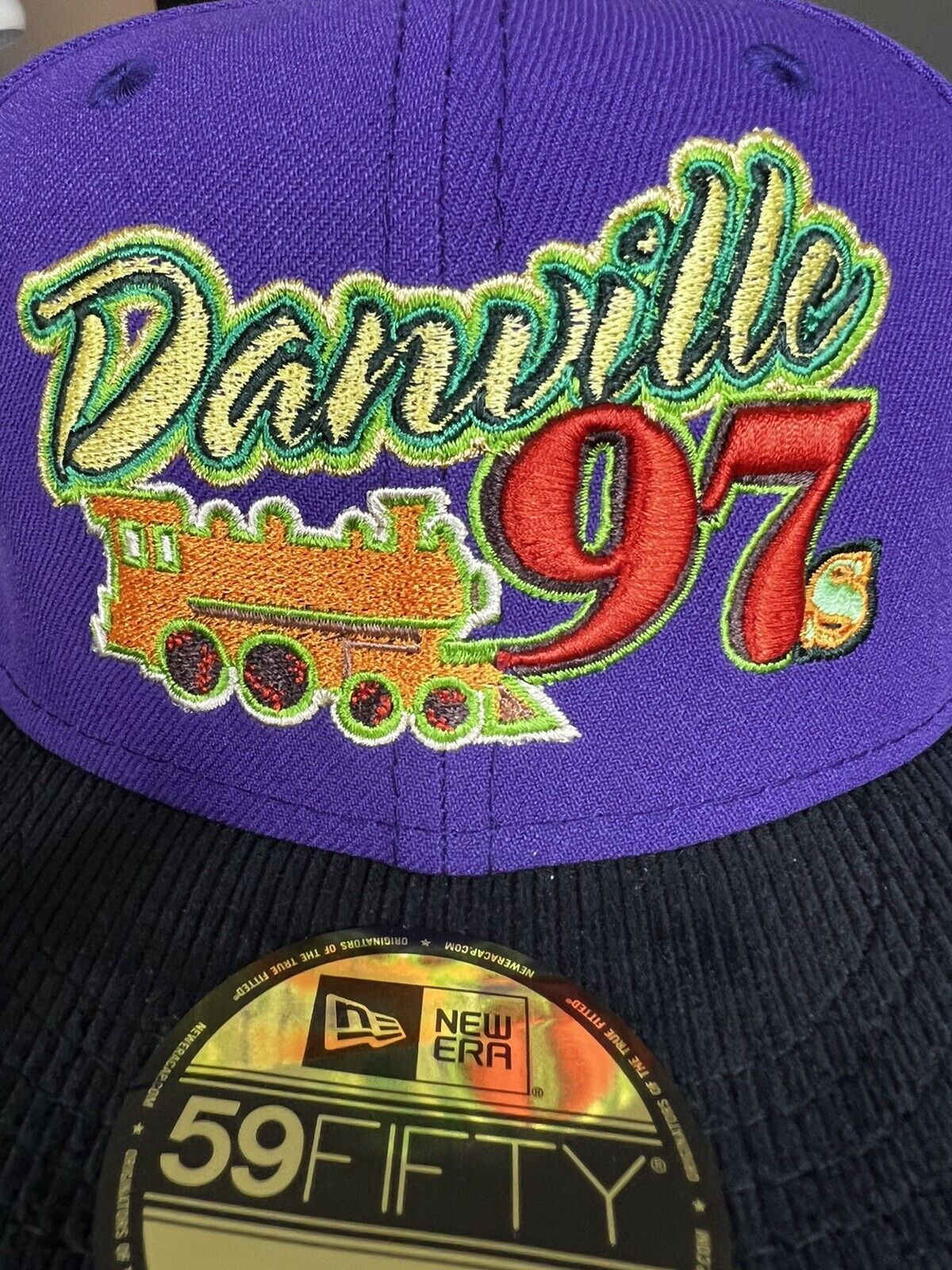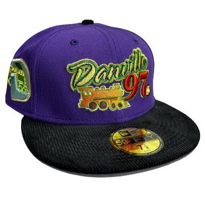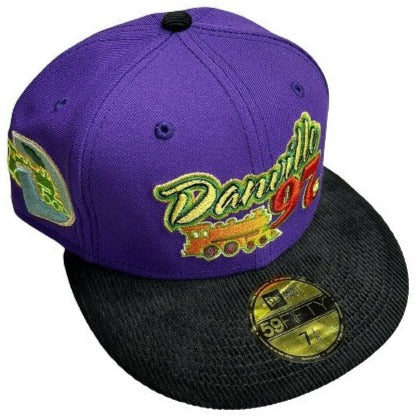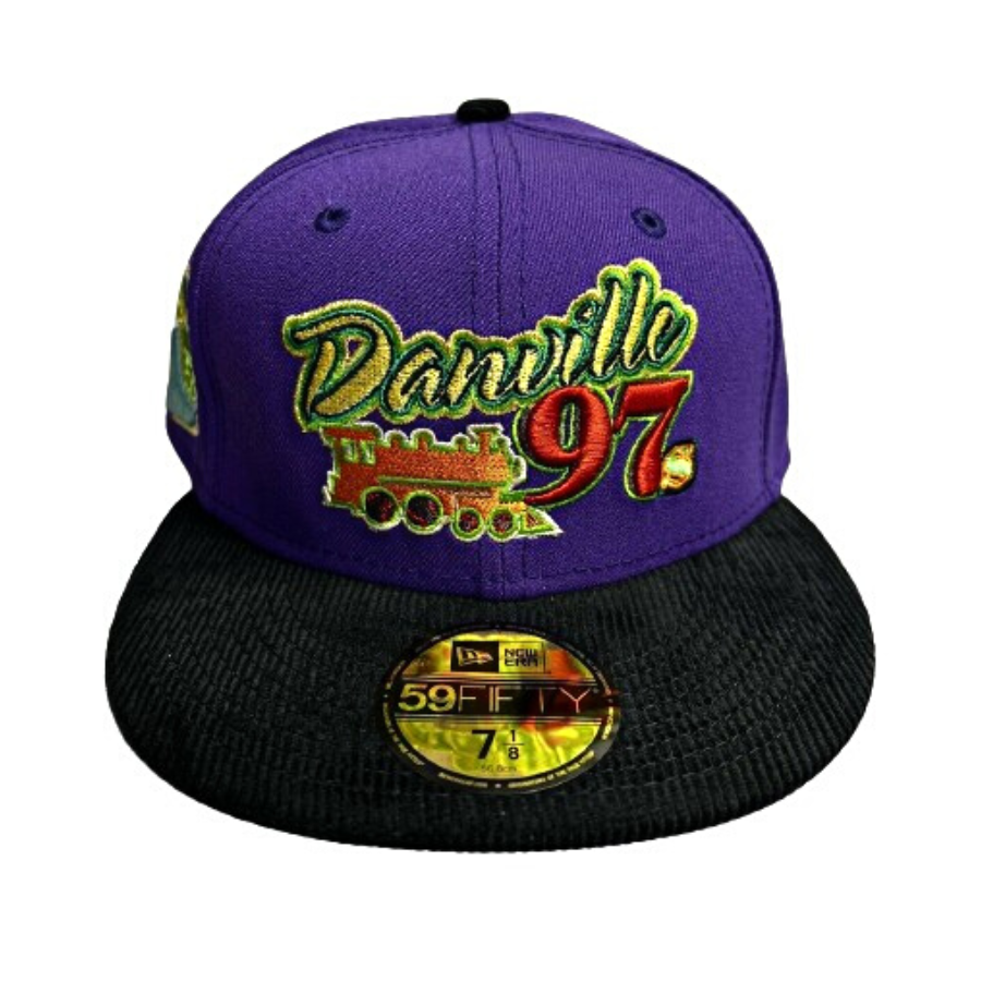 Jet Grind Radio 59FIFTY fitted hat is a My Fitteds exclusive release. The fitted has a purple six panel structured high crown and embroidered eyelets with a black fabric squatchee button and black corduroy flat bill. The undervisor of the fitted cap is red with a white sweatband. The front panel features the Danville 97's logo embroidery. The fitted hat was inspired by Jet Grind Radio (released as Jet Set Radio in Europe) a pro skater video game for Game Boy Advance.