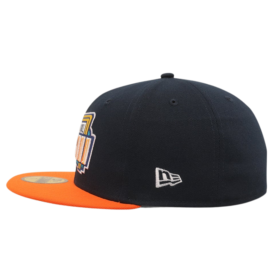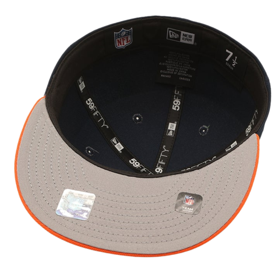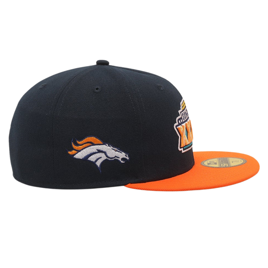 This New Era Denver Broncos '1999 Super Bowl' Dark Blue 2023 59FIFTY Fitted Hat was released by Culture Kings. The fitted has a navy blue six panel structured high crown and embroidered eyelets with a navy blue fabric squatchee button. The flat bill of the fitted cap is also orange with a gray undervisor and black sweatband. The front panel features a Super Bowl logo embroidery and the New Era "Fly Your Own Flag" logo on the left panel. The rear crown has the official NFL logo on display.