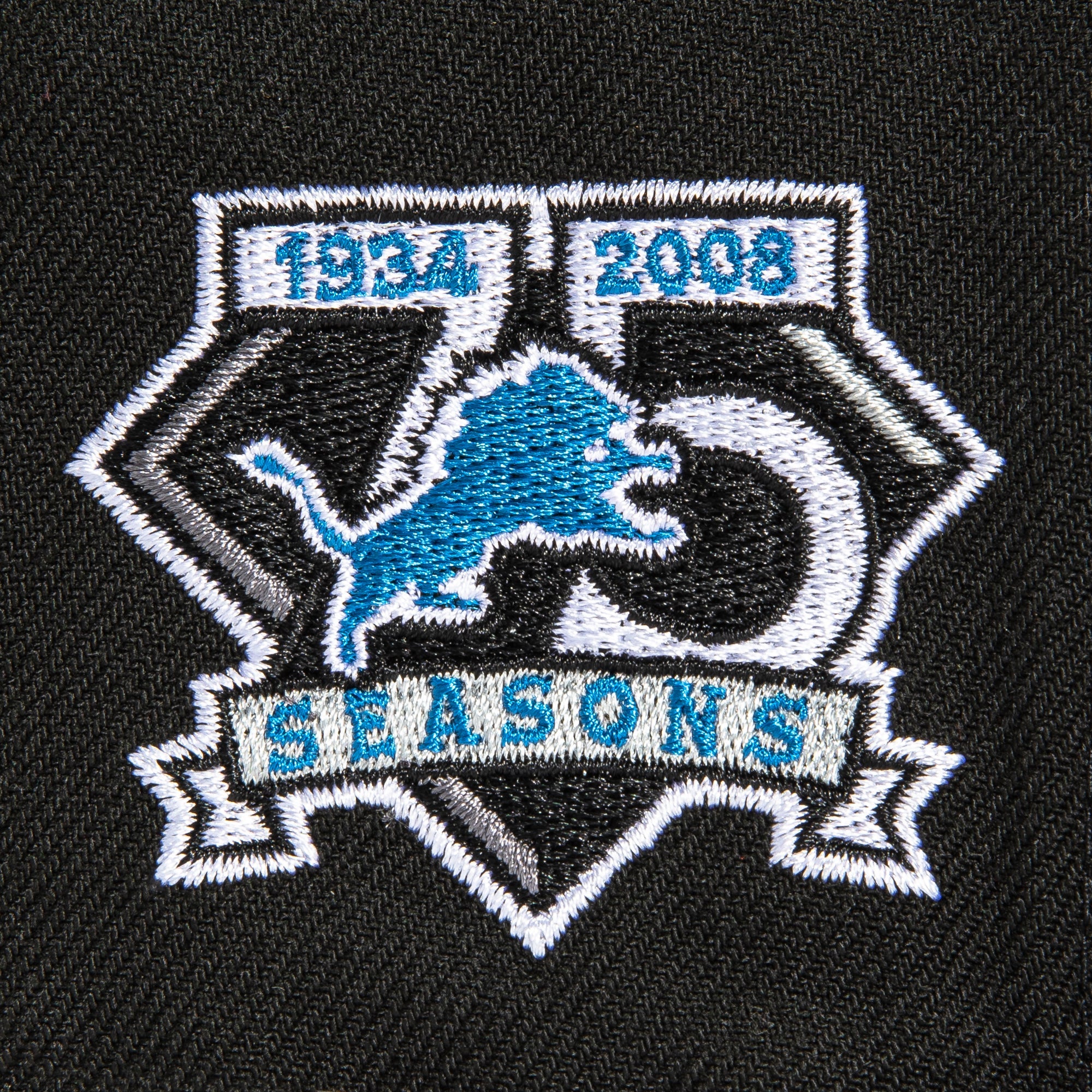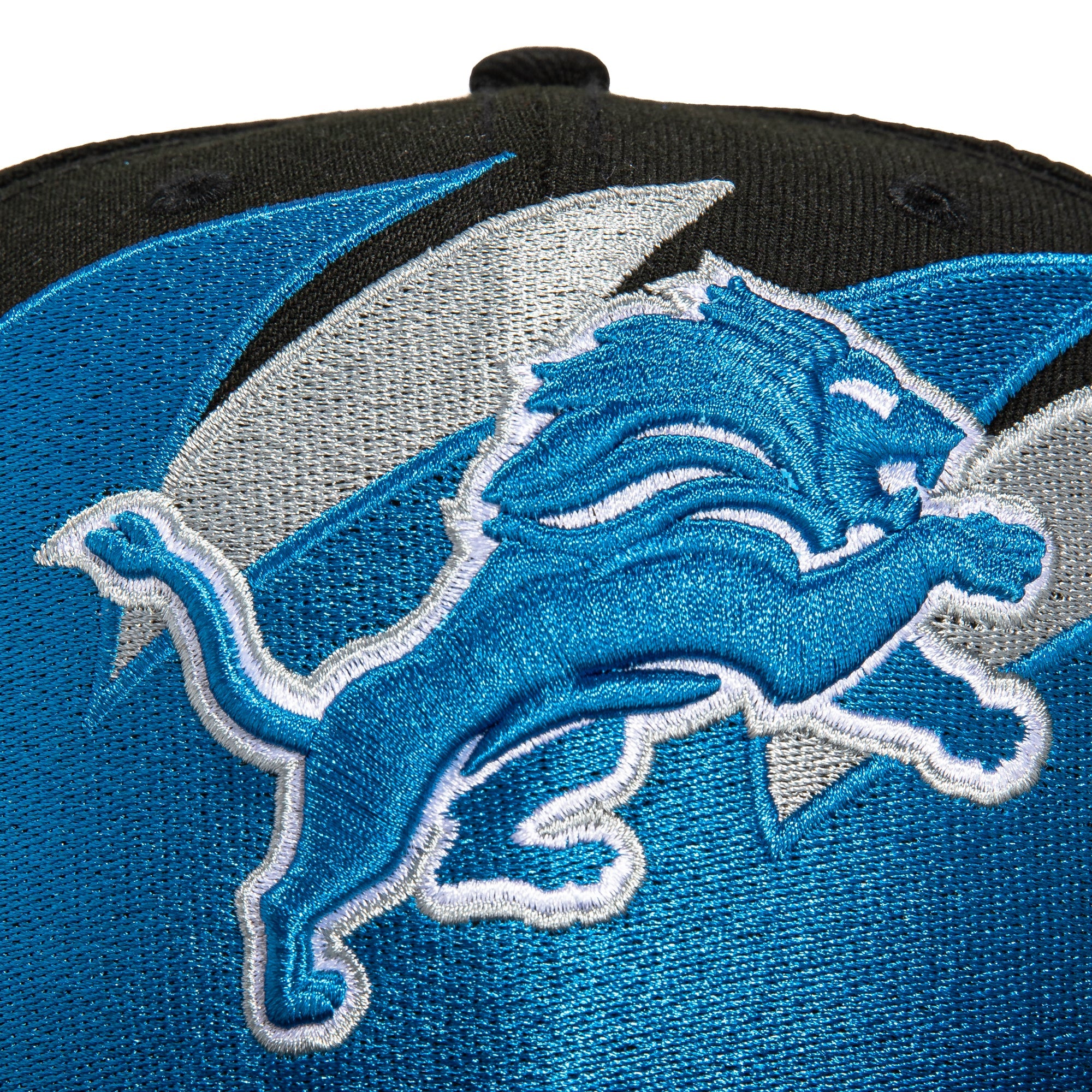 This New Era Detroit Lions SharkTooth 75th Anniversary 59FIFTY Fitted Hat was released by Hat Club. The fitted has a black six panel structured high crown, fabric squatchee button and brim with a grey undervisor. The front panel features a shark tooth pattern with the Detroit Lions logo embroidery. The left panel includes the New Era logo embroidery and the official NFL shield on the rear crown.