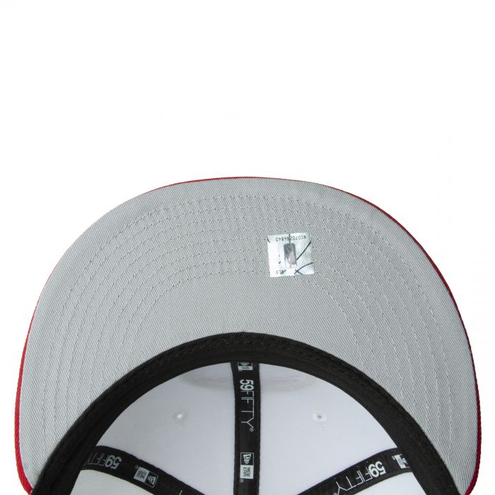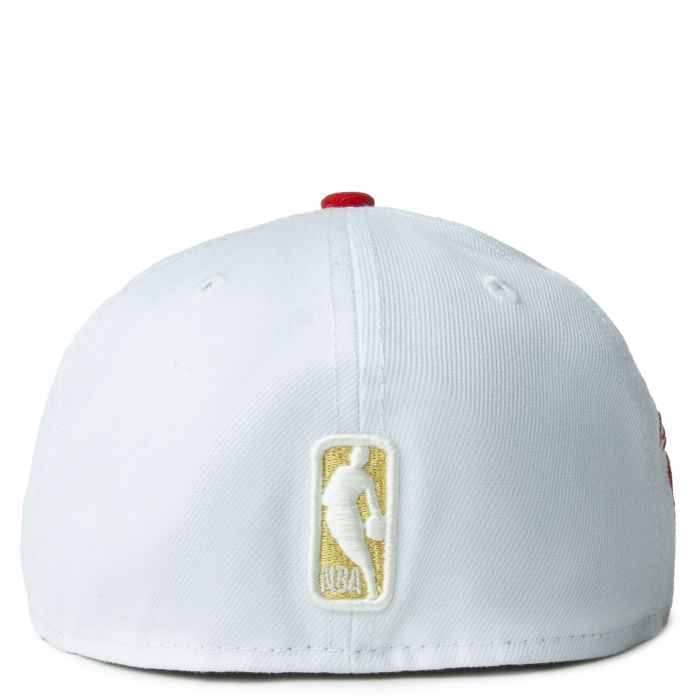 This New Era Detroit Pistons White/Red/Gold 59FIFTY Fitted Hat was released by Karma Loop. The fitted has a white six panel structured high crown and embroidered eyelets with a red fabric squatchee button. The fitted cap also has a red flat bill with a grey undervisor and black sweatband. The front panel features the Detroit Pistons logo embroidery and a 65 side patch embroidery on the right panel. The left panel of the fitted displays the New Era logo and the official NBA logo embroidery on the rear crown.