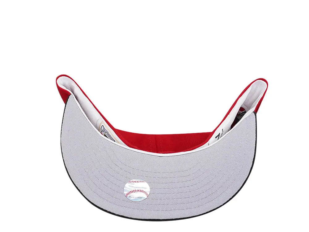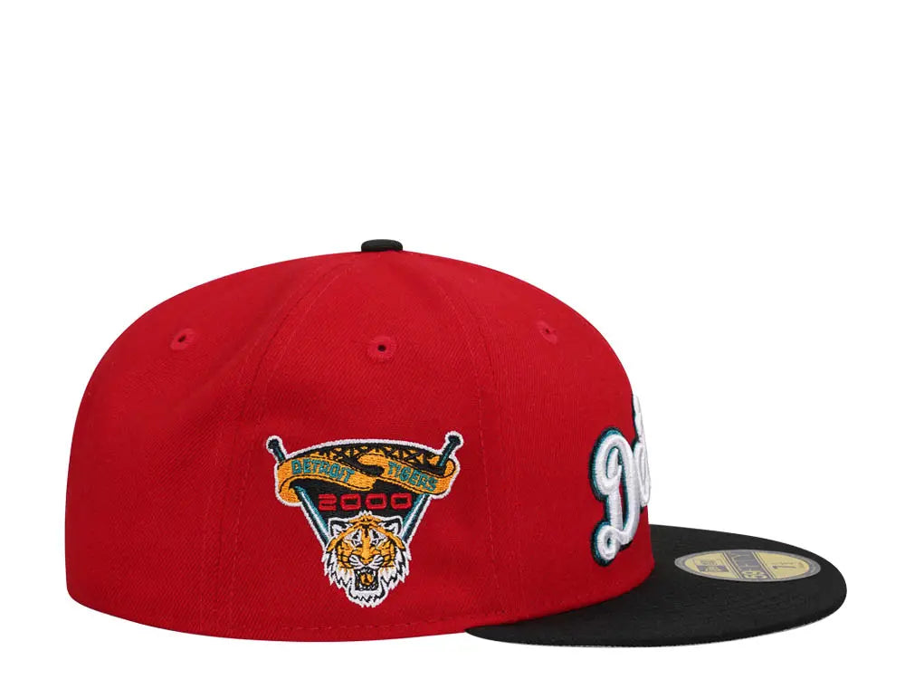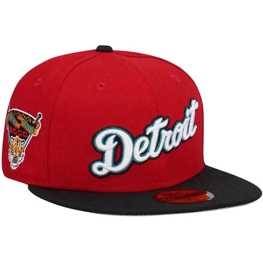 This New Era 59FIFTY Detroit Tigers fitted hat was released by Topperz store. The fitted has a red six panel structured high crown and embroidered eyelets with a black fabric squatchee button. The flat bill of the fitted is black with a grey undervisor. The front panel features a white stitched Detroit Tigers logo embroidery with a 2000 Comerica Park side patch on the right-wear side.