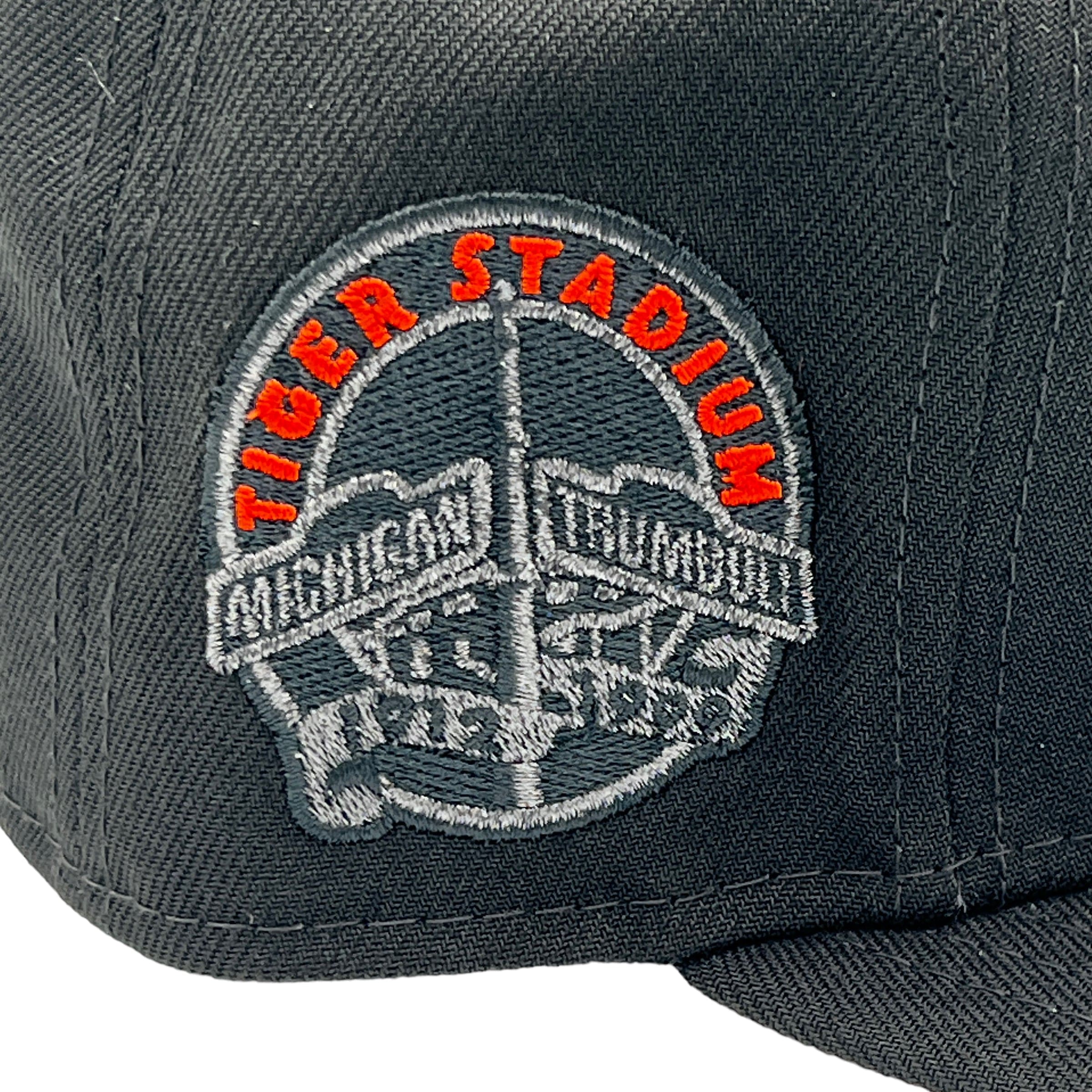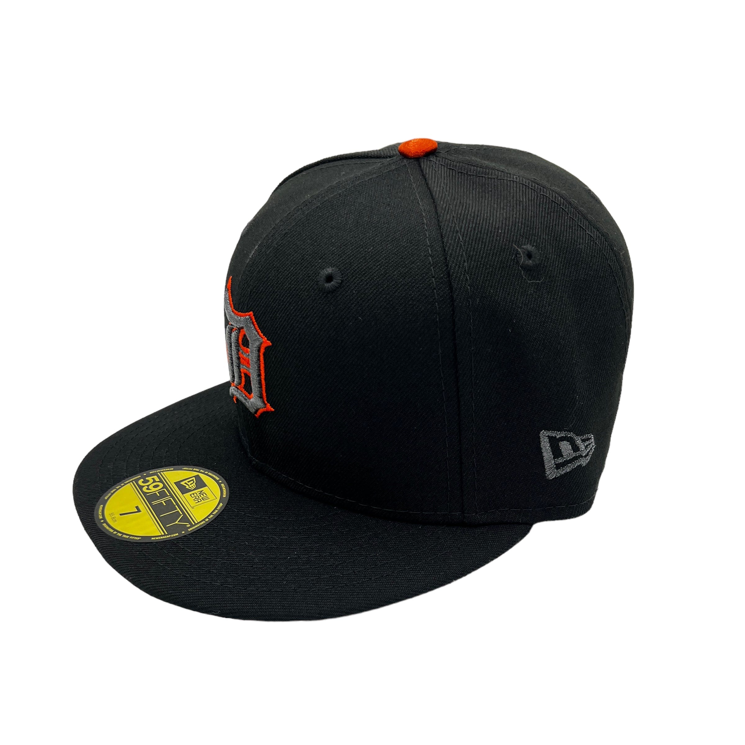 This Detroit Tigers 59FIFTY fitted hat was released by Pro Image Sports. The fitted has a black six panel structured high crown, embroidered eyelets and flat brim with a orange fabric squatchee button and orange undervisor. The front panel features the Detroit Tigers metallic logo embroidery with a matching side patch on the right panel. The left panel of the fitted displays the New Era logo and the official MLB Batterman embroidery on the rear crown.