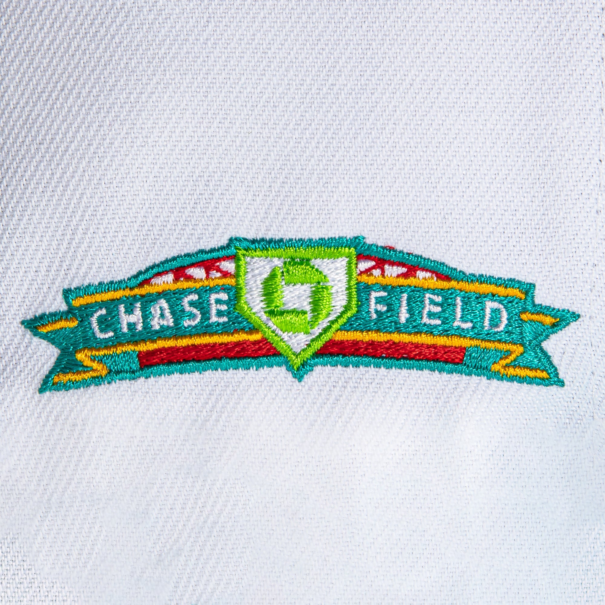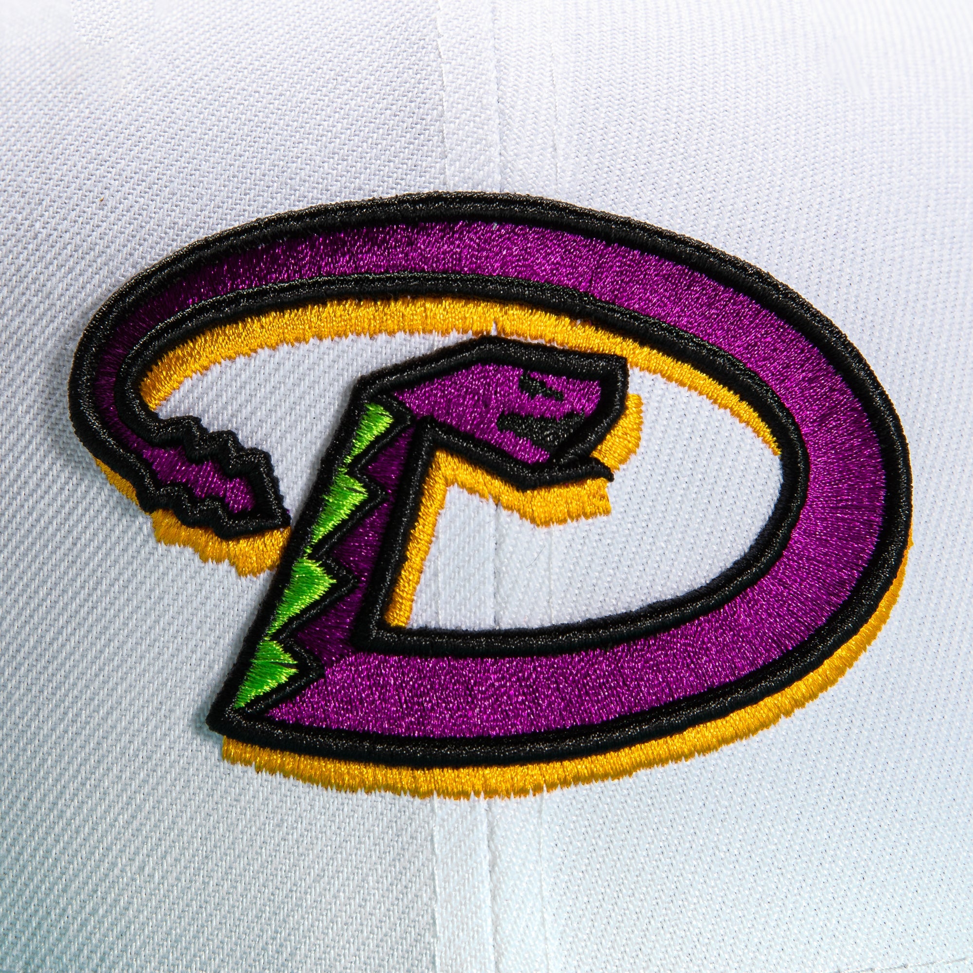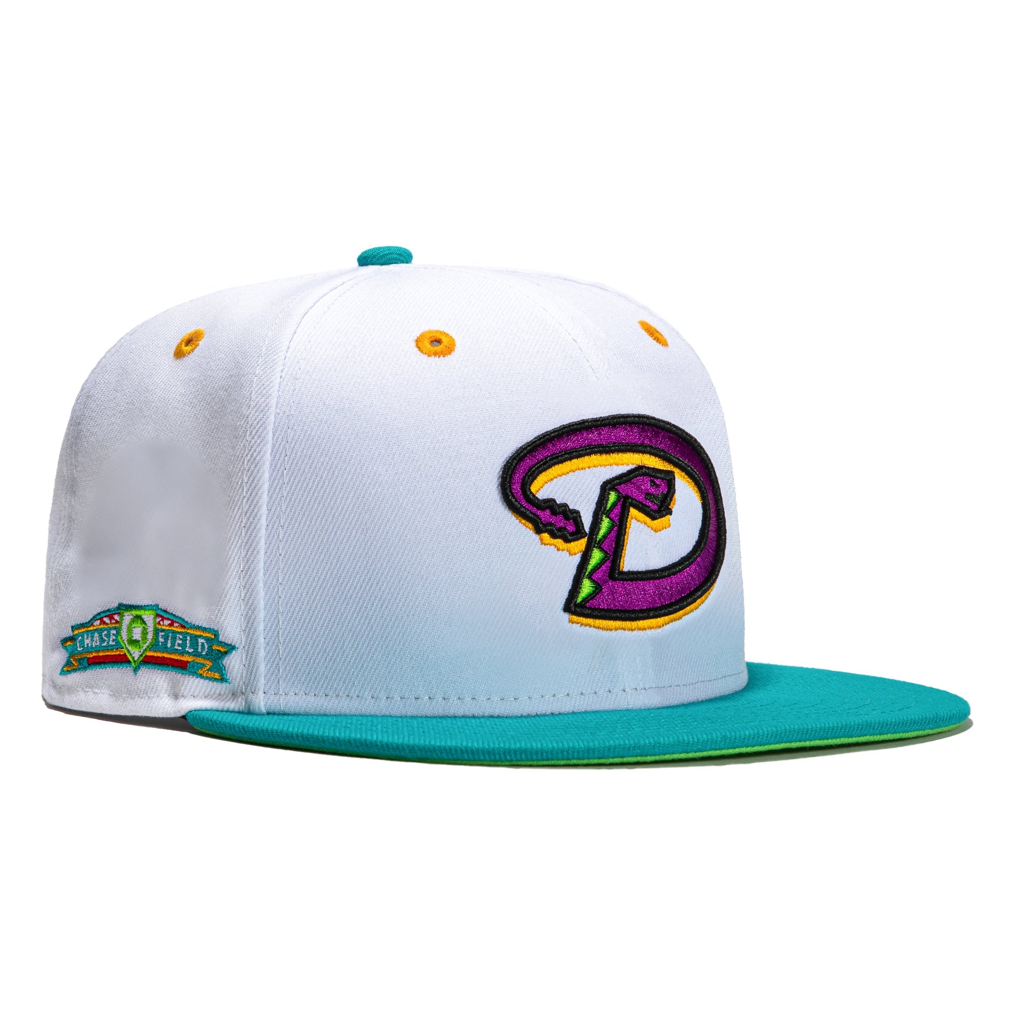 This New Era Dogtown Arizona Diamondbacks Chase Field 59FIFTY Fitted Hat has a white six panel structured high crown and embroidered eyelets with a teal fabric squatchee button. The fitted cap has a teal flat bill with a lime green undervisor. The front panel features the Arizona Diamondbacks logo embroidery and a side patch embroidery on the right panel. The left panel of the fitted displays the New Era logo and the official MLB logo embroidery on the rear crown.