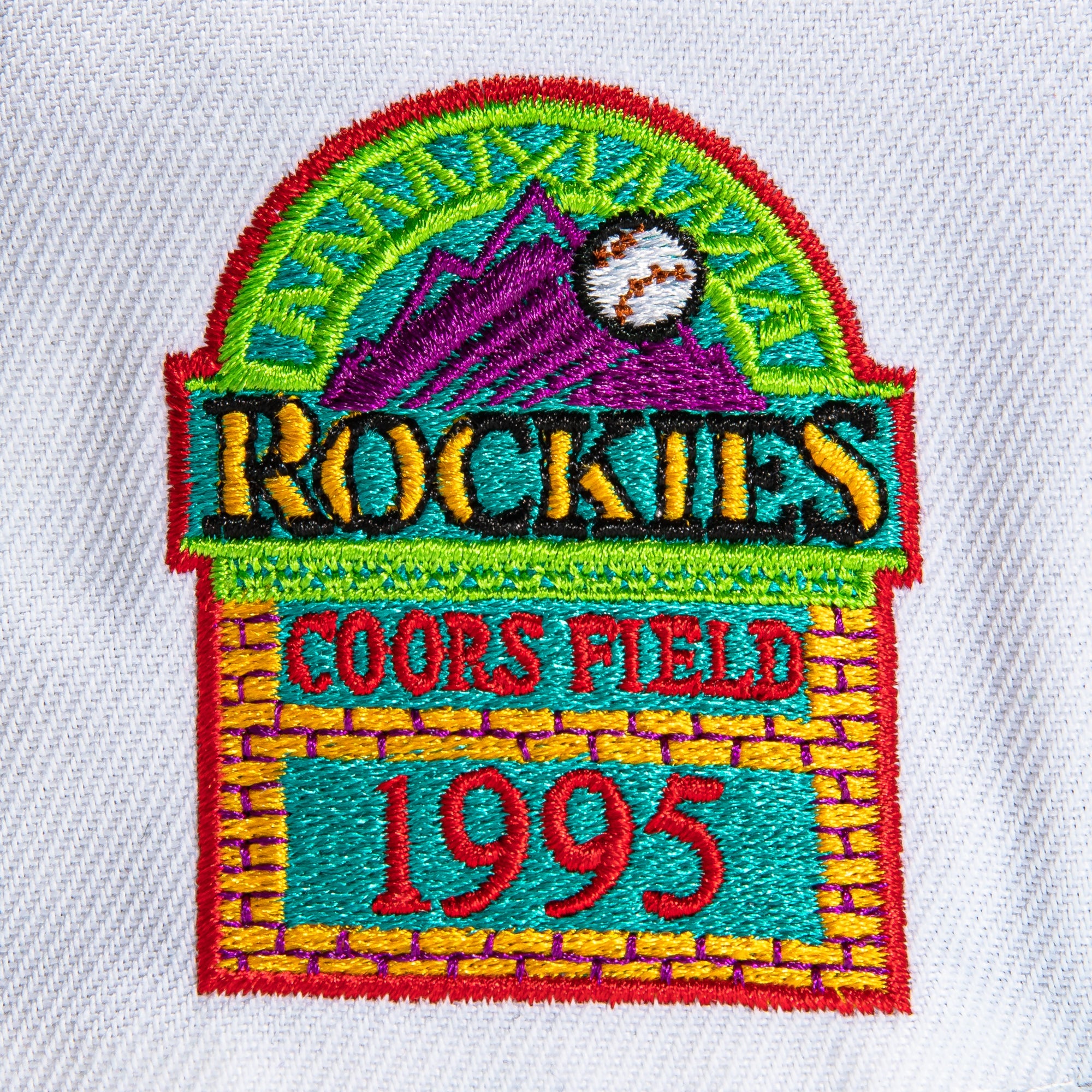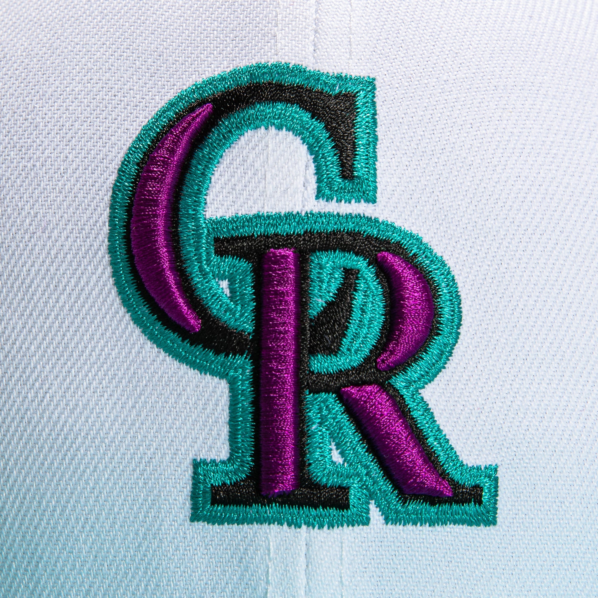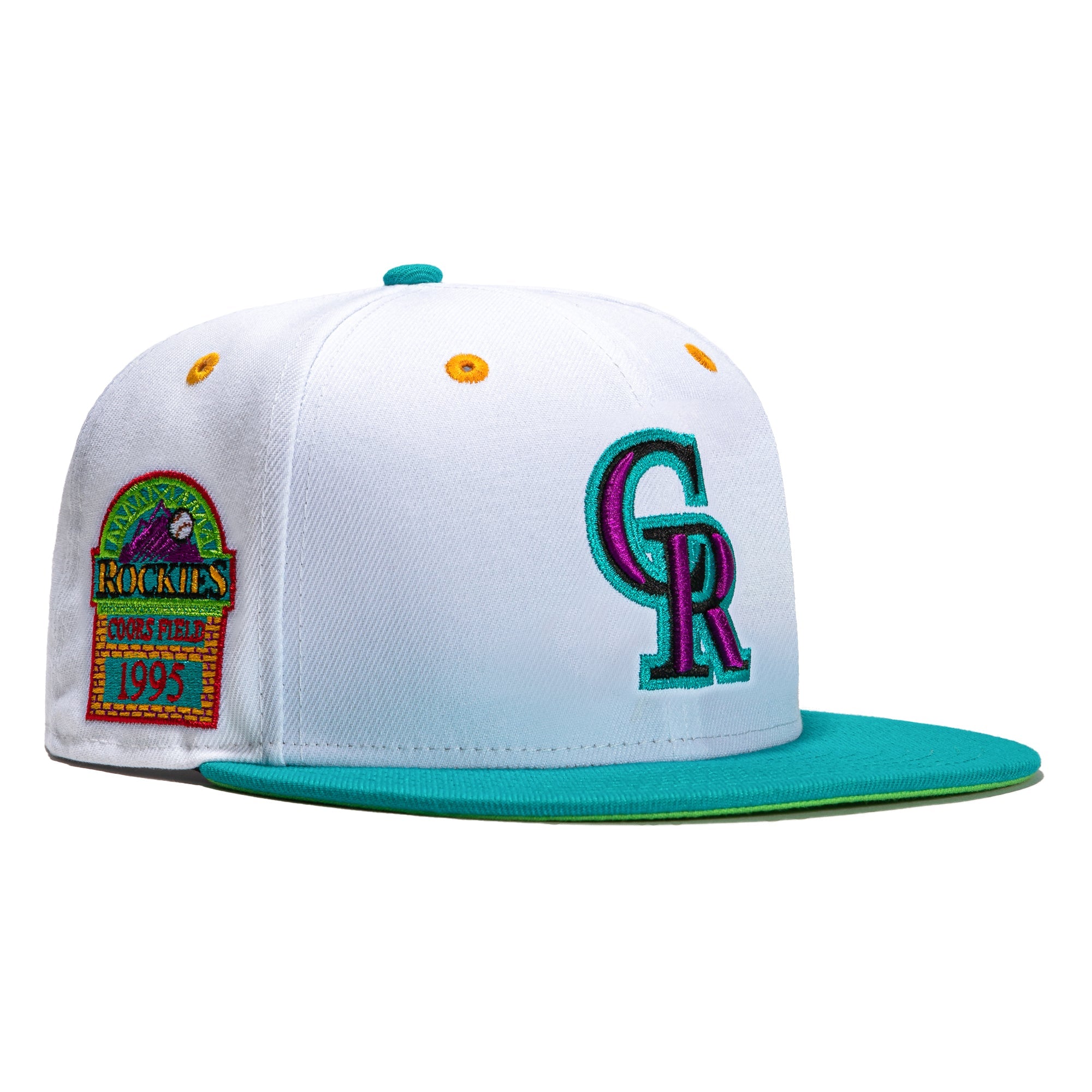 This New Era Dogtown Colorado Rockies Inaugural 59FIFTY Fitted Hat has a white six panel structured high crown and embroidered eyelets with a teal fabric squatchee button. The fitted cap has a teal flat bill with a lime green undervisor. The front panel features the Colorado Rockies logo embroidery and a side patch embroidery on the right panel. The left panel of the fitted displays the New Era logo and the official MLB logo embroidery on the rear crown.