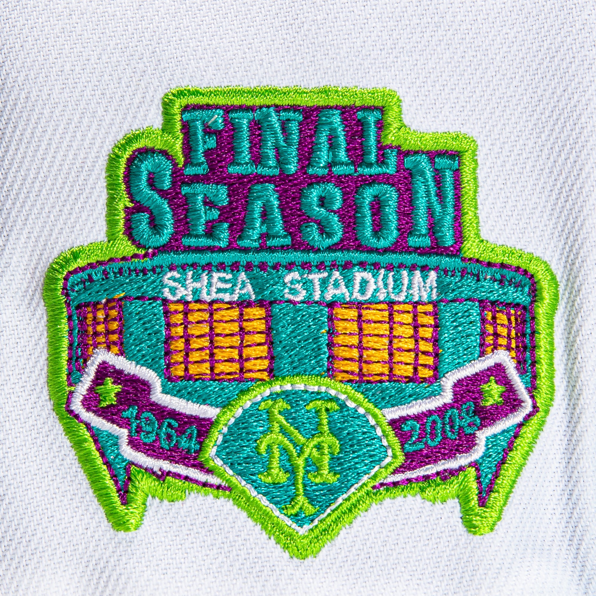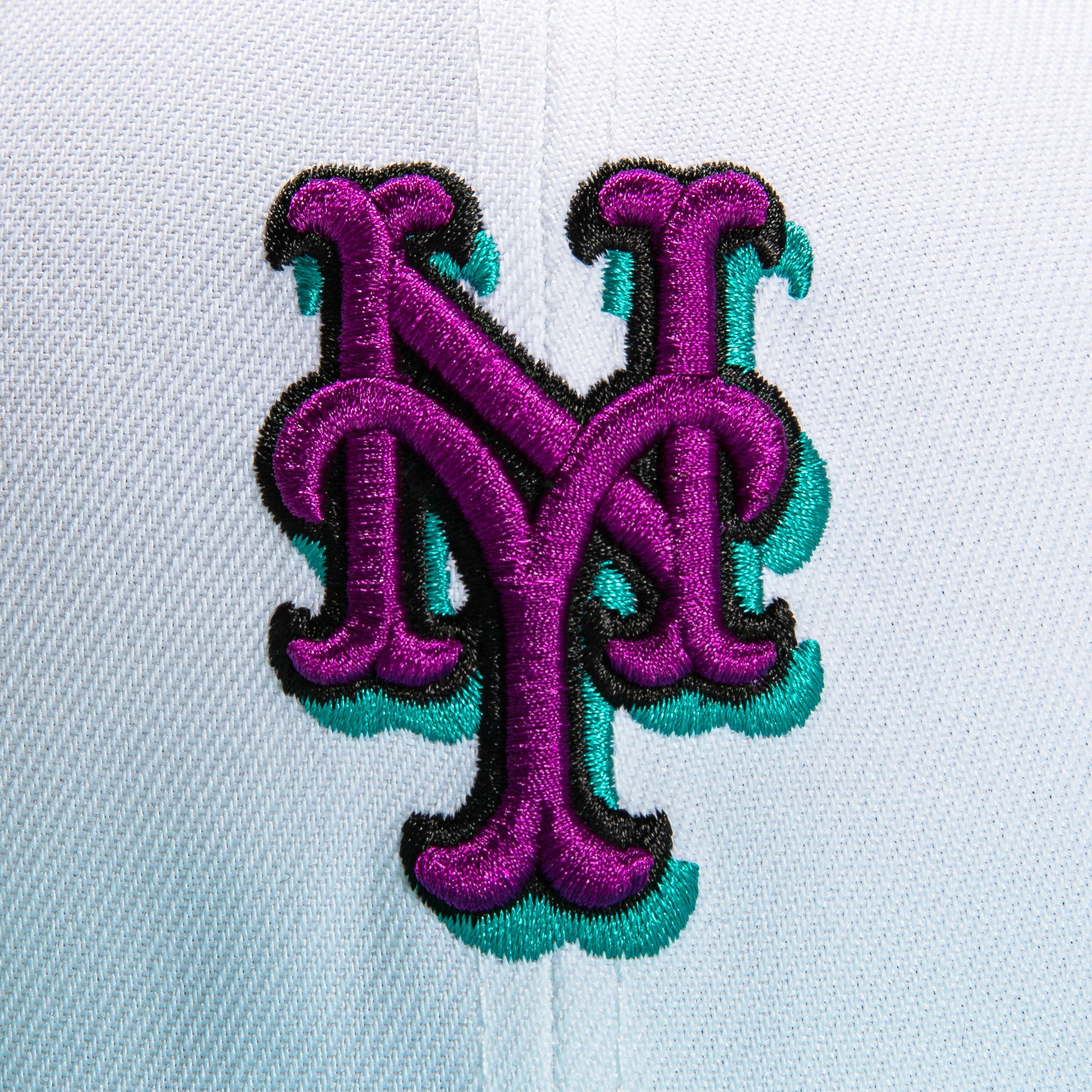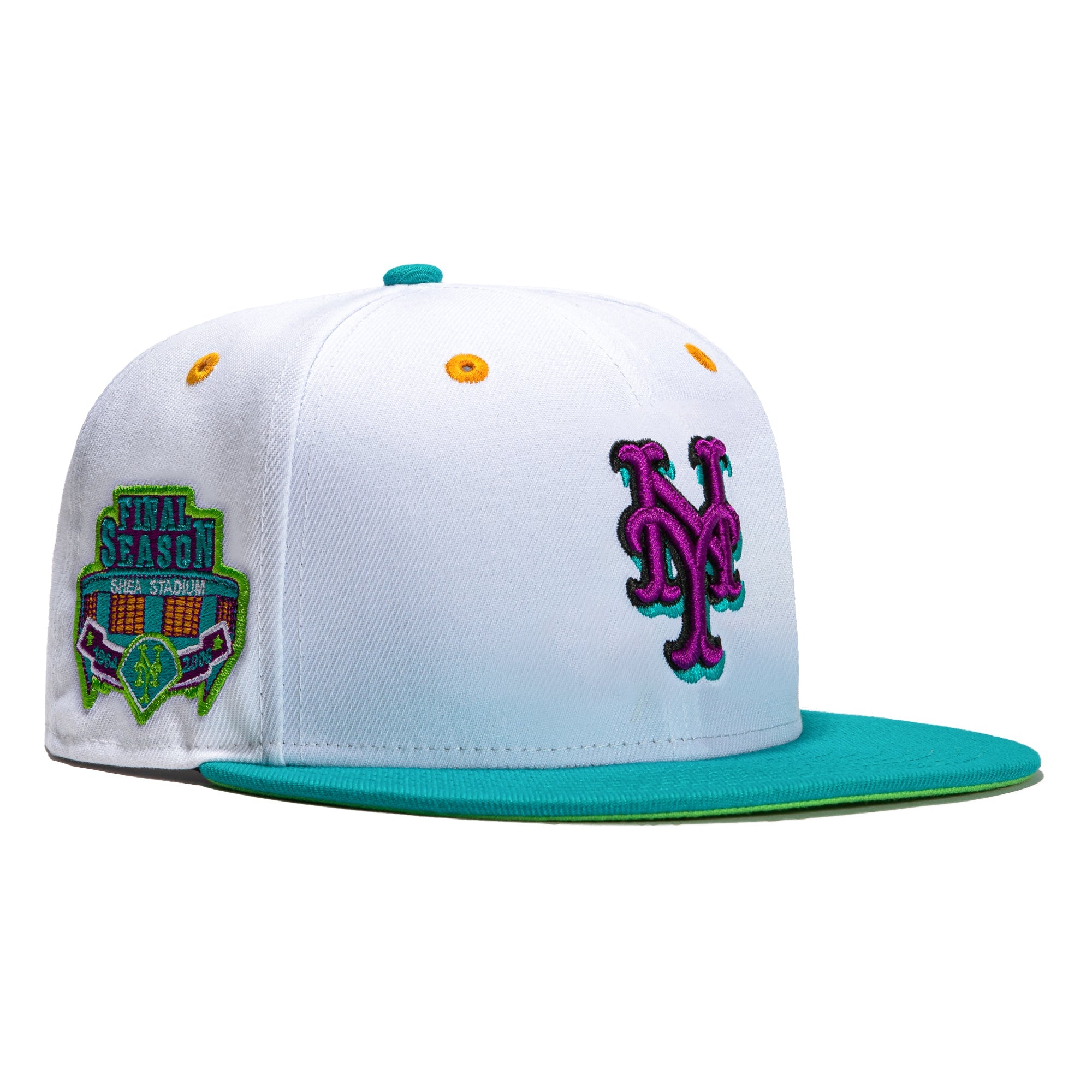 This New Era Dogtown New York Mets Final Season 59FIFTY Fitted Hat has a white six panel structured high crown and embroidered eyelets with a teal fabric squatchee button. The fitted cap has a teal flat bill with a lime green undervisor. The front panel features the New York Mets logo embroidery and a  side patch embroidery on the right panel. The left panel of the fitted displays the New Era logo and the official MLB logo embroidery on the rear crown.